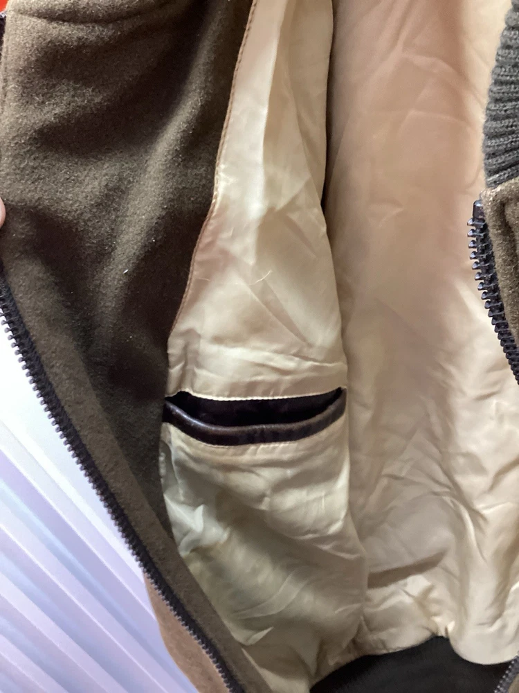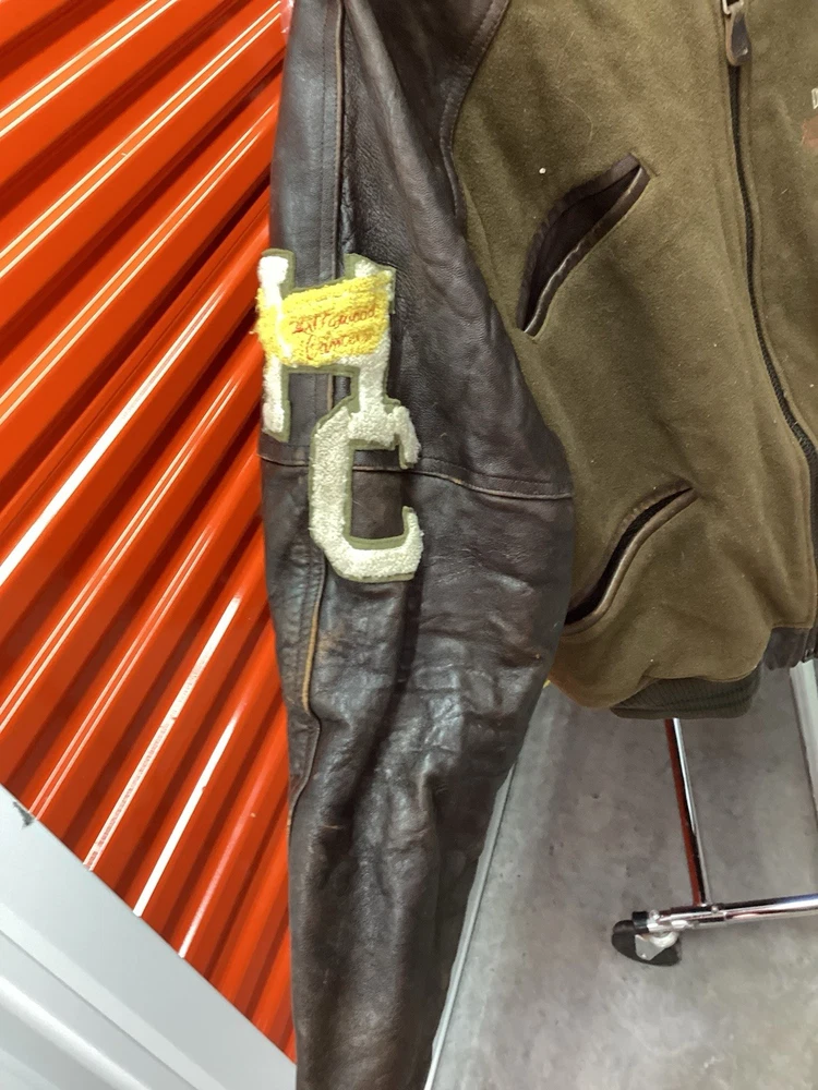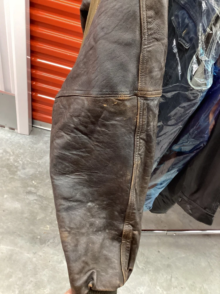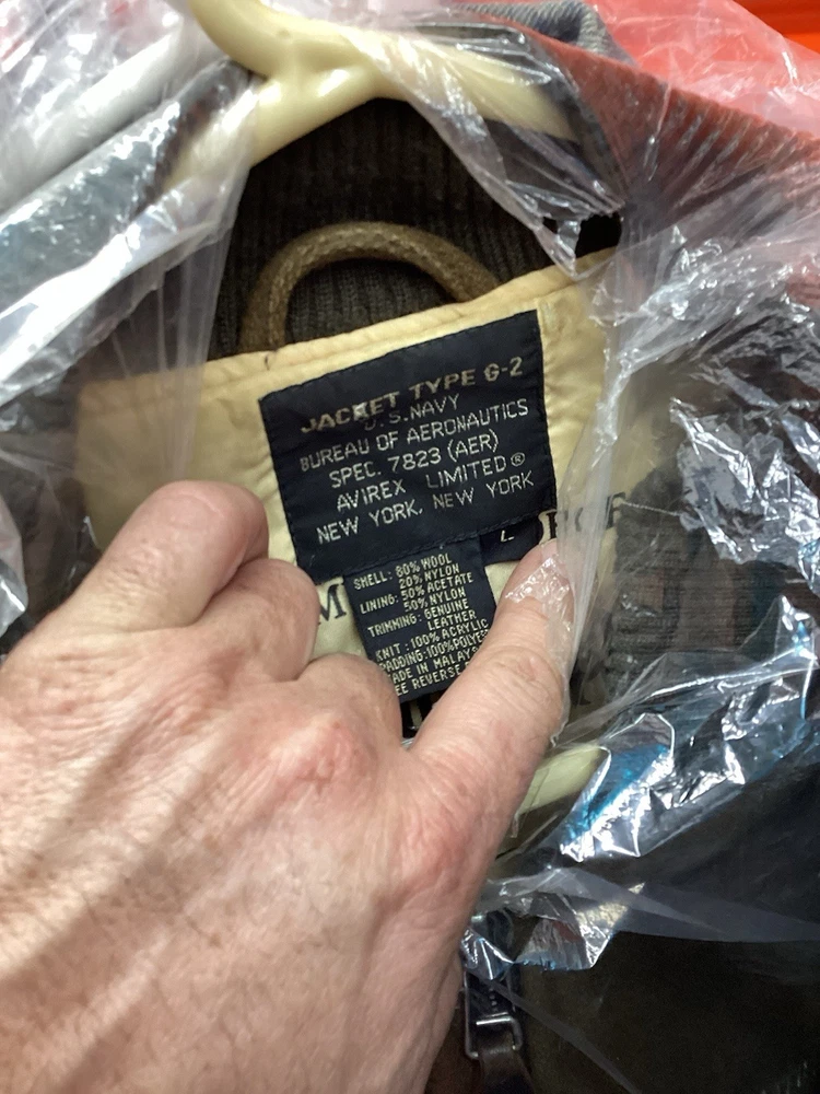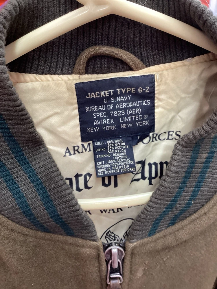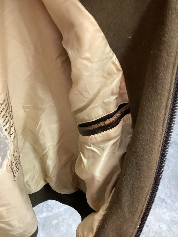 Vintage AVIREX Distressed US Navy Jacket Leather Wool Bomber Hollywood Canteen size L. Show signs of wear. Has some stains in front , rear and some on sleeves. See pictures for condition.