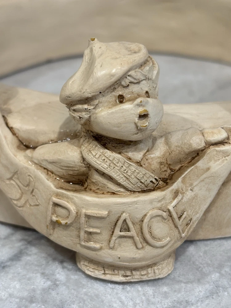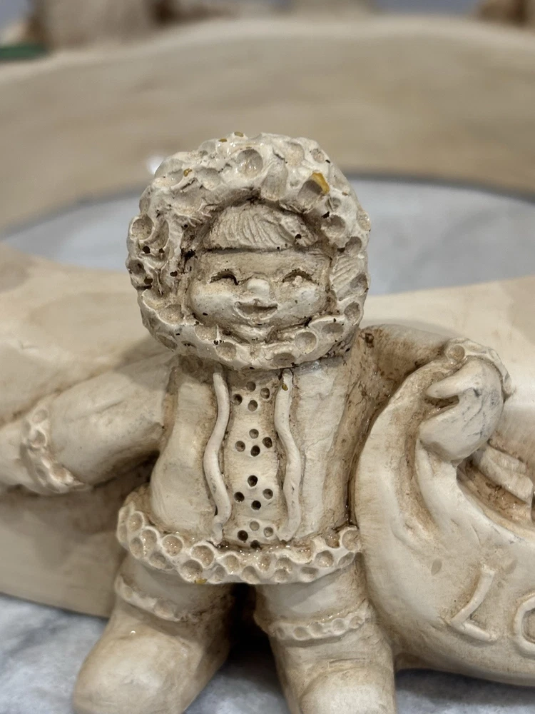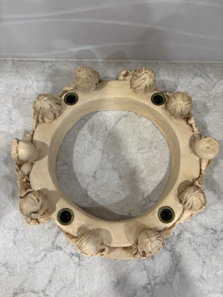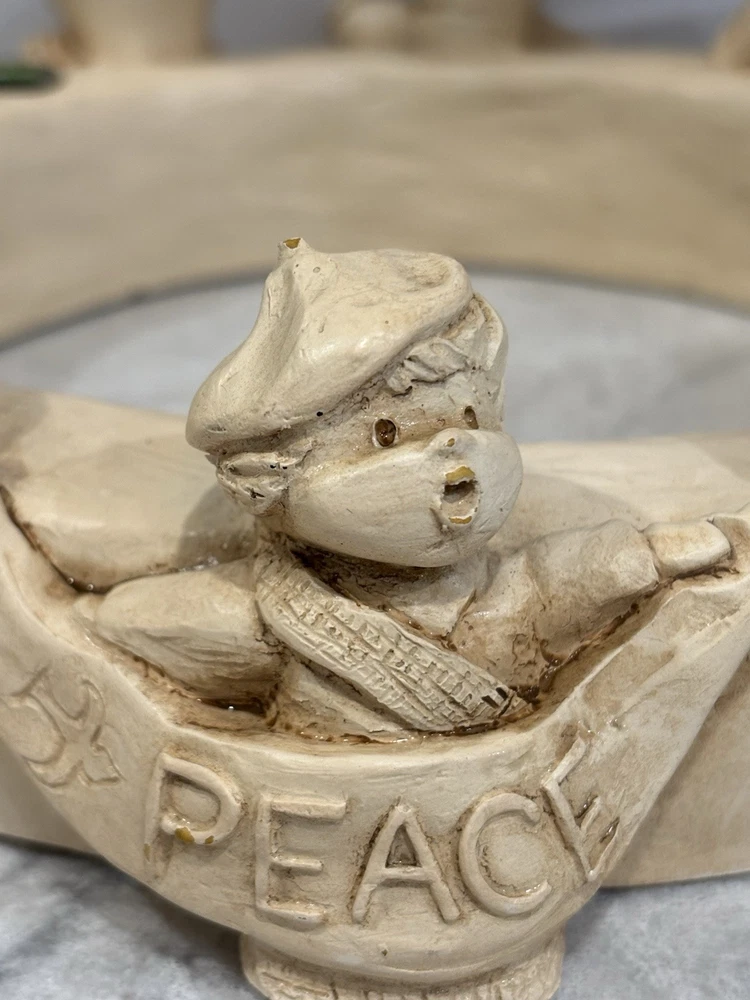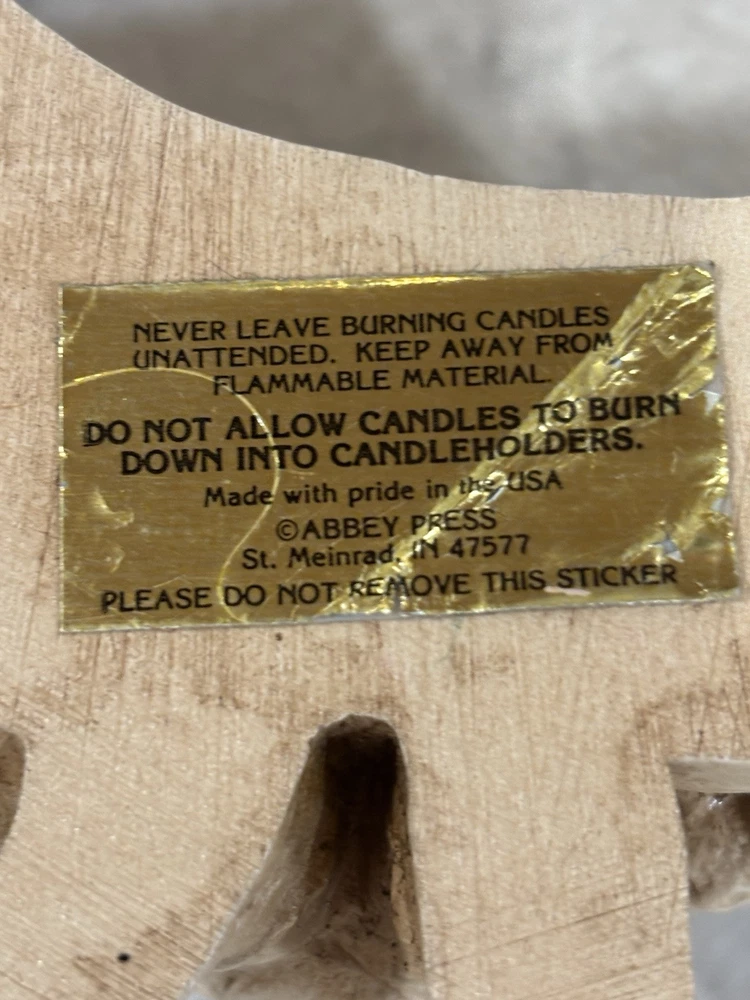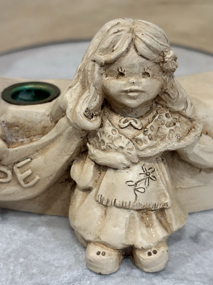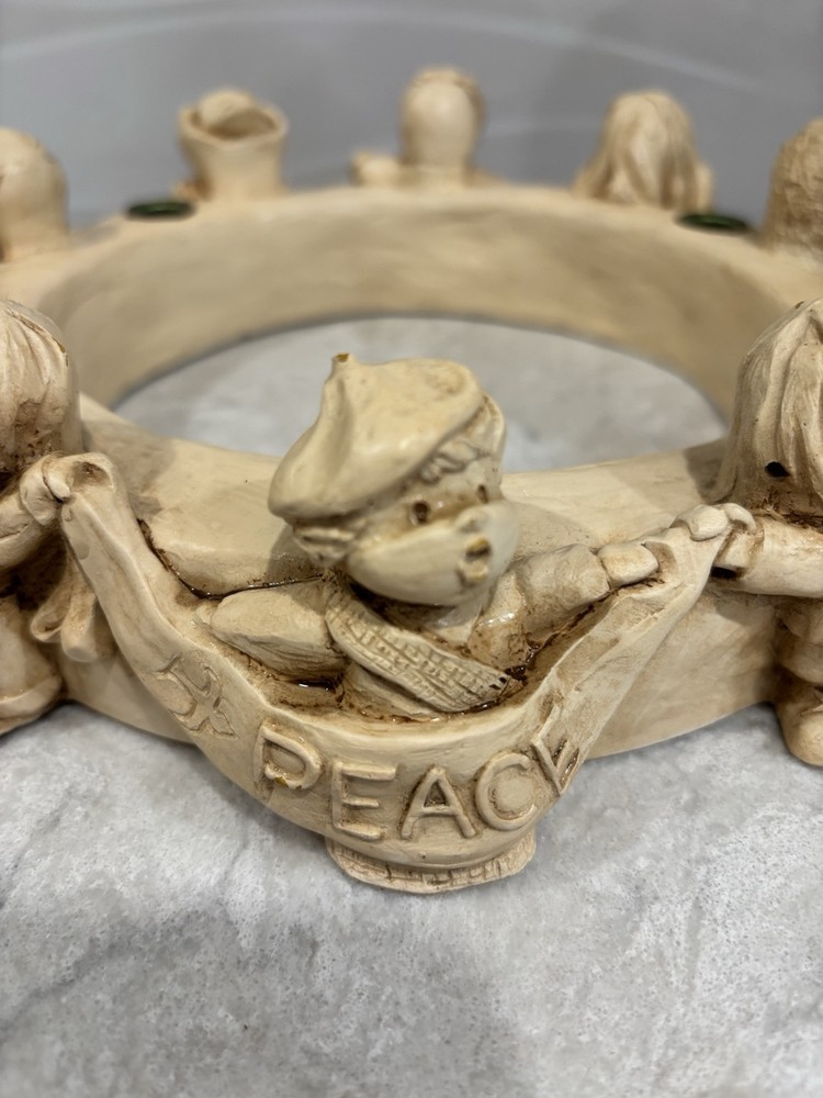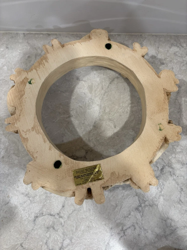 Vintage advent wreath candle holder. The wreath has 10 children from around the world with signs reading Love, Joy, Hope, and Peace. It was made in the USA bt Abbey Press. Its diameter measures approximately 10” and is about 3” in height. It has the look of wood but is is a resin like material. Preowned. Good condition.