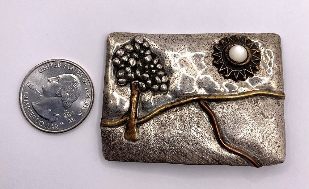 This Vintage Sterling silver art Abstract Landscape Tree & Sun Pin Brooch is a unique and elegant piece of jewelry that captures the beauty of nature and art. Made with sterling silver and featuring a rectangular shape, this brooch showcases intricate details of a tree and sun design. Perfect for those who appreciate vintage pieces and enjoy making a statement with their accessories. Its silver color adds a touch of sophistication to any outfit, making it a versatile and eye-catching addition to any jewelry collection. We combine shipping.
