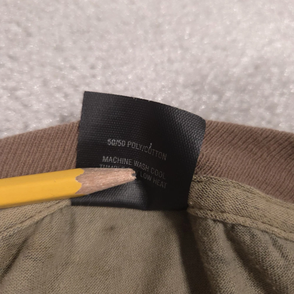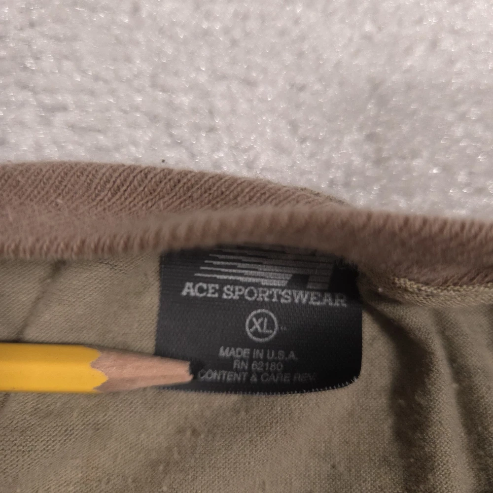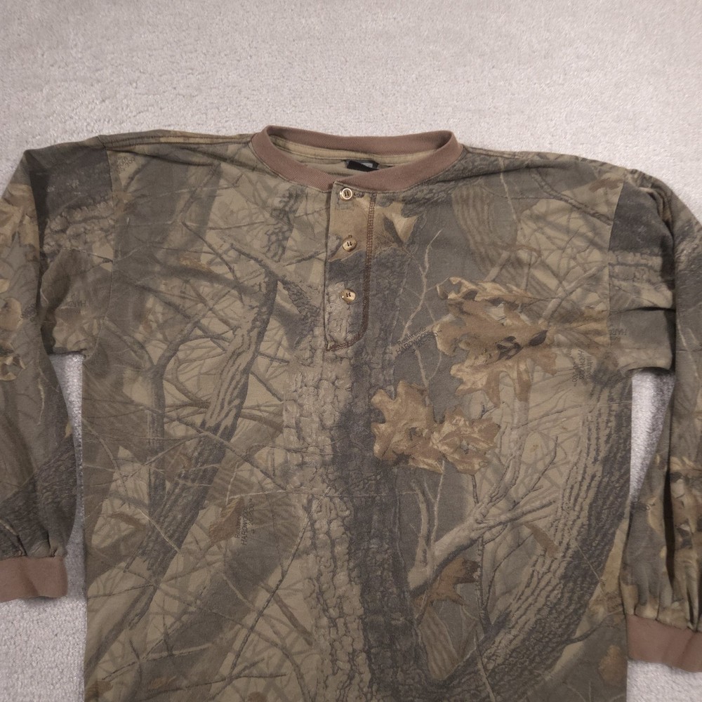 Vintage Ace Sportswear Shirt Mens XL Brown Realtree Camo Henley Long Sleeve USA Pre-owned Ace Sportswear mens henley shirt with fabric clean and structurally intact across front, back, and sleeves. Material shows overall wash wear throughout, light fading to the camo print, and a few small faint spots near the lower front and hem as pictured. Ribbed collar, cuffs, buttons, and hems remain secure and functional; interior neck and care tags present but no original retail tags or packaging included. ΔΆBrand: Ace Sportswear Mens long sleeve henley shirt designed for hunting, outdoor layering, and casual everyday wear. Color and pattern: Brown and olive Realtree HARDWOODS 2000 woodland camouflage featuring tree bark, branches, and oak leaves across the entire garment. Design details: Three-button henley placket, ribbed crew neckline in solid brown, long sleeves with ribbed cuffs, and a straight bottom hem. Fabric and feel: 50/50 poly/cotton knit intended to feel soft, breathable, and comfortable for all-season layering in the field or around town. Fit and sizing: Interior neck tag indicates Mens size XL with a regular T-shirt style fit through the chest and body suitable for wearing over a base layer. Branding and tags: Woven black Ace Sportswear neck label reading ACE SPORTSWEAR XL MADE IN U.S.A. RN 62180 with separate care tag noting 50/50 POLY/COTTON and machine wash instructions; Realtree HARDWOODS 2000 logos printed within the camouflage pattern. Use occasions: Suitable for deer season, turkey hunting, scouting, hiking, camping, or casual outdoor wear during fall, winter, and spring. Condition notes: See the condition section for details. BoxbigD005