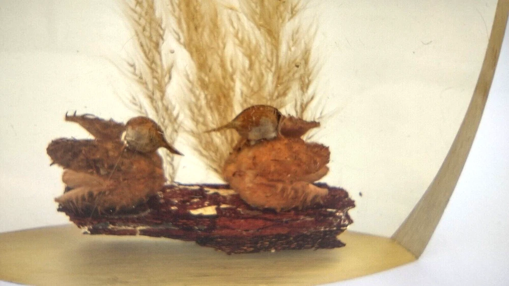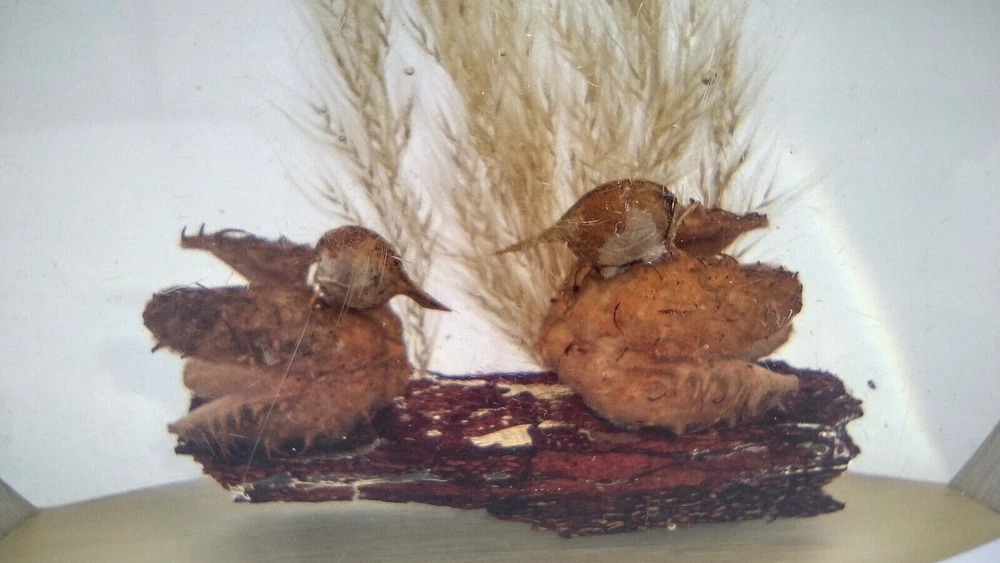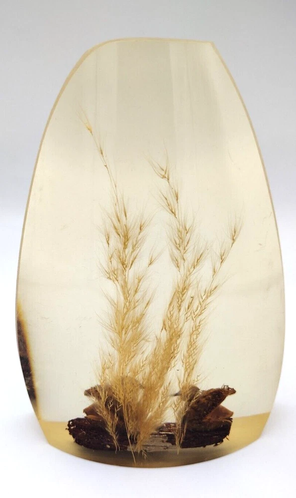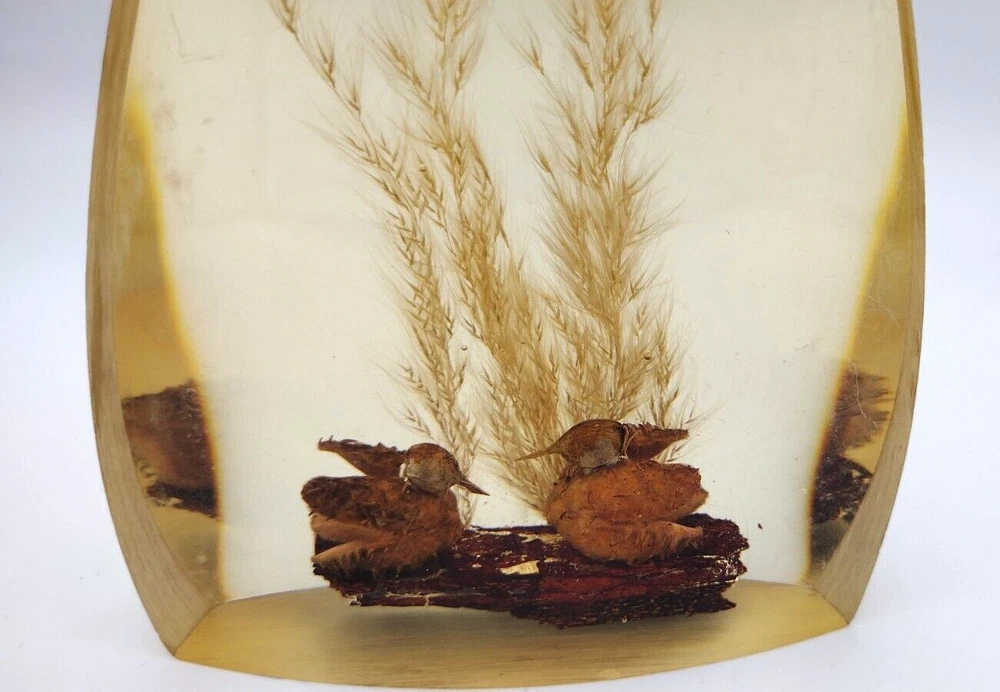 This handmade acrylic/resin paperweight measures 5.5" in height, 4" in width and its widest, and 1.5" at its thickest. It has a seed pod made into the shapes of ducks sitting on a piece of bark (log) with a 'wheat' talk in the background. Shipped with USPS Ground Mail. St