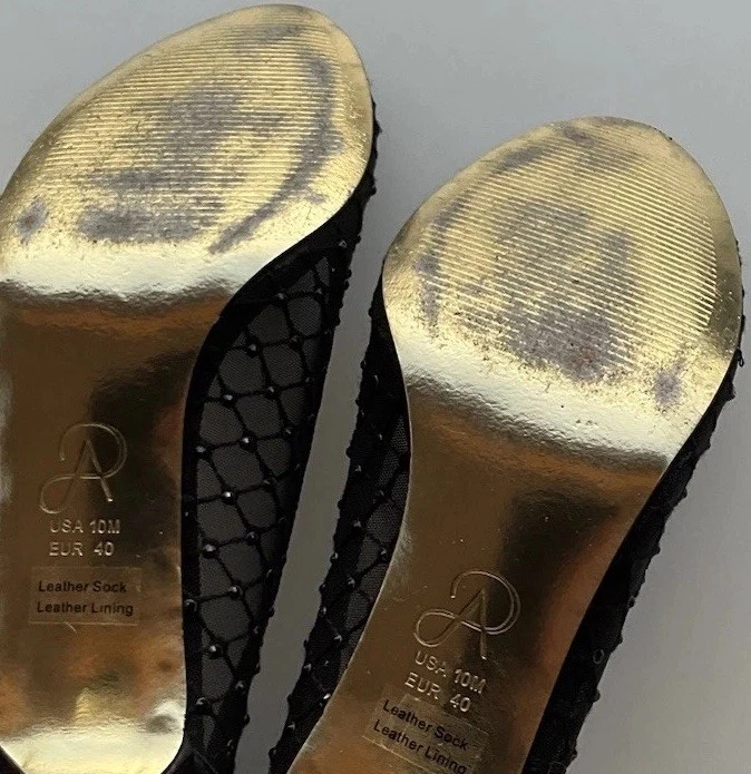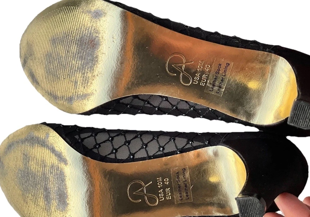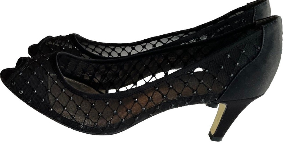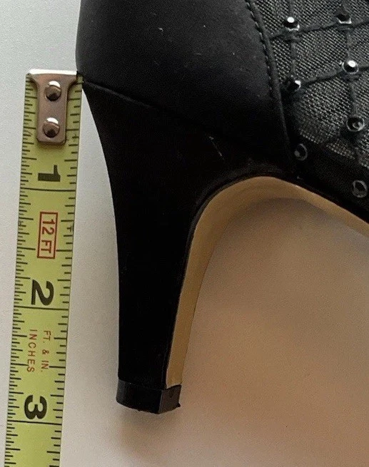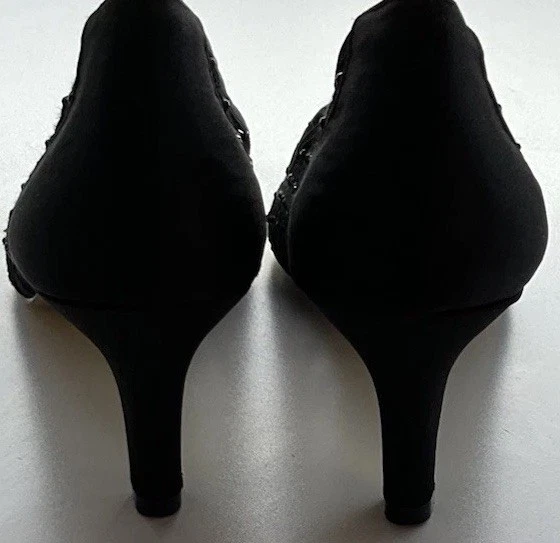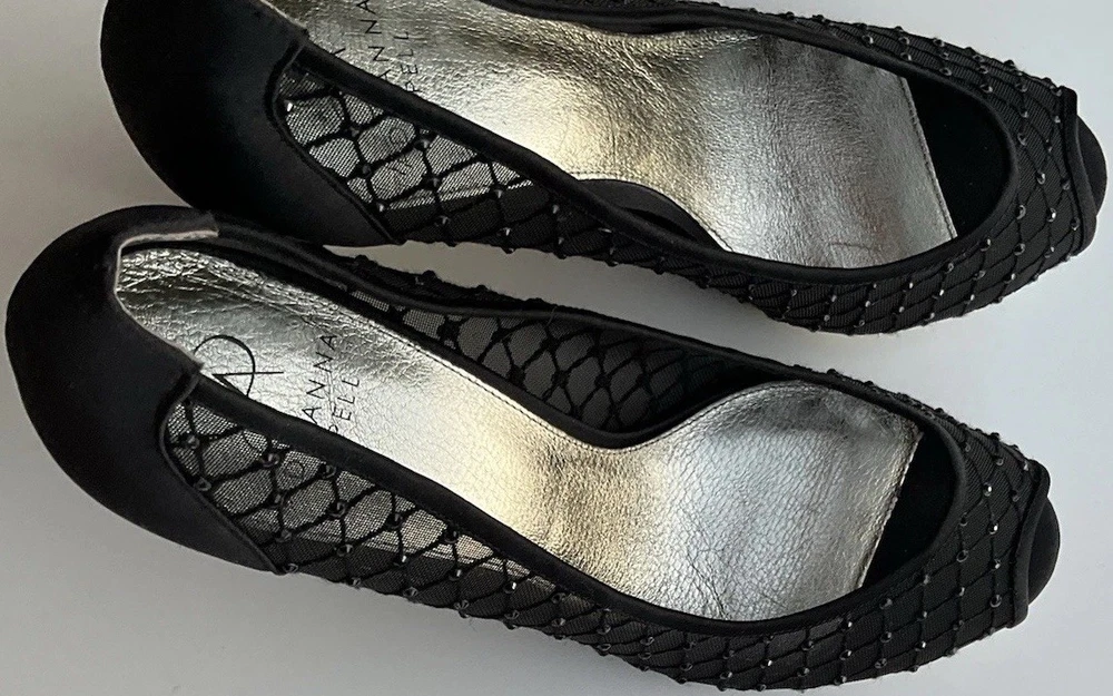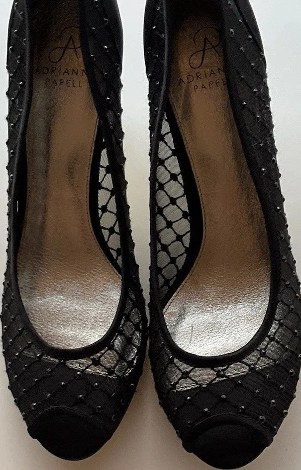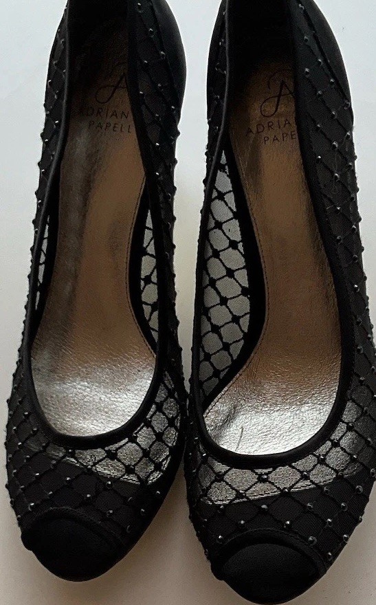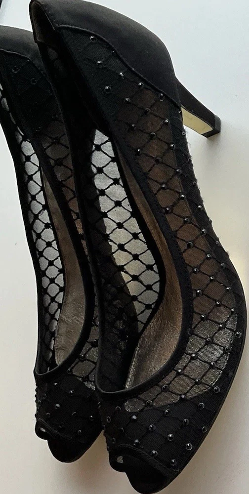 These Vintage Adrianna Papell Black Bedazzled Peep Toe Heels in Women's Size 10 exude a sophisticated and elegant charm. Made of leather with a classic peep toe design, these pumps are perfect for a variety of occasions such as weddings, formal events, or professional settings. The bedazzled detailing adds a touch of glamour, making them a timeless addition to any wardrobe. Perfect for those who appreciate vintage style and classic design with a hint of bohemian or Victorian flair.