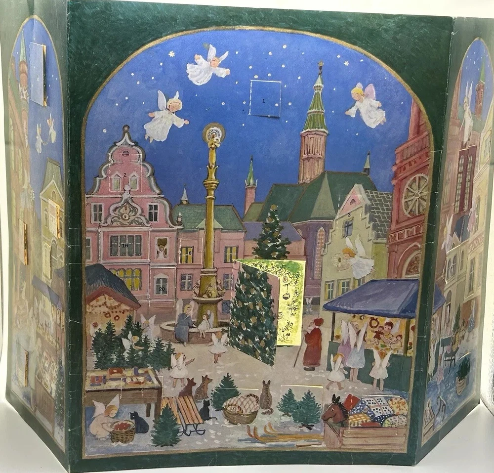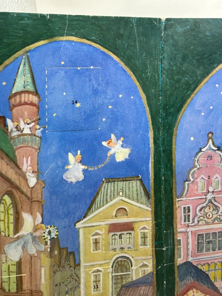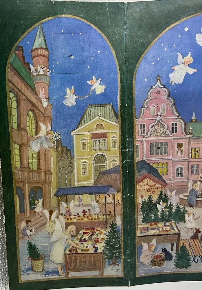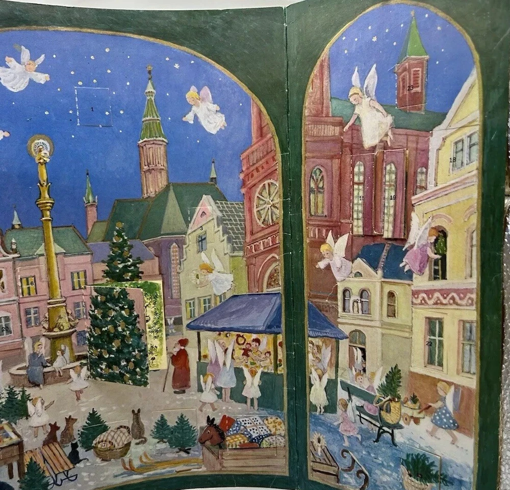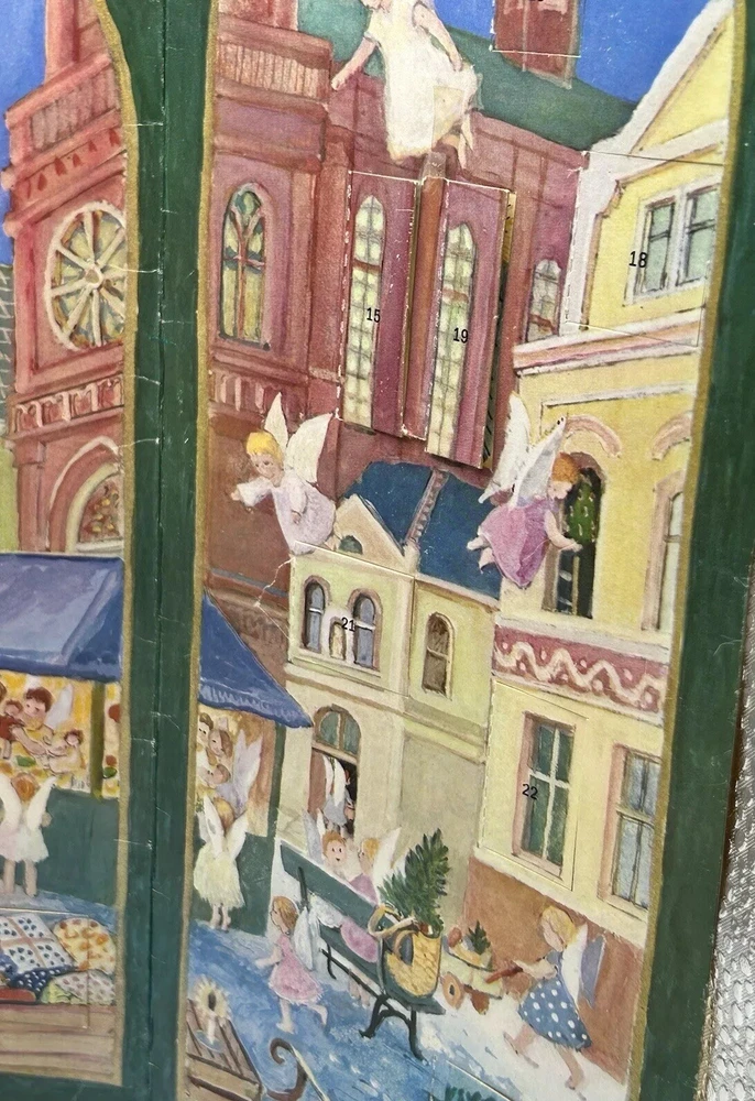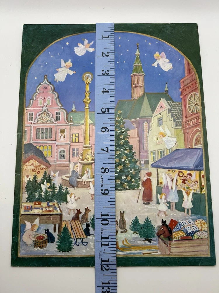 Vintage Advent Calendar By Ediciones Cimera Printed In Spain K 6413 This beautiful calendar is in nice used condition with some creases and a few small tears. It measures 12" x 9 1/4" closed and 19 3/4" x 12" open. Please see photos for details. Please let me know if you have any questions. I use recycled materials in shipping whenever possible. Measurements are approximate. Smoke free home.