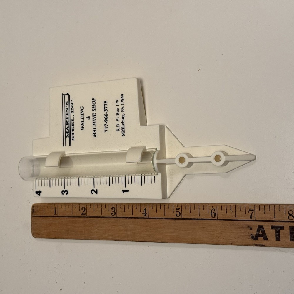 vintage plastic advertising rain gauge featuring Martin’s Steel, Inc. – Welding & Machine Shop of Mifflinburg, Pennsylvania. This is a classic promotional piece made by MORCO (USA), a well-known manufacturer of mid-century rain gauges and garden advertising items. 📏 Details: • Approx. 7 inches tall • Made in USA • Manufacturer marked MORCO USA • Clear removable measuring tube • Measures up to approx. 4 inches of rainfall • Designed to stake into the ground • Lightweight molded plastic construction 🕰️ Era: Likely 1960s–1980s, based on materials, phone number format, and rural route address. 🌿 Condition: Good vintage condition with age-appropriate wear. Lettering remains legible and displayable. No cracks noted. Please review photos closely as they are part of the description. 🧰 Great For: • Vintage advertising collectors • Pennsylvania / regional memorabilia • Garden, farmhouse, or shed décor • Industrial / machine shop nostalgia • Functional outdoor use or indoor display A neat piece of small-town Americana with real character—both practical and collectible. Please feel free to contact me with any questions — happy to help.