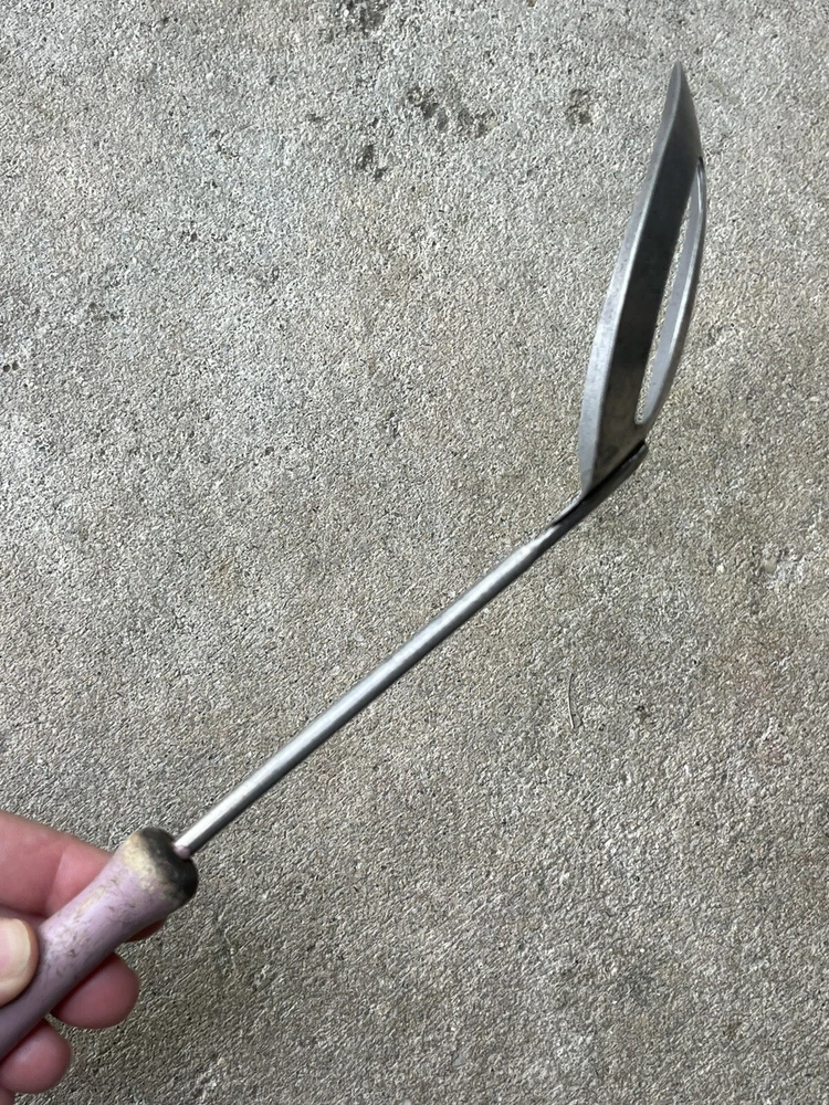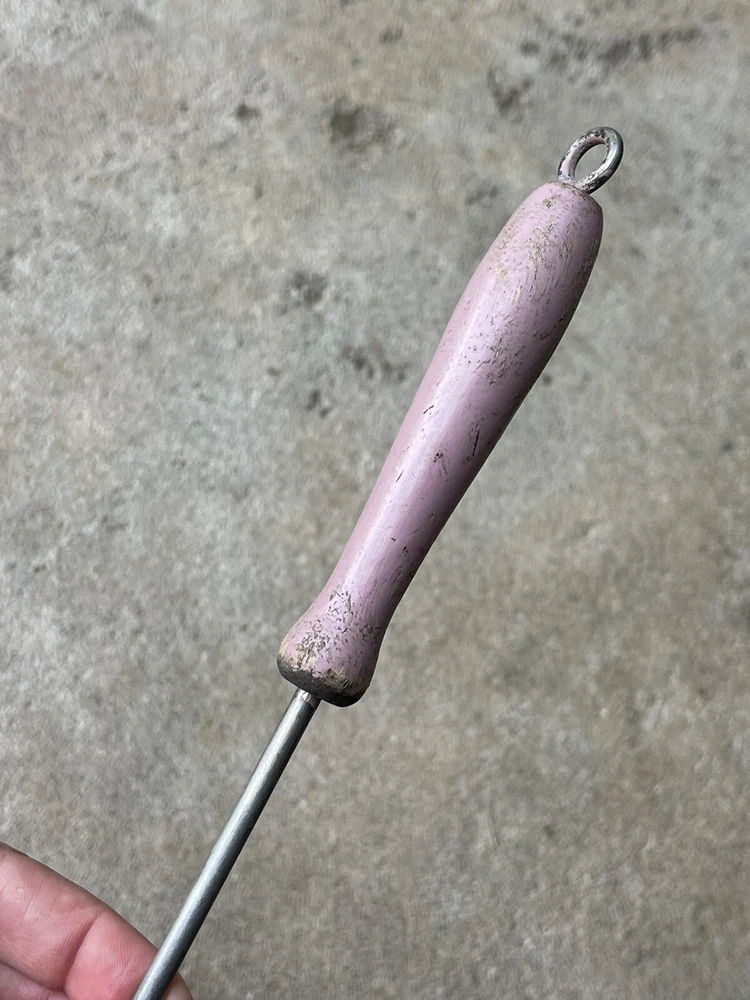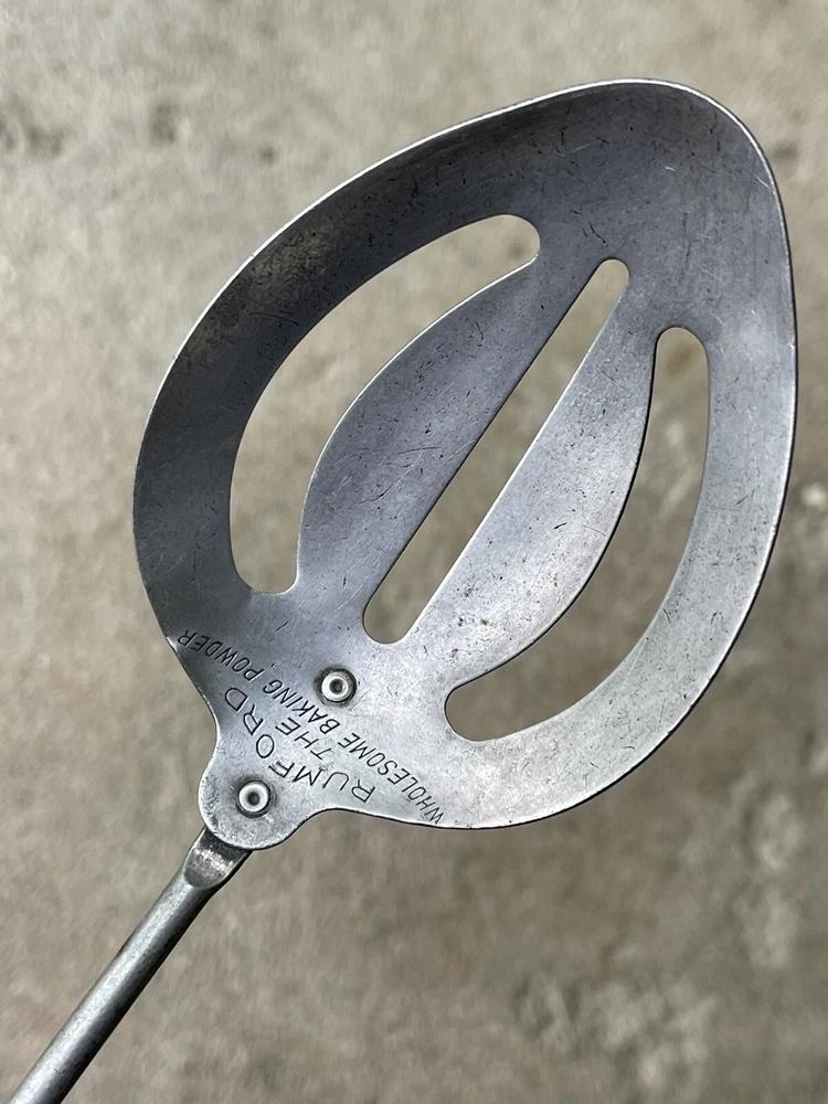 Vintage advertising promotional for RUMFORD baking powder - item used and in top shape / works 100 % as it should - no cracks or damage to wooden handle - spoon in steel with tin plating - nicer version of the usual all steel tools with a wire handle - Rumford liked giving away kitchen tools ( send in box tops or free in a larger bag of product - item measures 11 3/4 long - handle 4 inch - bowl marked RUMFORD THE WHOLESOME BAKING POWDER handle in a lavender color ( not sure if original or someone customized it ) it is old and would scrape off easily to repaint if wished solid and well made for a promo soda