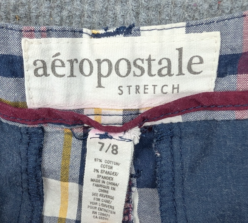 Brand: Aéropostale Type: Casual Shorts Size: 7/8 Color: Blue / White / Red / Yellow Pattern: Plaid Material: 97% Cotton, 3% Spandex Closure: Button & Zip Fly Features: Stretch Fabric, Belt Loops, Side Pockets, Folded Hem Made In: China Condition: Pre-owned, excellent condition with no stains or damage