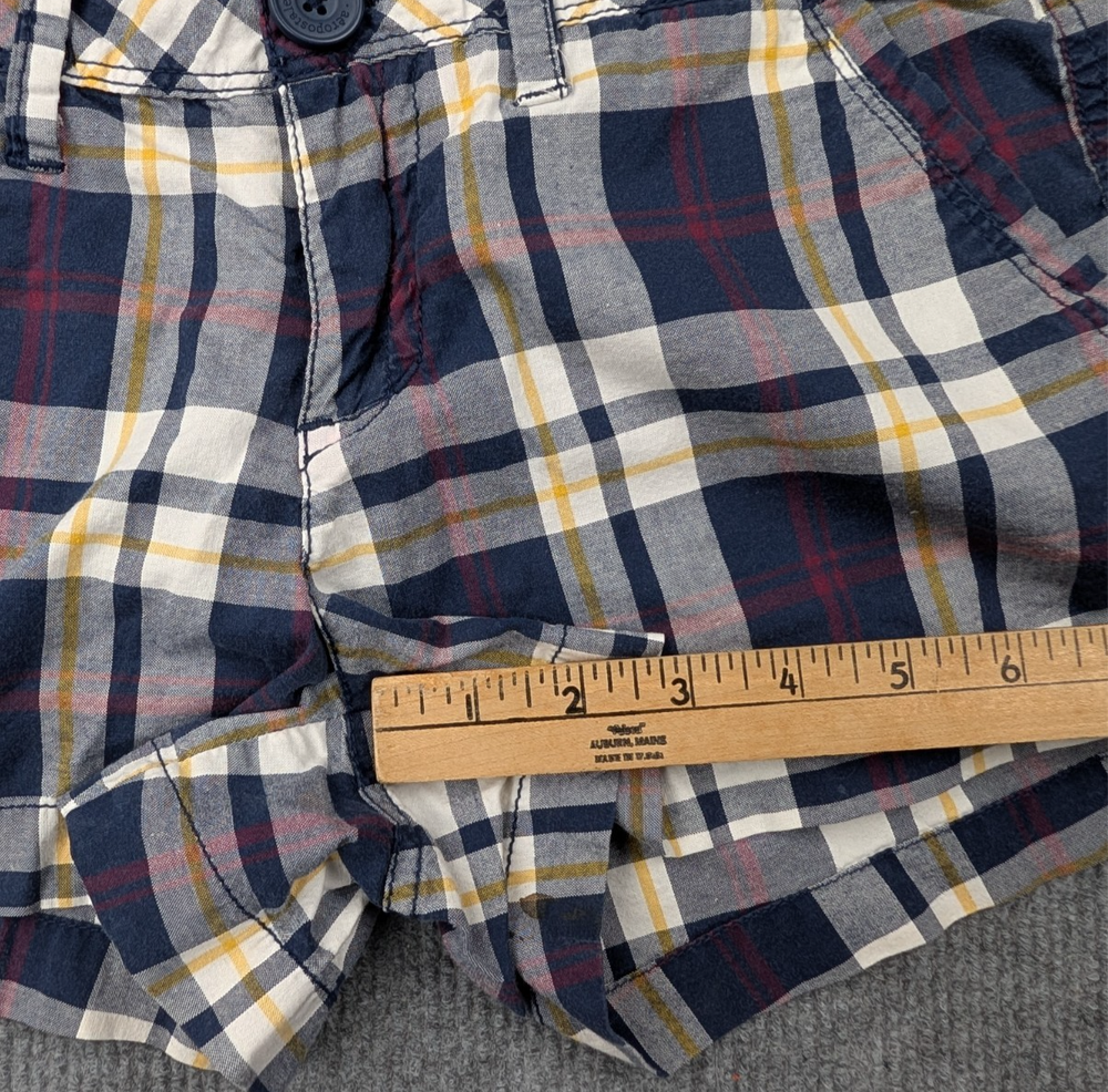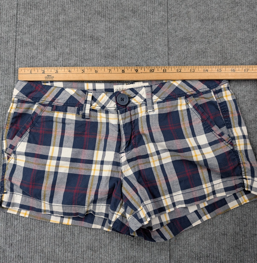 Material: Cotton Handmade: No Rise: Low (6.5-8.5 in) Vintage: No Performance/Activity: Walking Size: 7 Size Type: Regular Department: Women Color: Blue Style: Chino Features: Pockets Occasion: Casual Fit: Regular Closure: Zip Personalize: No Seller Notes: “Pre-owned, excellent condition with no stains or damage” Pattern: Plaid Front Type: Flat Front Pocket Type: 5-Pocket Design Brand: Aéropostale Season: Summer, Spring Garment Care: Machine Washable Theme: Preppy Inseam: 2.5 in