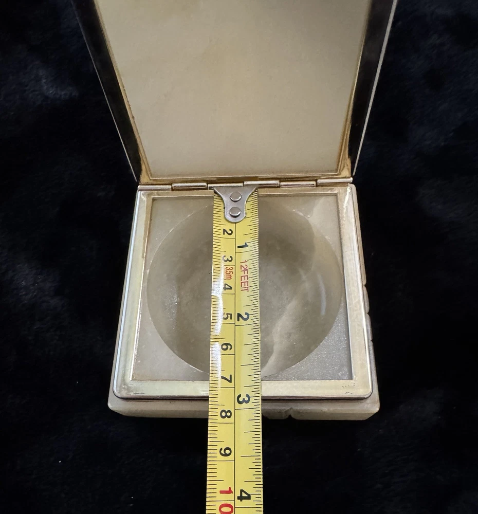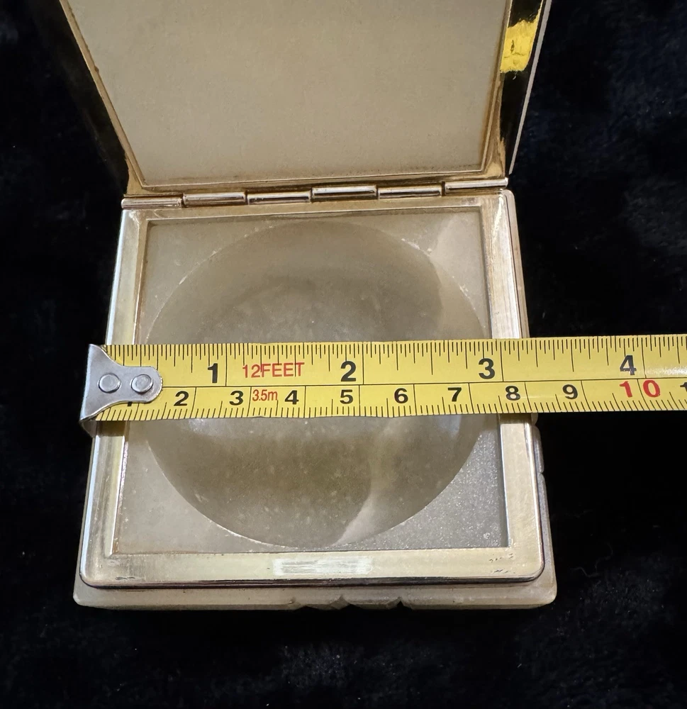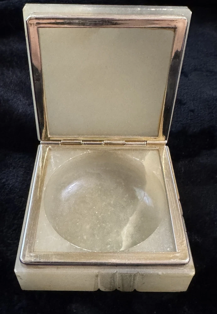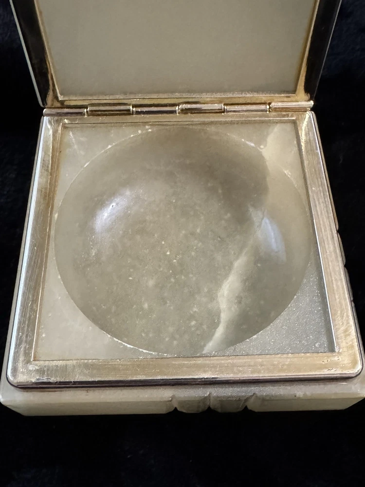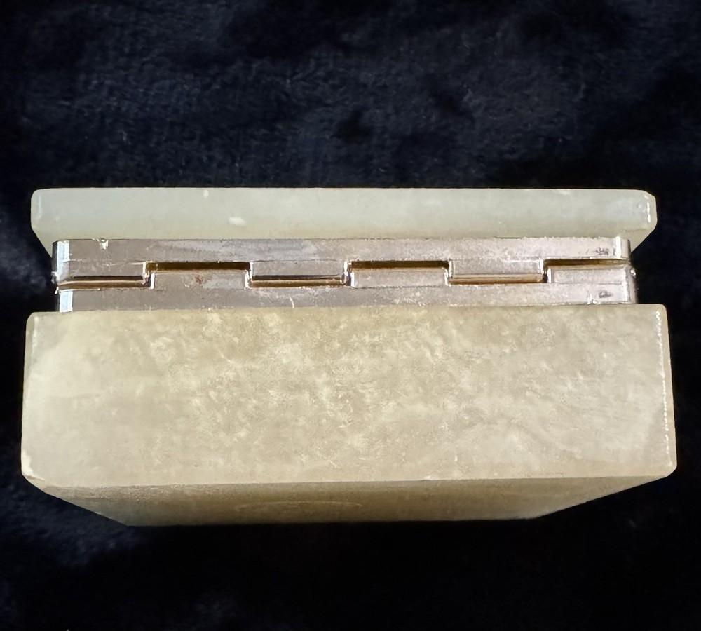 This vintage alabaster hand carved hinged lid jewelry trinket box is a small, rectangular box made in Italy. The box features a beige and gray color with a glossy finish, exuding an Italian style. It falls under the theme of art, retro, and romantic, making it a unique and elegant addition to any collection of decorative collectibles. The box is unboxed and should be cleaned with a damp cloth. Perfect for storing small jewelry items or keepsakes, this trinket box is both functional and visually appealing.