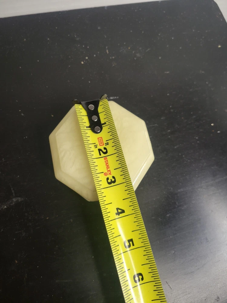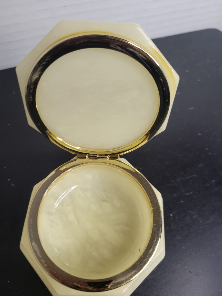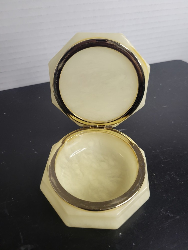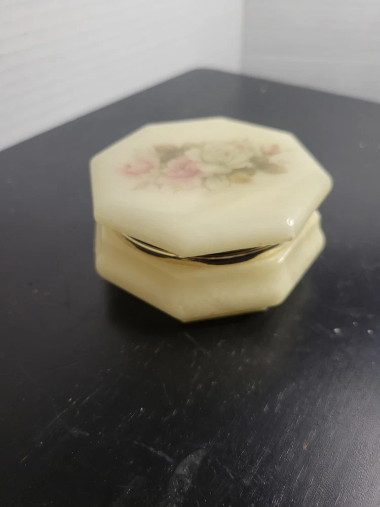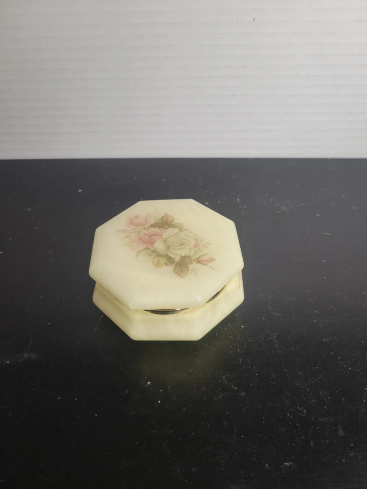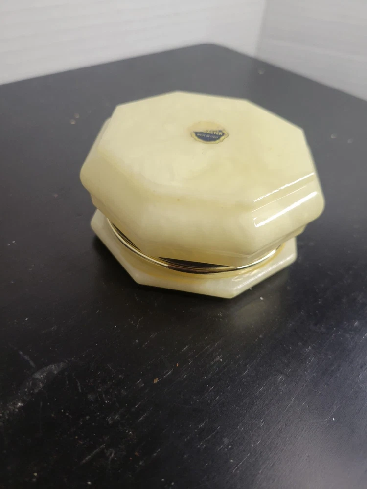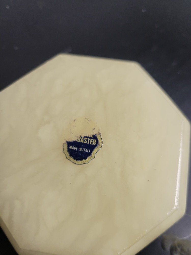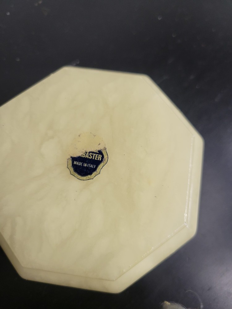 Embrace the charm of Italian craftsmanship with our Vintage Alabaster Trinket Box, complete with a elegant gold trim. The ivory hue of the alabaster coupled with the intricate floral pattern makes this piece a timeless keepsake for any occasion. Its origin from Italy assures the authenticity of its mid-20th-century design, ensuring it's not just a holder but a piece of history. Carefully handmade, this trinket box arrives boxed, making it ready to be a centerpiece in any room. To maintain its luster, a simple wipe with a damp cloth is all it needs. This piece is an original, engraved-free, and customized treasure that promises to add a touch of sophistication to your collection. See all photos for wear and condition.