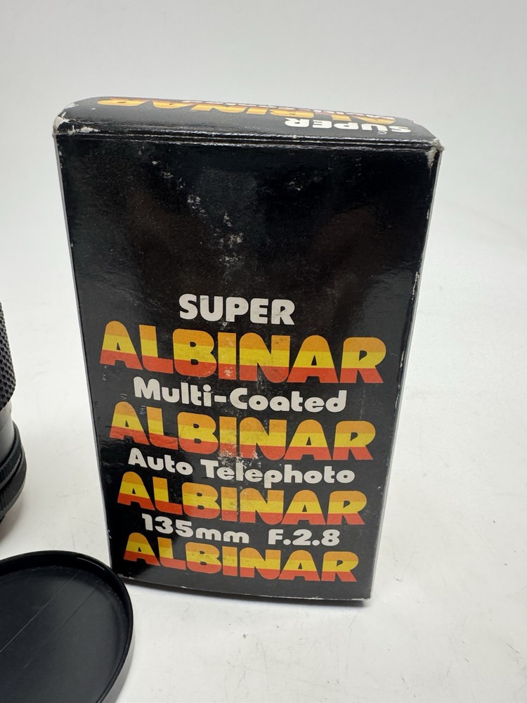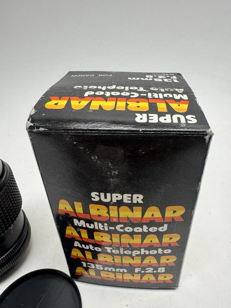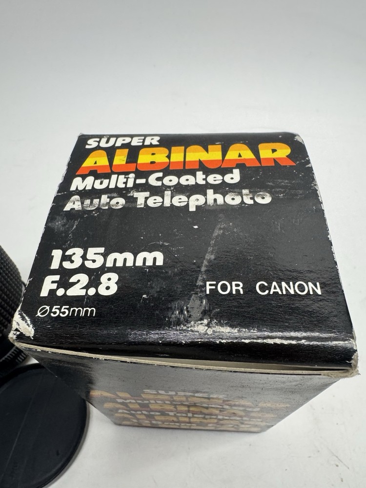 1. Brand: Super Albinar 2. Item Description: Vintage NOS Super Albinar 135MM F 2.8 Auto Telephoto Coated Lens Canon AE JAPAN 3. Condition: This item is NEW condition. There are no sign of use. This item is 100% new condition. The photos are taken on actual item on sale. 4. Color: 5. Included Items : A. Included: original package, B. Not Included: 6. Suggested Retail Price: $ 7. Product Features