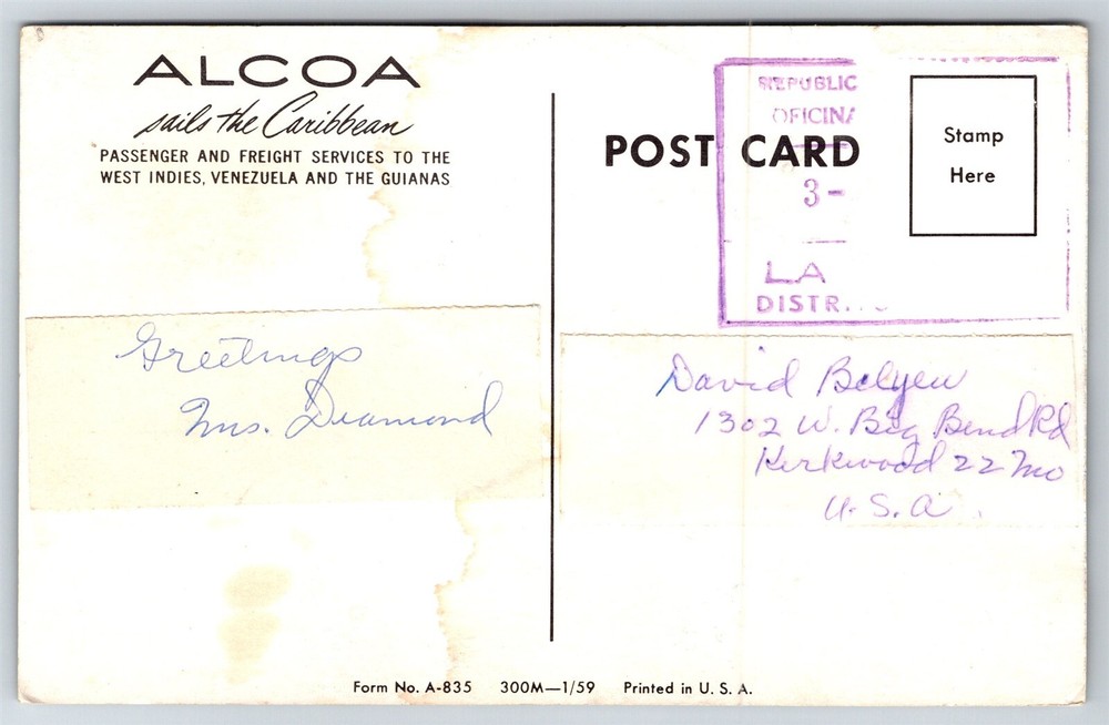 Caribbean Cruise Ship Steamer Alcoa Corsair South America Int'l Postcard L7 Thank you for visiting! This is a standard size postcard, 3.5" X 5.5". In stock, usually ships within 24 hours of your purchase. Please ask questions if you are unsure about anything. Our goal is for your complete satisfaction with the postcard and your experience. Check all my other listings in my store. RETIREDWITHBOOKS Powered by SixBit's eCommerce Solution