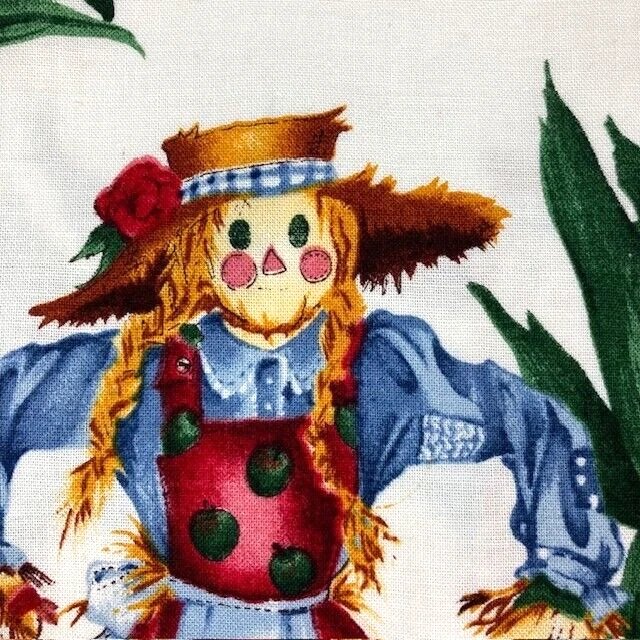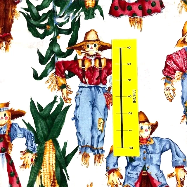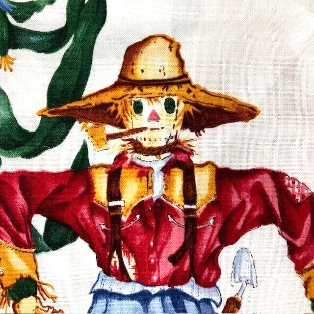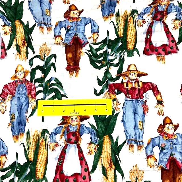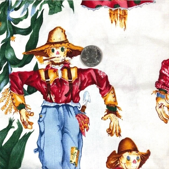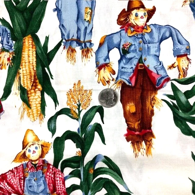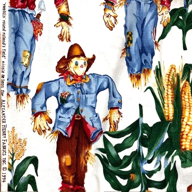 Scarecrows and cornfields on a light background. Designed by Nicole de Leon. 1994 Alexander Henry fabric to quilt or sew! 2 yards 9 inches. From a smoke free environment. Please note, no subcuts or returns on fabric items.