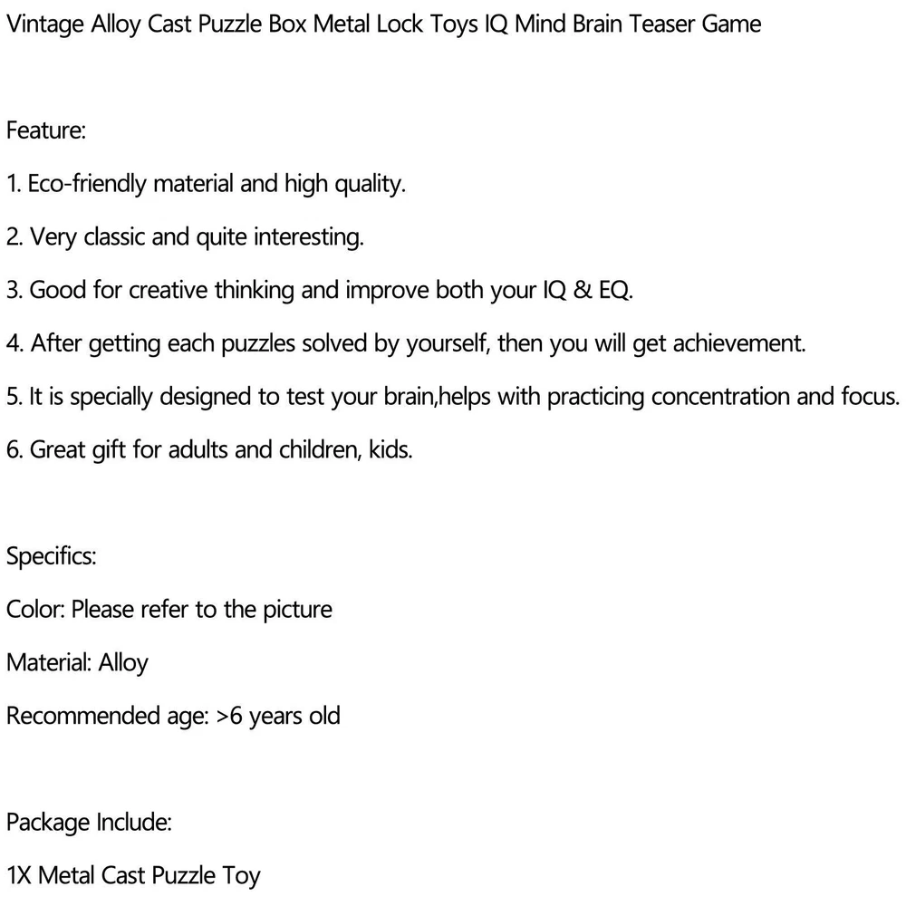 Product Description Vintage Alloy Cast Puzzle Box Metal Lock Toys IQ Mind Brain Teaser Game Feature: 1. Eco-friendly material and high quality. 2. Very classic and quite interesting. 3. Good for creative thinking and improve both your IQ & EQ. 4. After getting each puzzles solved by yourself, then you will get achievement. 5. It is specially designed to test your brain,helps with practicing concentration and focus. 6. Great gift for adults and children, kids. Specifics: Color: Please refer to the picture Material: Alloy Recommended age: >6 years old Package Include: 1X Metal Cast Puzzle Toy Note: 1: Please note diagram is not included. 2: Please allow minor deviation due to manual measurement. 3: The colors may be a little difference for the different monitor display. 4: Make sure that it is suitable for use before buying. SHIPPING & HANDLING RETURNS WARRANTY ABOUT US ♦Every item will be inspected and packed carefully before shipping. ♦The estimated delivery time is 2-7 working days. Please note that we do not handle any orders in weekend nor holidays, all orders come during weekends or holidays will be processed in next working day. ♦Please understand that once the order is accepted by courier, it's out of our control. Shipping could be delayed by various reasons such like the weather, strike, or anything unexpected, we don't take responsibility for delay due to "severe weather". ♦If you have not received it after 10 days, please contact us first, and then we will arrange to resend or refund to you asap. ♦Buyer is responsibility to the accuracy of eBay delivery address, and pay attention to the delivery updating(we guarantee all orders can be tracked online). Once the package forced to return to us due to wrong address or attempt delivery but failed over two times, we have no choice but ask buyer to pay second shipping charge, not to mention the terrible delay it caused. ♦Please be aware that your order could be putted on porch or at the front of door when nobody at home, in very rare instances, package could be stolen, we are sorry that the courier and us do not take any responsibility, as long as it's showing "delivered" in system, the only help we can offer is provide prooves when police need it. ♦We offer 60 days return window , it means you could return the order freely in 60 days of purchase. Please note that it requires that item is unused/uninstalled/unmodified, as the same condition as it's delivered. Though, we hope every buyer could inspect the part as quick as you can, to confirm if the part is the right one you need and make an early decision. In case the item arrive directly to workshop, please tell merchanic to inspect it clearly before set it up so hurry. ♦If you have a defective item which you want to return or exchange, please contact us after you receive the package. We will refund or make a replacement depends on your requirement. ♦Generally, every refund request should have the purchased item returned to us. We strong recommend the return procedure inside ebay, it helps both seller and buyer process return smoothly. In cases buyer can provide photos/pictures as proof, showing the item is dead/malfunctioning, we fully trust our customers and will refund directly without ask for the item back. ♦All refunds will be issued once the item arrives at our warehouse. The refund will then be credited back using the same method as when your initial order was made. The processing time typical takes 3-5 working days. However, this can depend on your financial institution. ♦We do not accept returns if the item(s) has been used/installed, working properly but buyer decided to return, or has been modified for some reason after buyer have received the item(s). ♦60 Day Money Back Guarantee ♦The warranty does not extend to normal wear and tear of products; products damaged due to environmental conditions including rain, snow, hail, salt, or natural disasters; products damaged due to accident or collision; or product damage caused by other faulty parts. ♦All items must be in their original condition and must not be damaged due to incorrect installation upon return. Products damaged as a result of abuse, misuse, improper repairs or maintenance, improper installation, alteration, or modification will not be covered by the warranty. ♦We need buyer's detailed description of failure to find out the cause, we may also ask for photos or videos, pls understand. ♦Under NO circumstances will our liability exceed the amount of the original sale. ♦We must be notified of the intent to return your item within 30 days of receiving the item. ♦EACH WARRANTY DOES NOT COVER ANY LABOR COSTS OR INCIDENTAL, INDIRECT, SPECIAL OR CONSEQUENTIAL DAMAGES SUCH AS, BUT NOT LIMITED TO, PHYSICAL INJURIES OR PROPERTY DAMAGE, LOSS OF TIME, LOSS OF USE OF THE VEHICLE, INCONVENIENCE, AIR FREIGHT CHARGES, RENTAL VEHICLE CHARGES, TOWING CHARGES OR ACCOMMODATIONS RESULTING FROM A DEFECT IN OR FAILURE OF THE PART. ♦Our Working Time MON to SAT 9:00-18:00 ♦We have many years experiences in germany and korean car parts wholesales. ♦eBay message is prefered, it's the only communication methode approved by ebay. All messages will be replied within 24 hrs in working day. ♦We maintain high standards of excellence and strive for 100% customer satisfaction! Positive Feedback is very important to us. ♦Any problem please feel free to contact us first, we believe no problem is irresolvable through honest communication! SHIPPING & HANDLING ♦Every item will be inspected and packed carefully before shipping. ♦The estimated delivery time is 2-7 working days. Please note that we do not handle any orders in weekend nor holidays, all orders come during weekends or holidays will be processed in next working day. ♦Please understand that once the order is accepted by courier, it's out of our control. Shipping could be delayed by various reasons such like the weather, strike, or anything unexpec