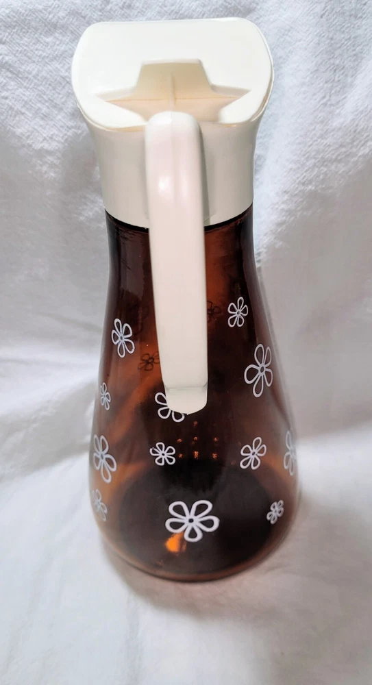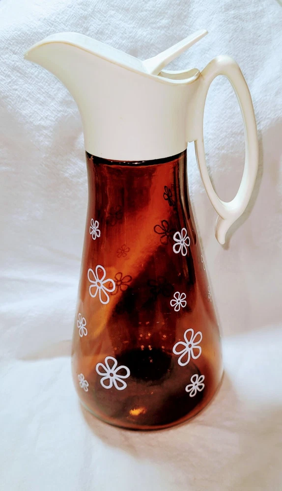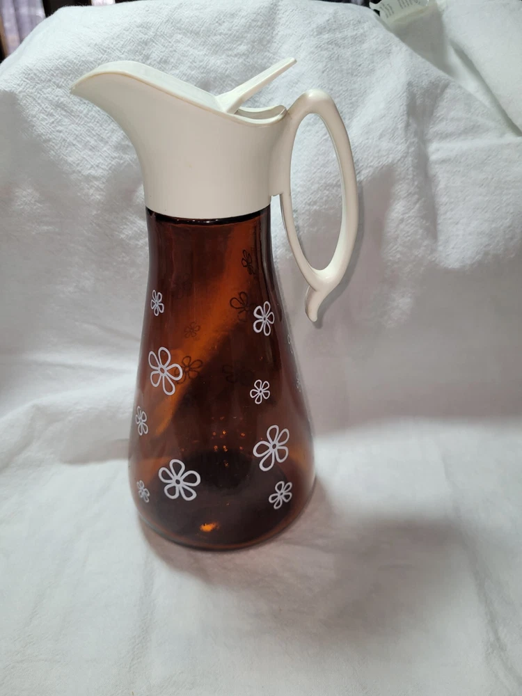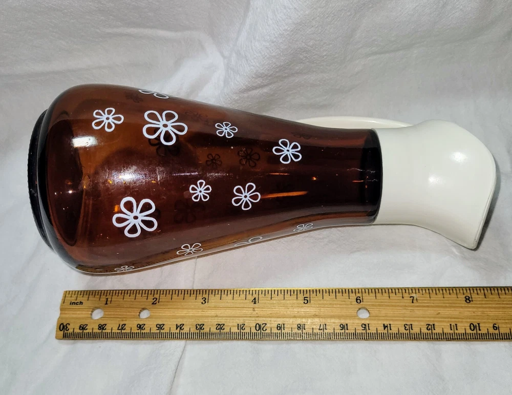 This is a nice vintage amber, brown syrup dispenser with Daisy print on it. It measures approximately 8" tall by 3 1/2" wide. On lid has a raised log cabin emblem. This also has an air bubble inside of glass, original to the piece. Please see photos for style and condition. The photos are part of the listing, and this is the item you will receive. I do combine shipping up to 7 days or 5 items, whichever comes first. Please request combined shipping if you are ordering/bidding on multiple items.
