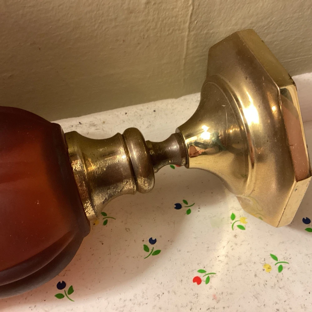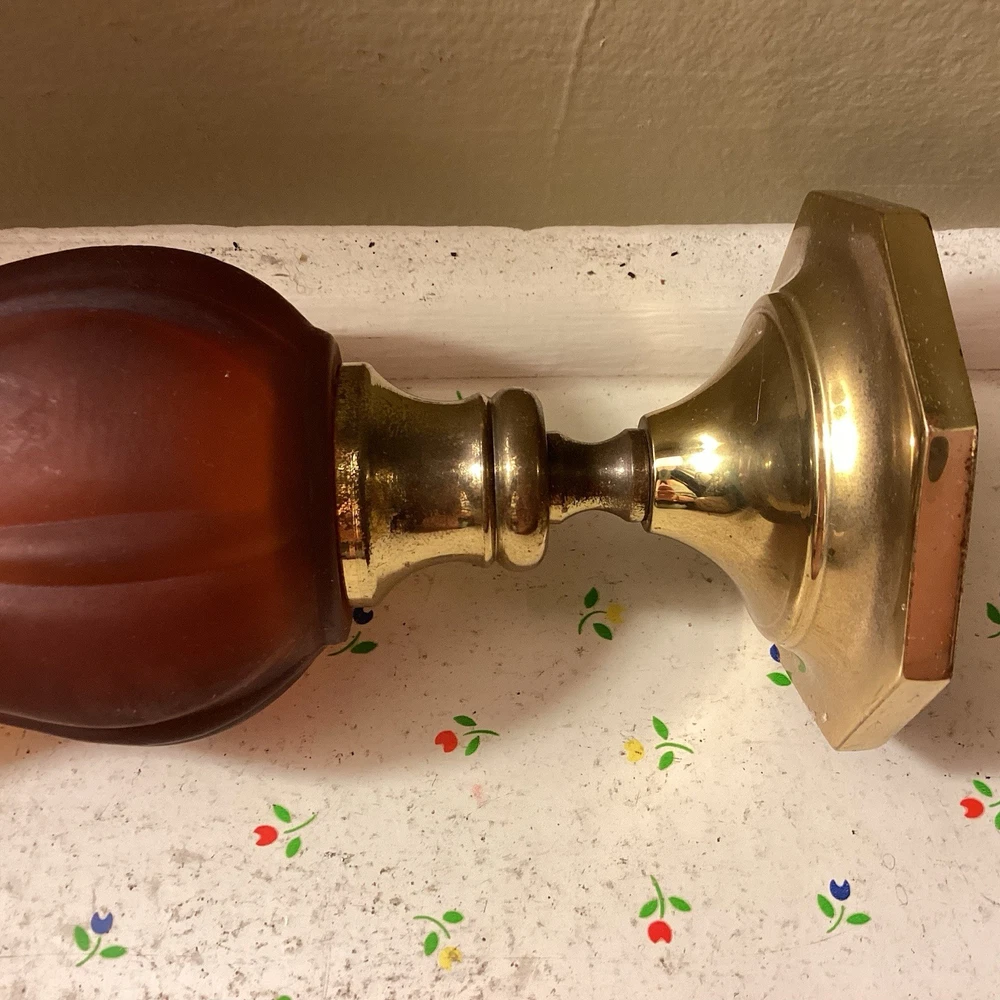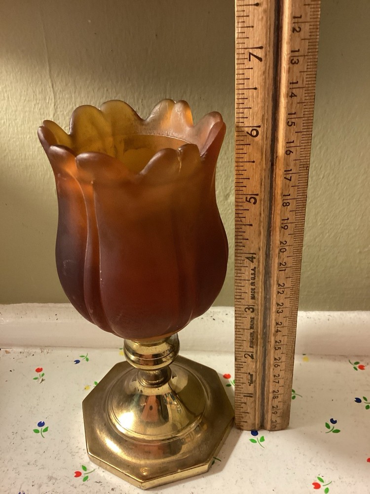 The product is a vintage dark amber and gold flared honeycomb diamond glass peg votive cup candle holder. This elegant candle holder is suitable for use with votive candles and tea light candles, making it perfect for any room in your home. Its Hollywood Regency style and original design add a touch of sophistication to any space. The item stands at a height of 5.75 inches and has a width of 3.5 inches. Care instructions recommend cleaning with warm water for easy maintenance.