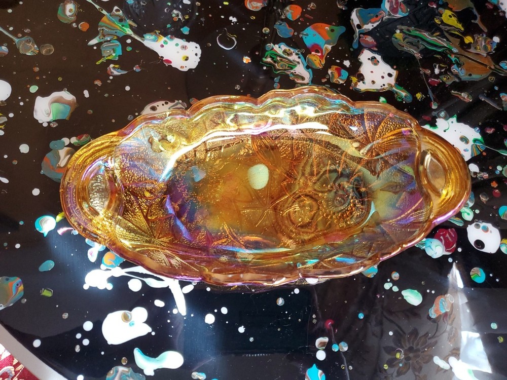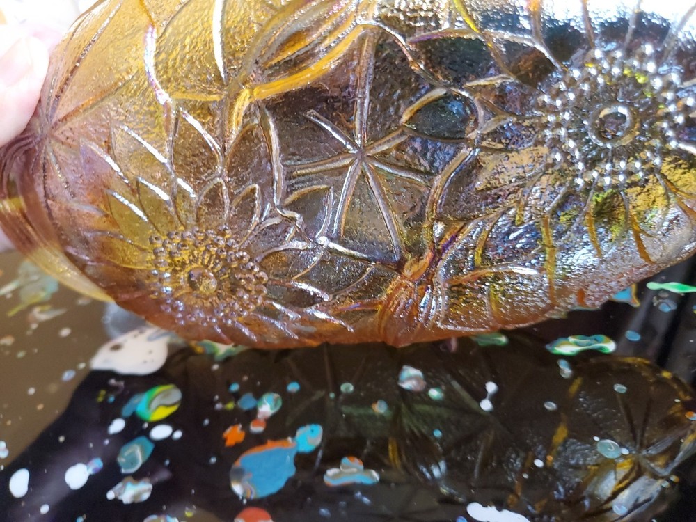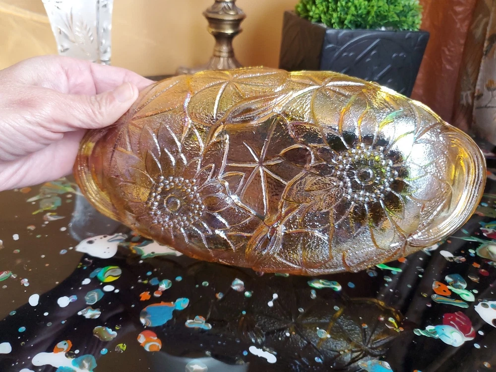 Vintage Indiana Carnival Glass Oval Sunflower Amber Candy Dish Perfect Condition. Condition is Used. Shipped with USPS Ground Advantage.