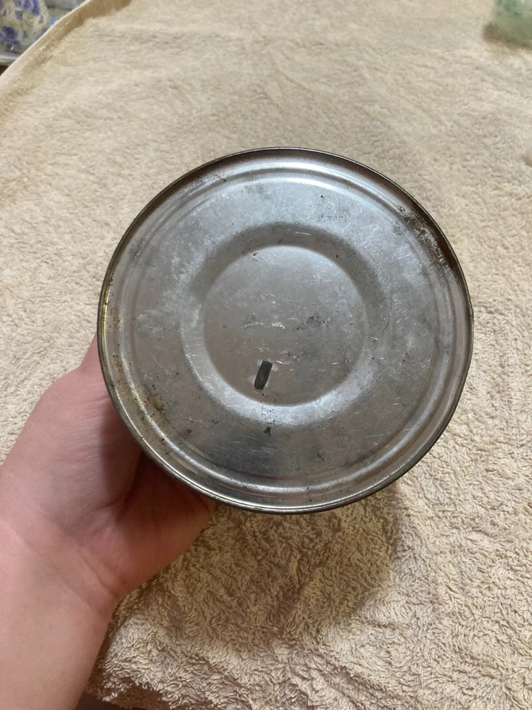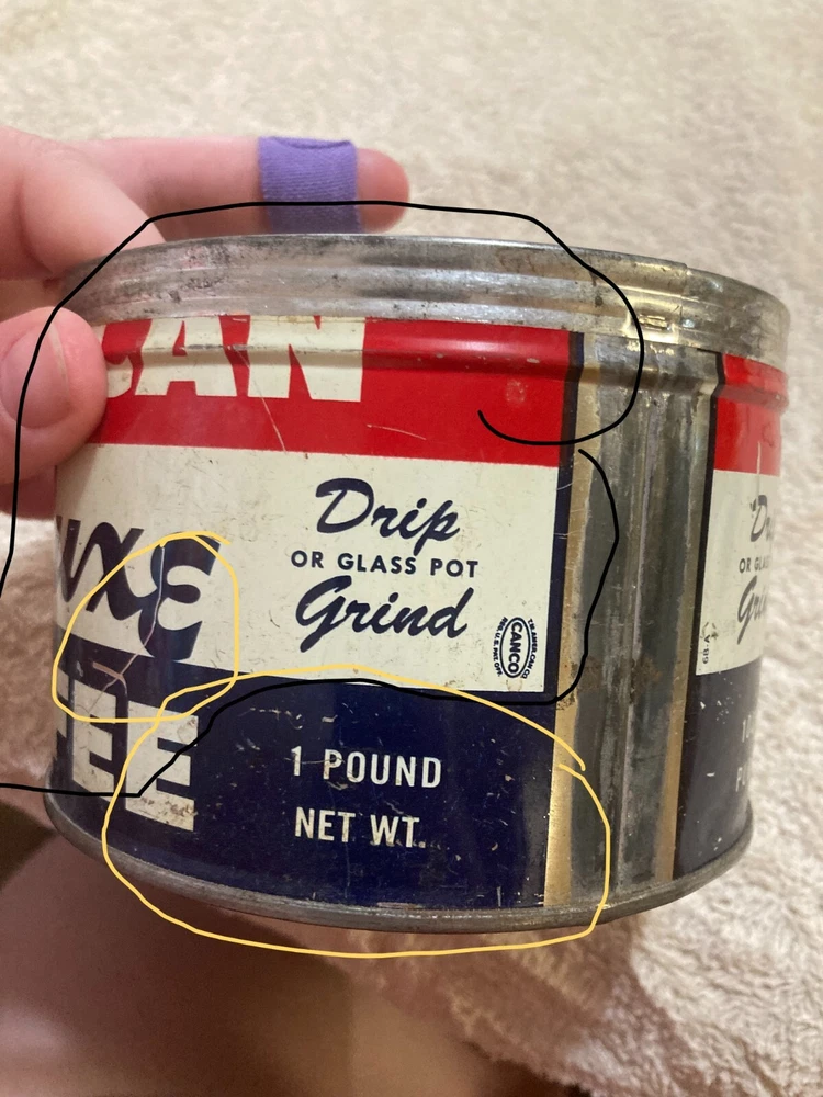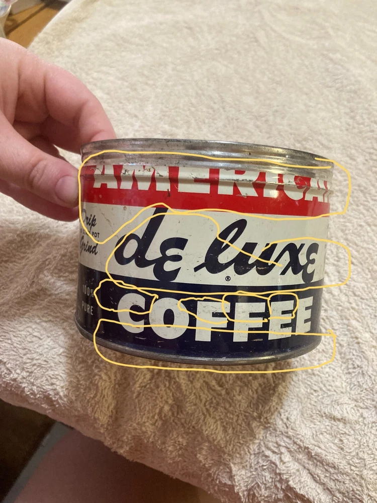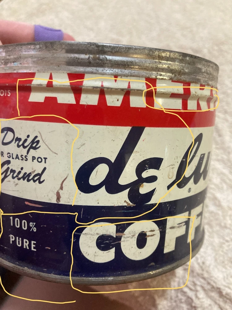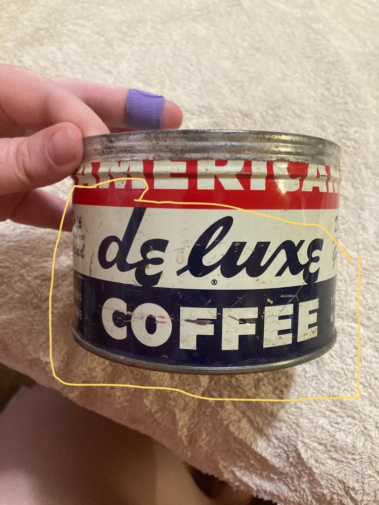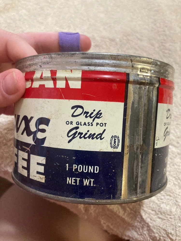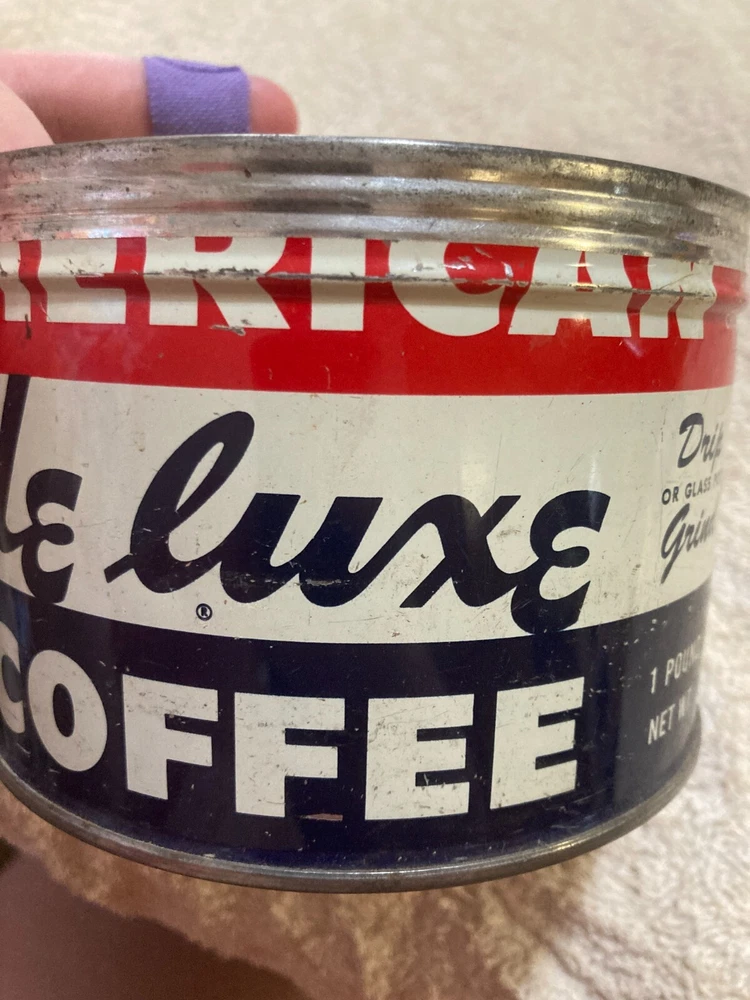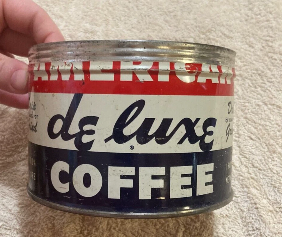 American Deluxe Coffee Metal Can with no Lid. The design on the coffee can with red, white, and blue stripes and lettering. The coffee can measures 3 1/2 inches and 5 inches in diameter. In fair condition with surface interior discoloration and surface scratches. There also is some rusting on the inside of the can. Some residue is found on the outside of the can and on the bottom surface of the coffee can. There is some wear to the metal and the coloring on the can. Please view all photos to judge the condition for yourself. All of these items are being sold as is -so please view all photos and ask any questions before buying this item. Please let me know if you have any questions or concerns. Items can always be combined for shipping. Any shipping charges that are above the cost of shipping beyond $1.00 will be returned. For example, if you are charged $12 and it costs $5, you will be returned $7. I had to include this because of some questions I have had lately. I am always open to reasonable offers .