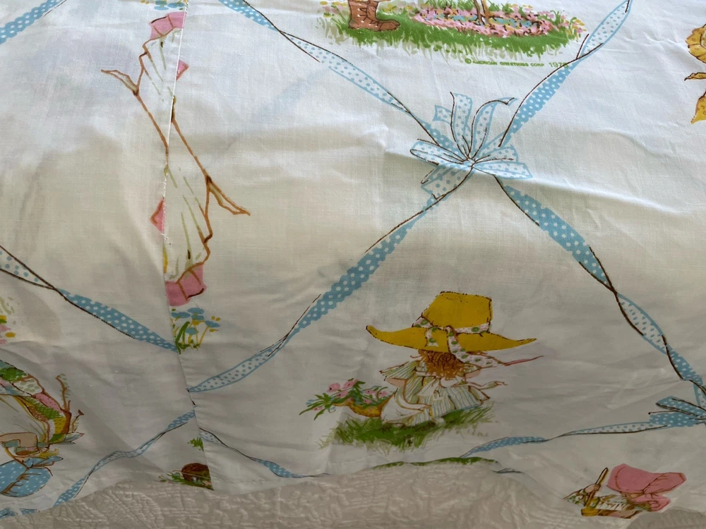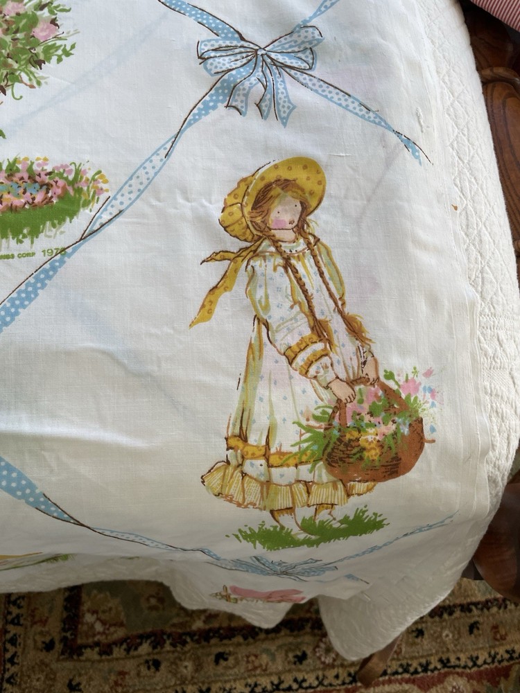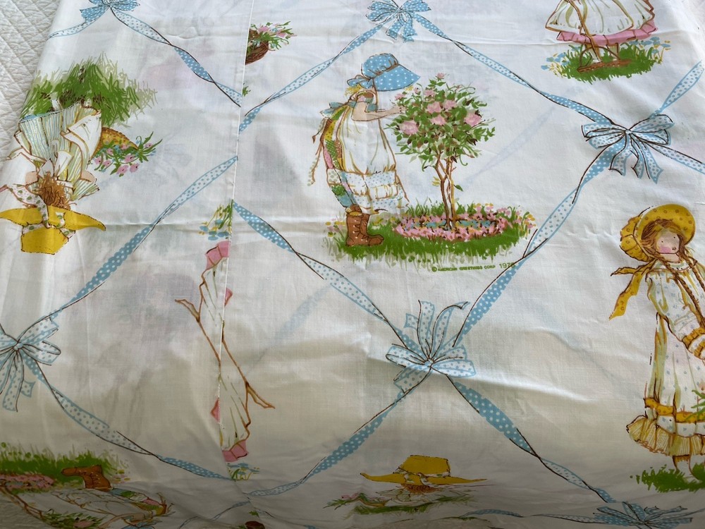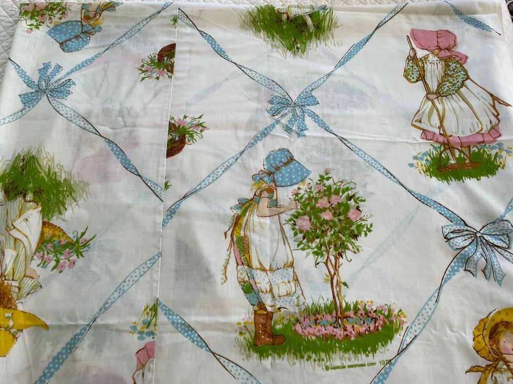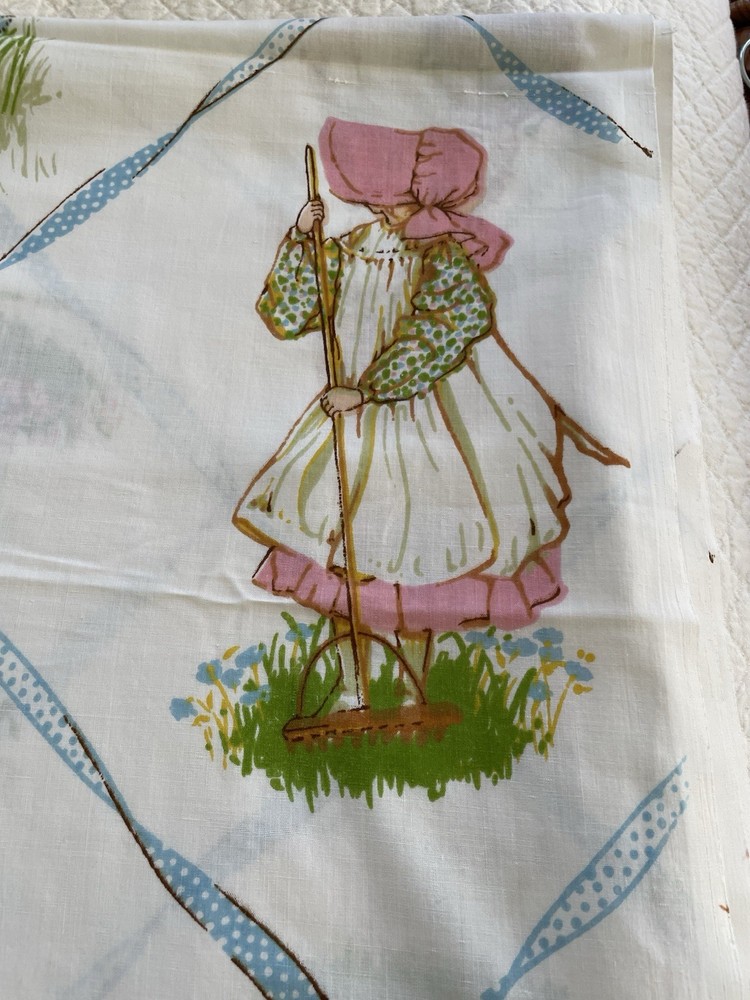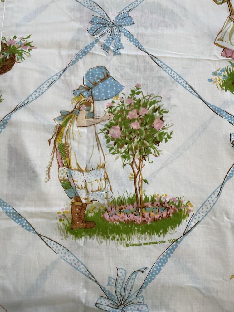 Holly Hobbie by American Greeting. Vintage 1976. This is a large piece of vintage fabric. It has been hemmed with an approximate 1 inch hem at top and bottom. With panels sewn together. I am guessing that it was a sewn to be a curtain for a girls room. It is clean with no spots or holes. An excellent fabric source.