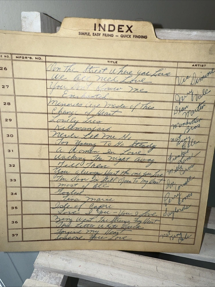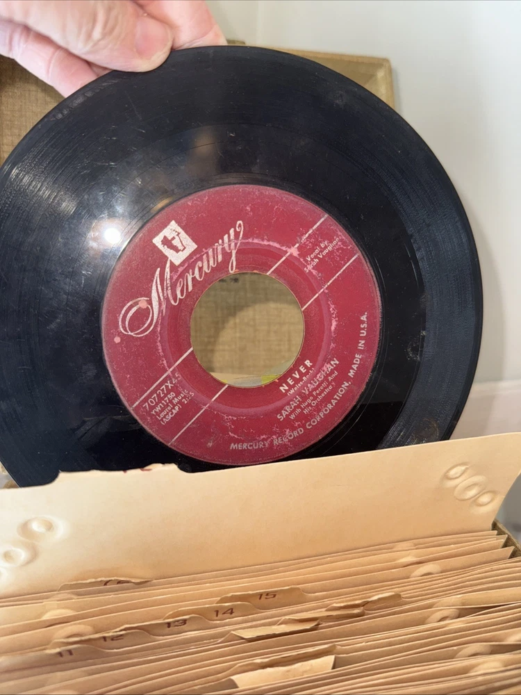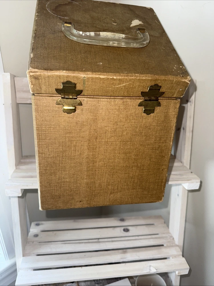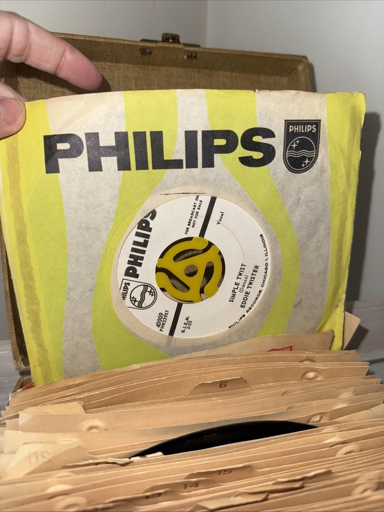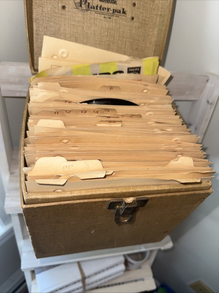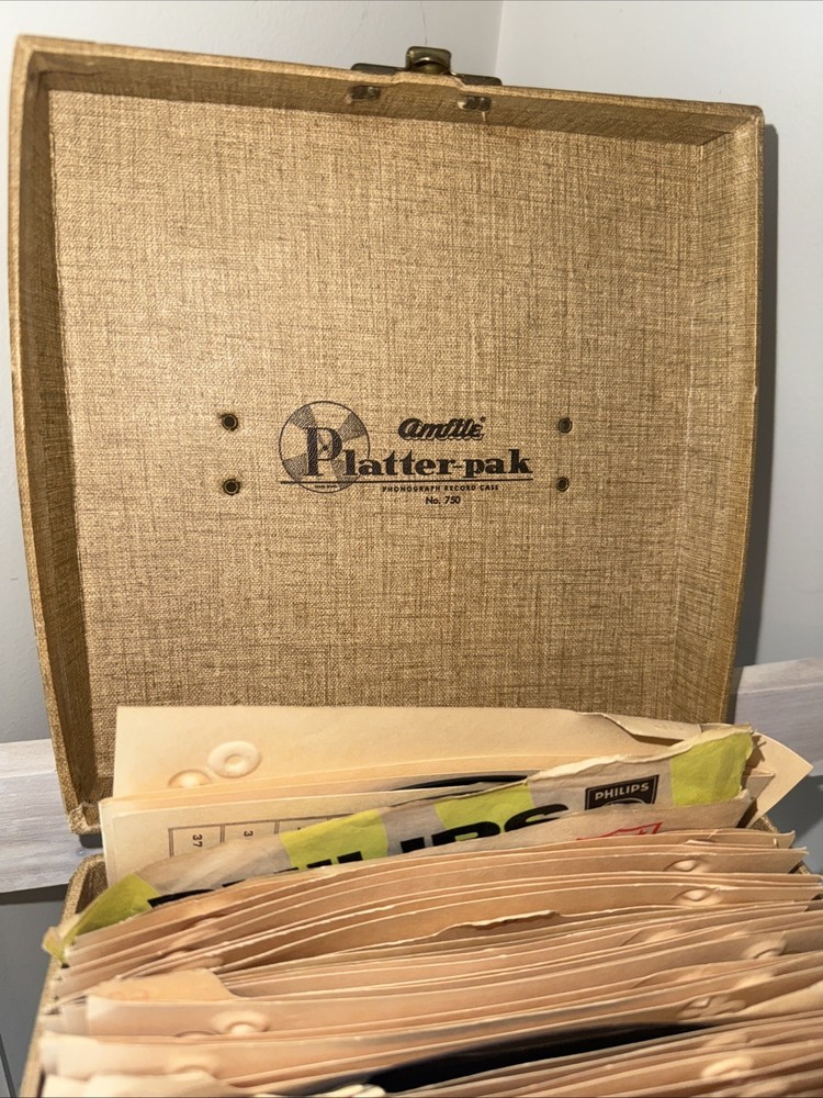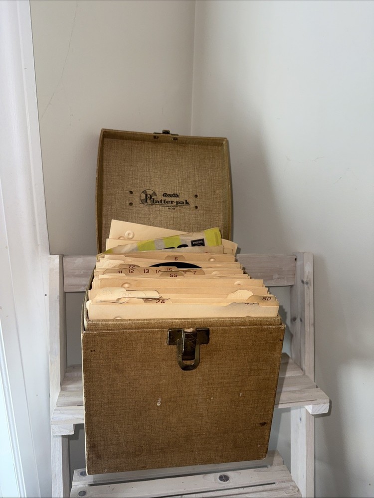 The Vintage Amfile Platter-pak Storage/Carrying Case is a retro storage solution designed specifically for 7" records. With dividers and 81 45rpm records included, this storage box from Amfile offers a convenient and organized way to store and carry your music collection. Perfect for vinyl enthusiasts looking to keep their records safe and easily accessible. To many records to list! Records have not been played not sure if they play, Sold As Is!!!!