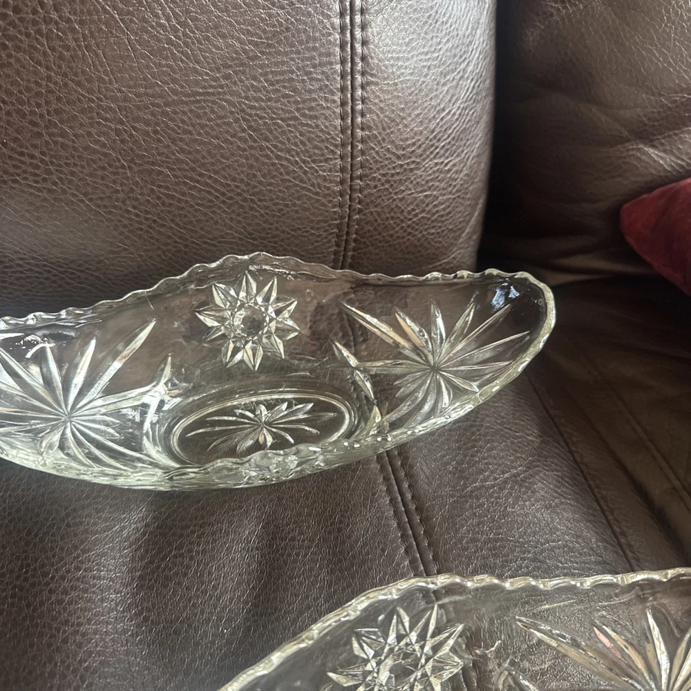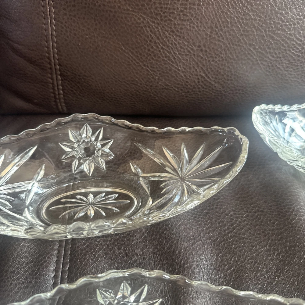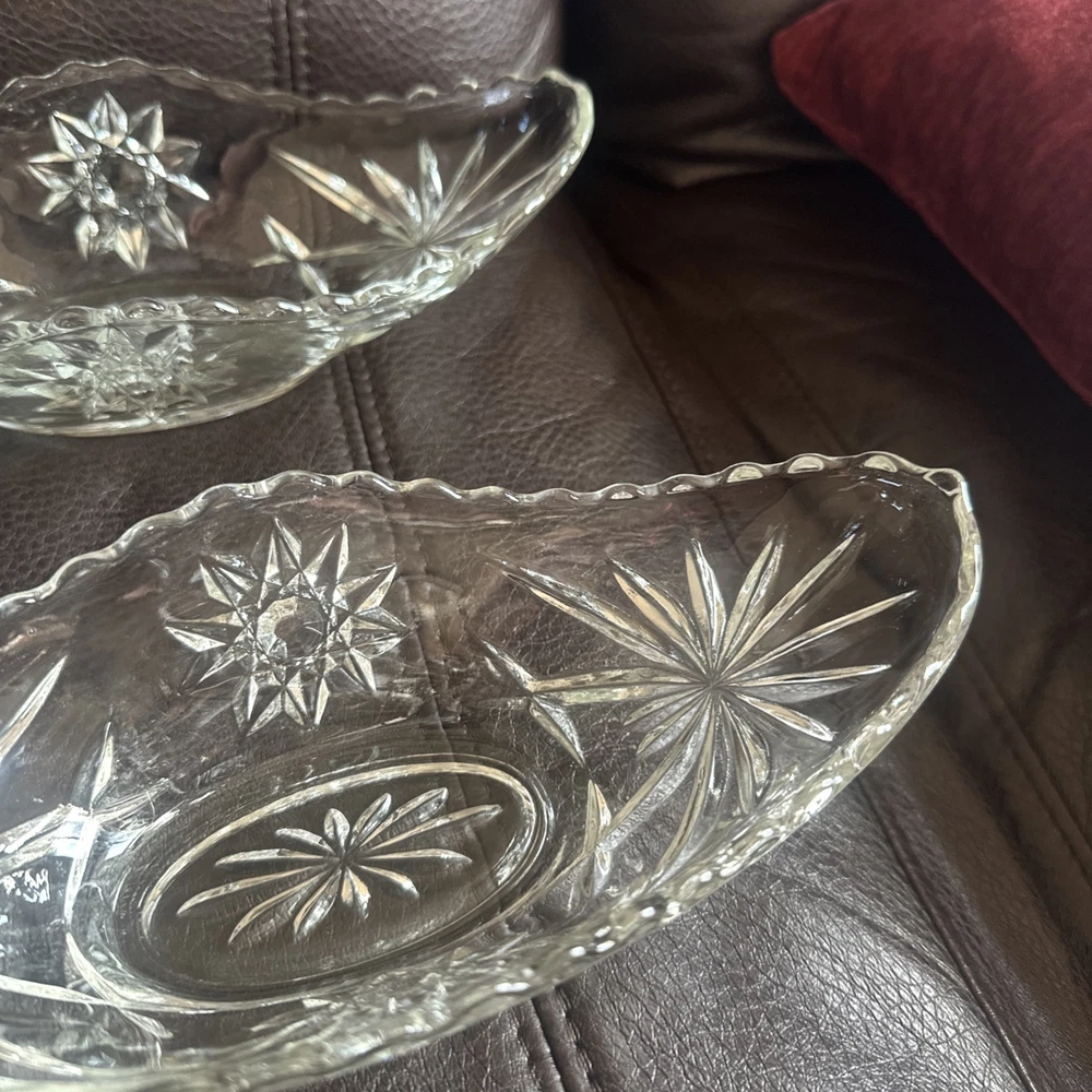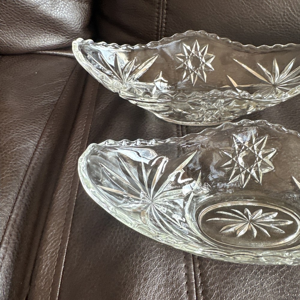 This product is a set of four vintage Anchor Hocking glass banana boats, each measuring 9.5" x 4.25". The glasses are clear and made of glass, and they belong to the Early American Prescut/EAPC product line. They are also vintage items. The brand of the glasses is Anchor Hocking, and the number of items in the set is four. Beautiful used condition!