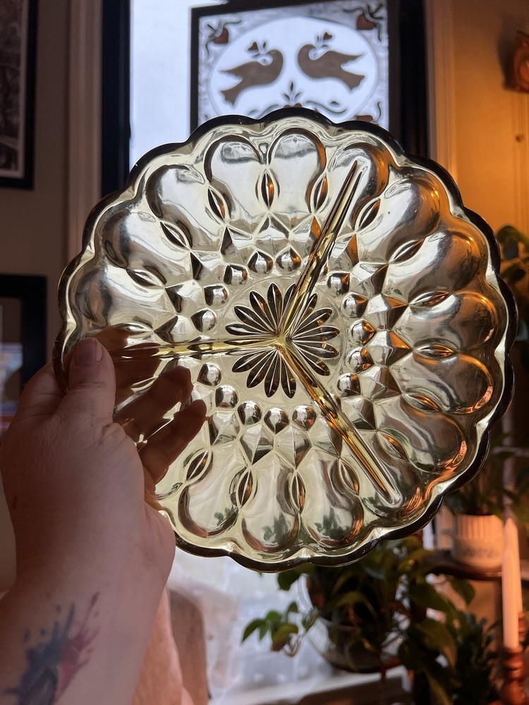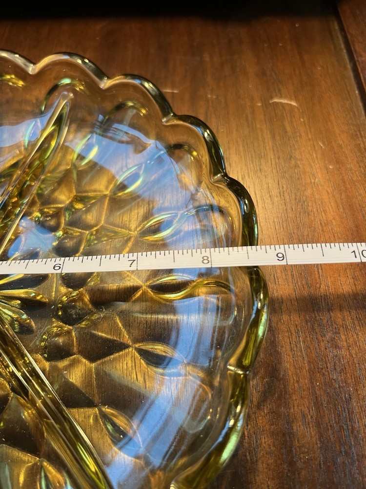Enhance your table setting with this stunning vintage Anchor Hocking amber glass divided serving dish! Crafted by the renowned Anchor Hocking Glass Company, this beautifully designed piece features a scalloped edge and an intricate pressed glass pattern, with three distinct sections perfect for serving snacks, candies, or condiments. The warm amber hue adds a nostalgic glow, making it a standout addition to any collection or event. Details: • Brand: Anchor Hocking • Material: Pressed Glass • Dimensions: Approximately 9 inches in diameter (based on provided measurement) • Design: Round, 3-section divided tray with scalloped edges and a detailed floral-like pattern • Condition: Excellent vintage condition with no chips or cracks; minor wear consistent with age (please see photos for details) • Style: Retro mid-century aesthetic, ideal for vintage, rustic, or eclectic decor This Anchor Hocking serving dish is a timeless piece, perfect for hosting parties, family gatherings, or holiday events. Use it to elegantly present nuts, candies, dips, or small appetizers, while its vintage craftsmanship adds a touch of nostalgia to your table. The amber glass catches the light beautifully, enhancing the ambiance of your dining experience.