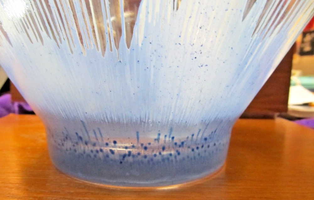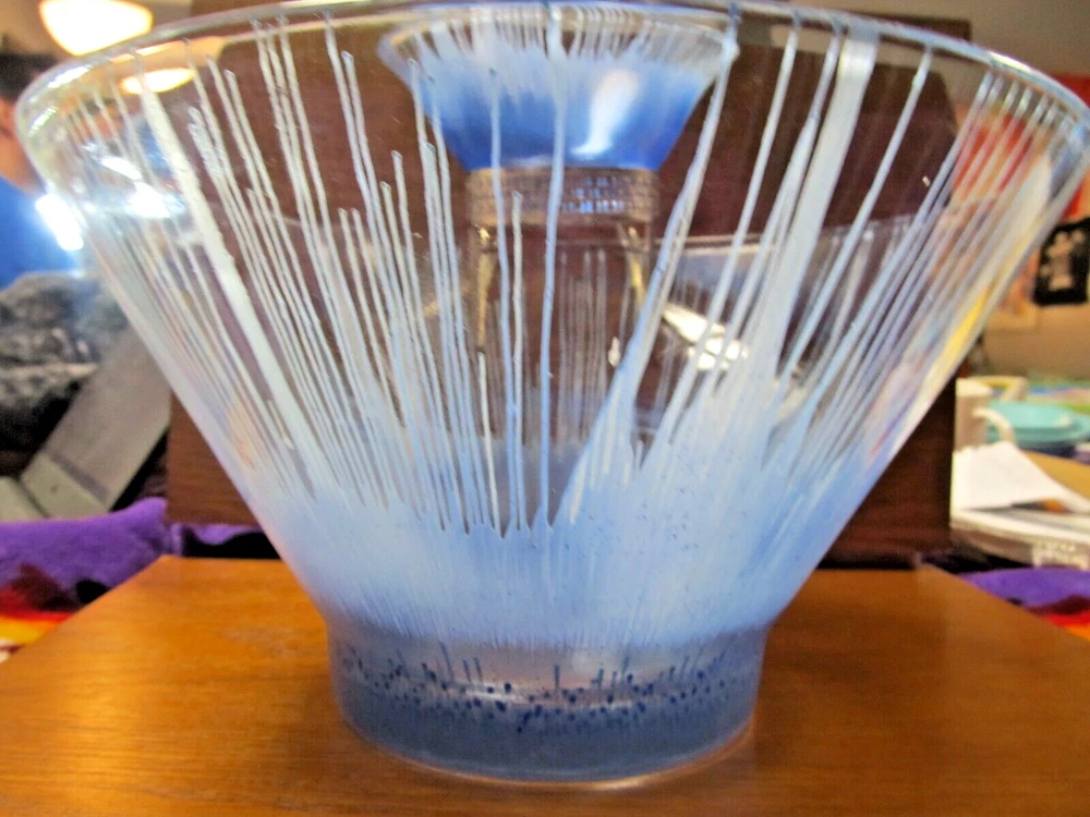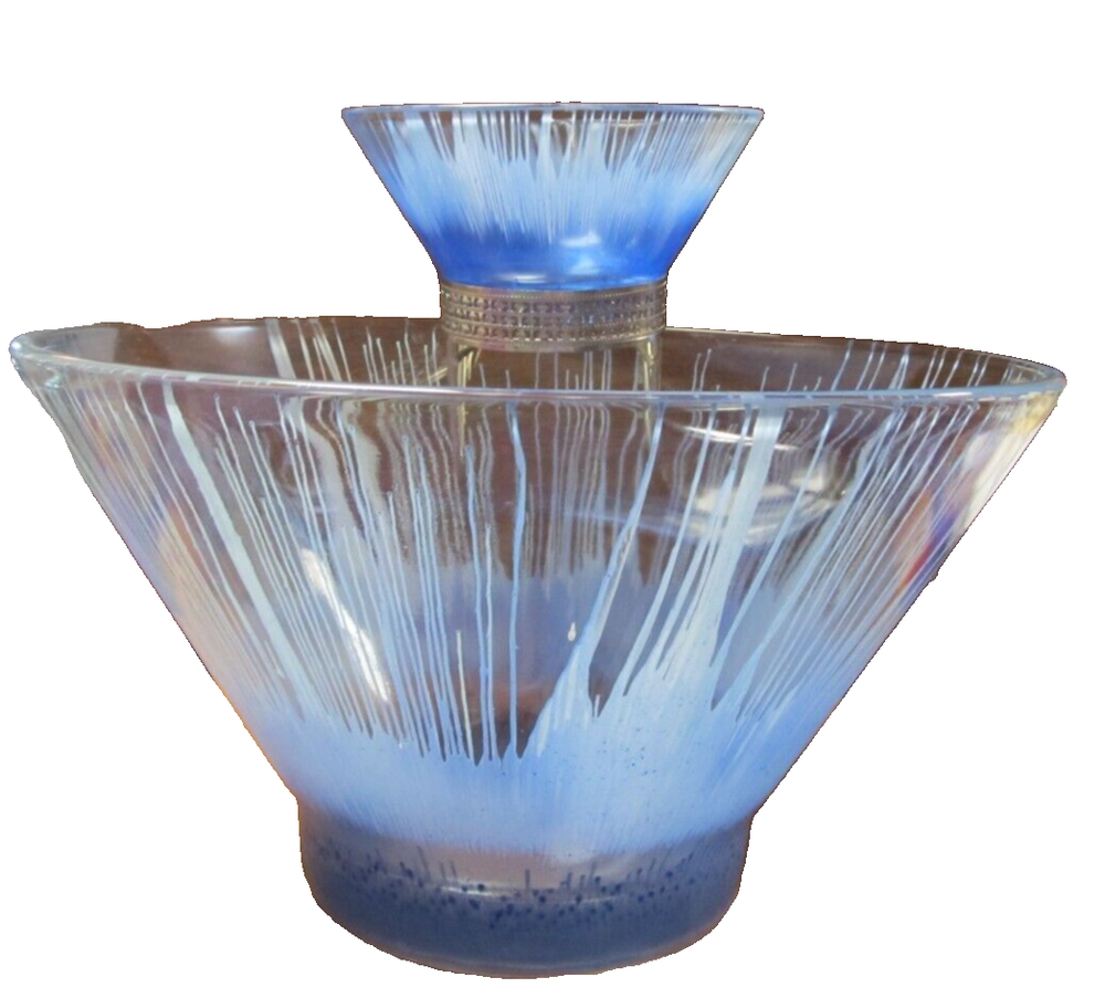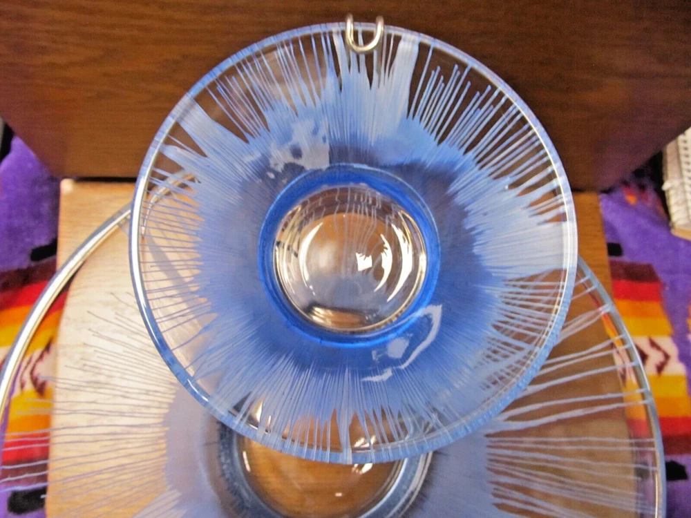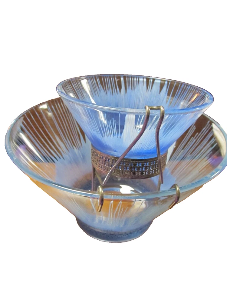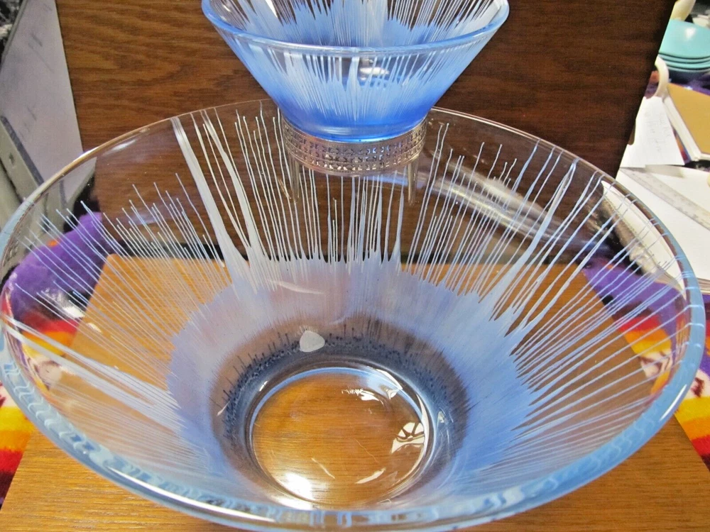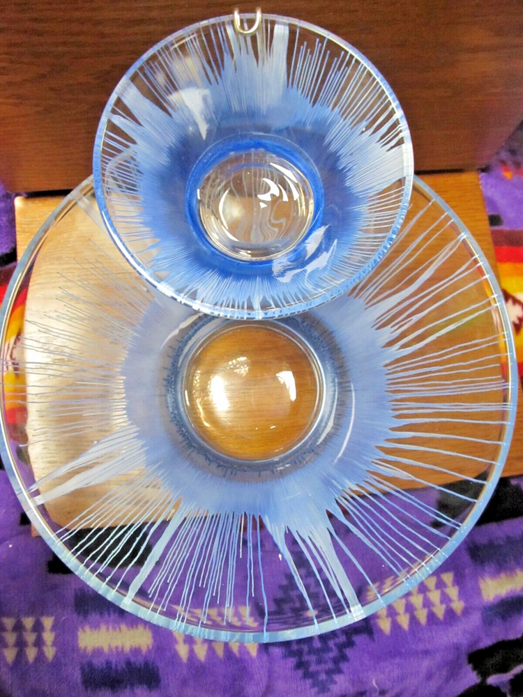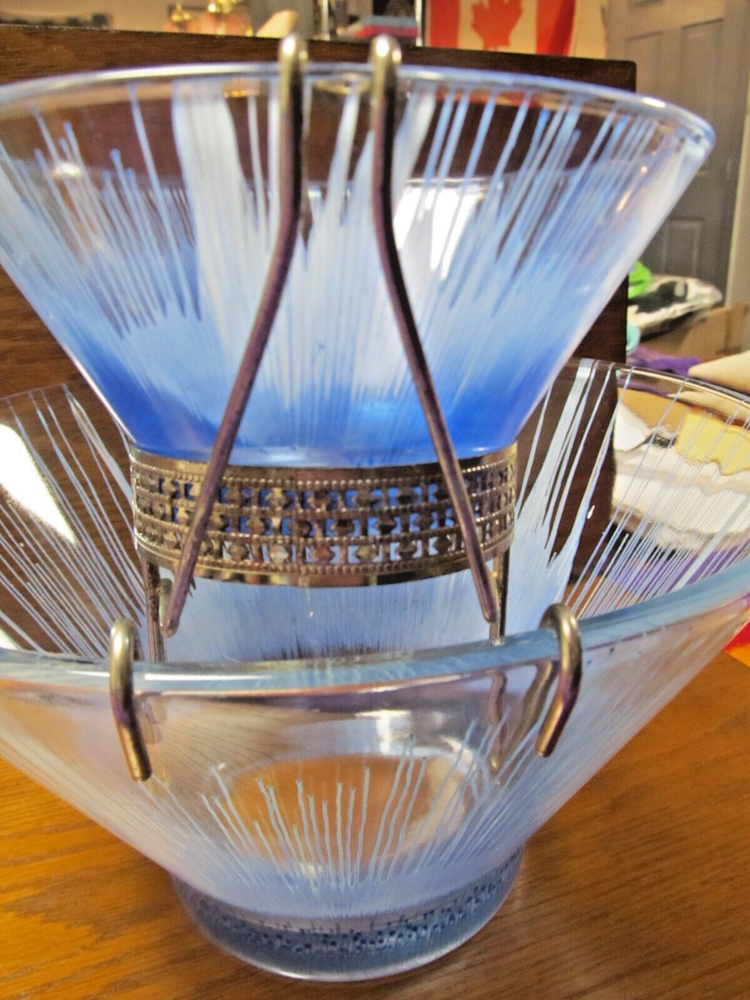 1950's Anchor Hocking? Blue and White Splash/Splatter design. Chip N' Dip Bowl Set, mid-century, silver toned metal attachment, This spectacular chip and dip bowl set has a very distinct look with a vivid design featuring blue splash like drips into a white background. The dip dish is beautifully suspended with a bracket attachment which is silver toned and accented with a filigree trim. The Set is unmarked but is believed to be Anchor Hocking. It is a rare vintage find, particularly in blue. In excellent condition and would be a great for any party or special occasion. No Damages, Dimensions: Chip Bowl-Diameter (rim) 10.5", Height 5 7/8" Dip Bowl: Diameter (rim) 5 1/4", Height: 2.5"