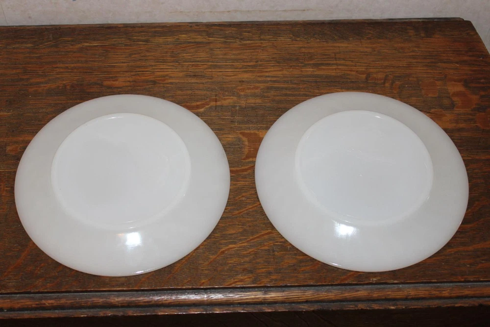 Presenting a delightful Vintage Anchor Hocking Fire King Milk Glass Swirl Salad Plates - Set of 2, a charming representation of mid-century tableware. Crafted by the renowned Anchor Hocking Fire King brand, these milk glass plates are a testament to the timeless elegance and quality associated with vintage Fire King pieces. Each plate is gently used and in very good condition, with no chips or cracks. Plates measure approximately 7.75 inches across and are accented in Gold.