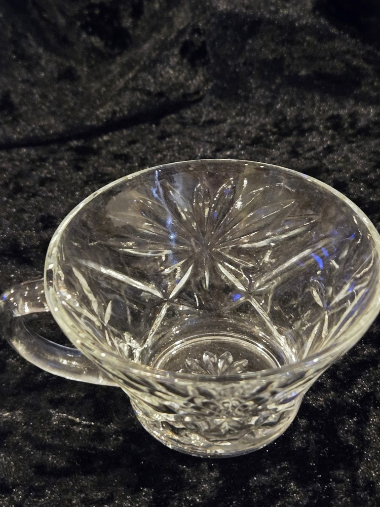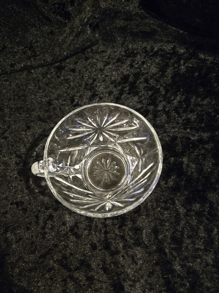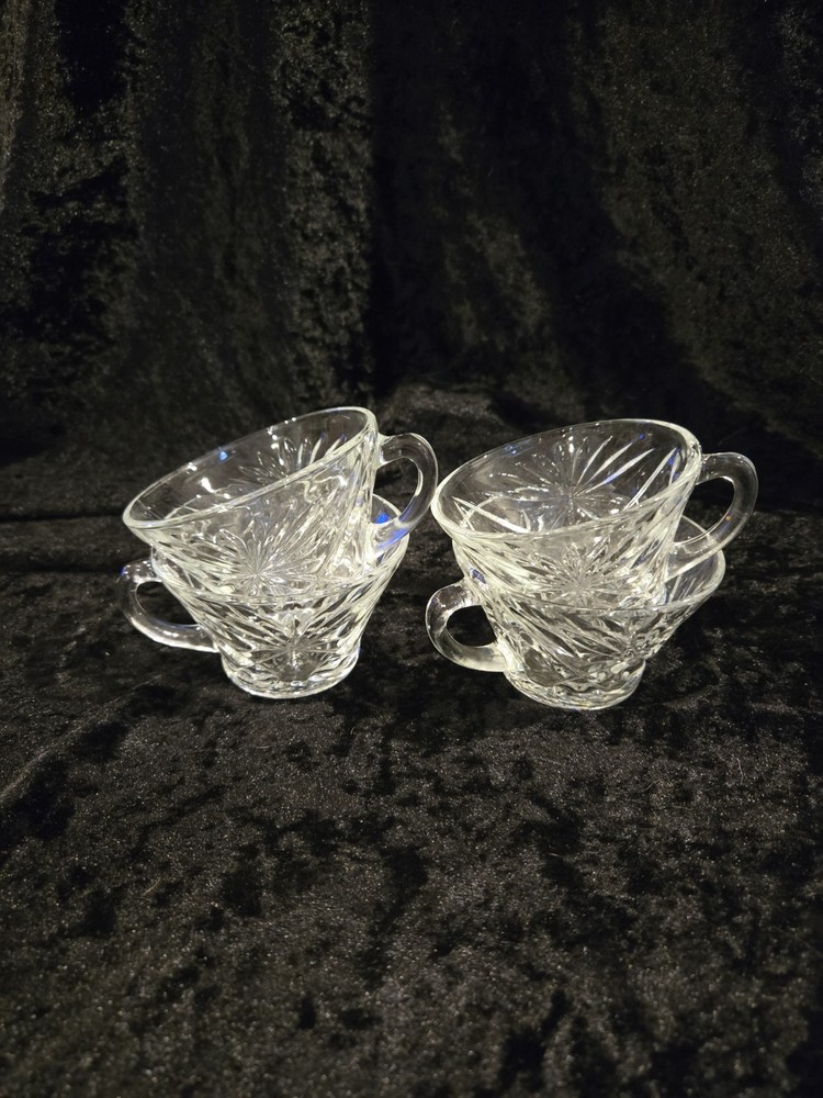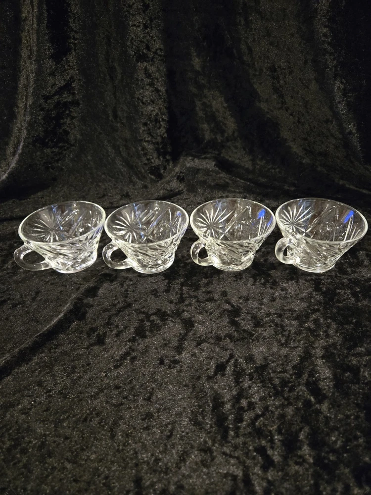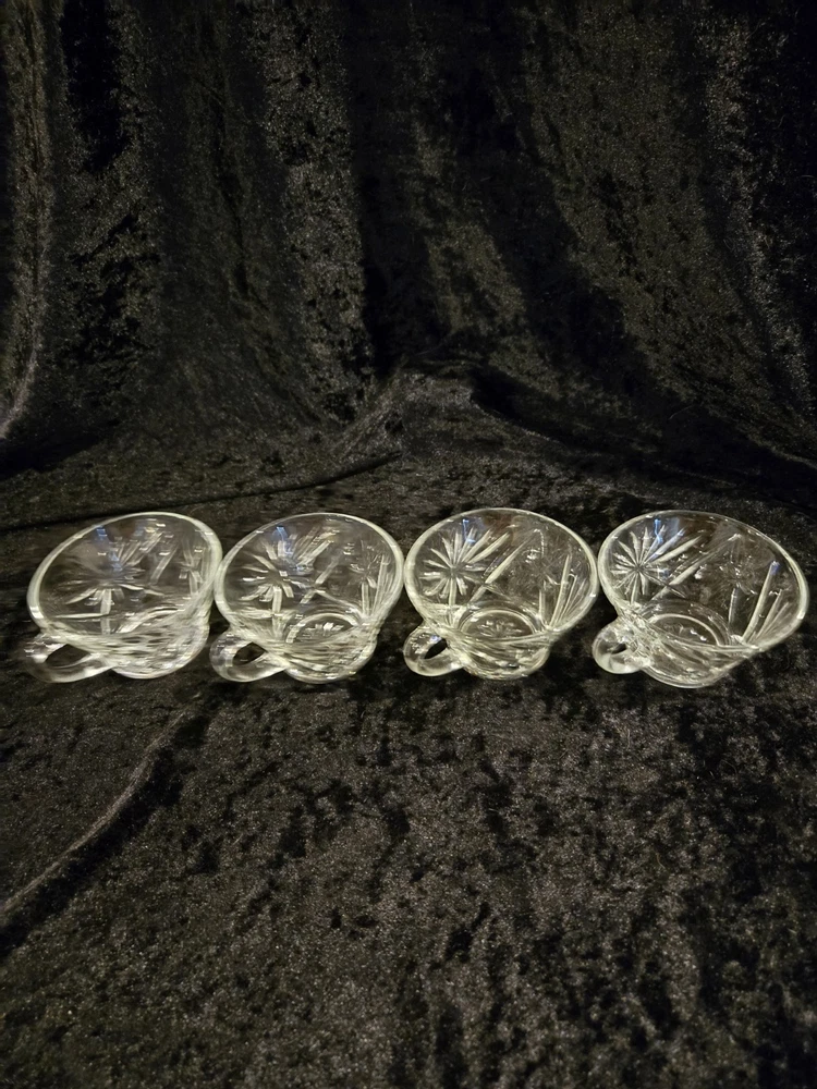 The Vintage Anchor Hocking Clear Glass Prescut Star Of David Punch Cups are a set of 4 beautiful cups made of pressed glass in the Starburst pattern. Produced in the 1960s, these original cups belong to the Early American Prescut/EAPC product line. The clear color and vintage design make them a unique and charming addition to any drinkware collection. Perfect for serving drinks or as a decorative piece in a home, these cups are a nostalgic reminder of a bygone era.