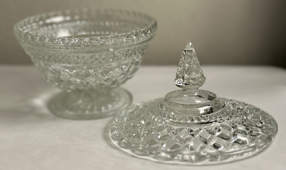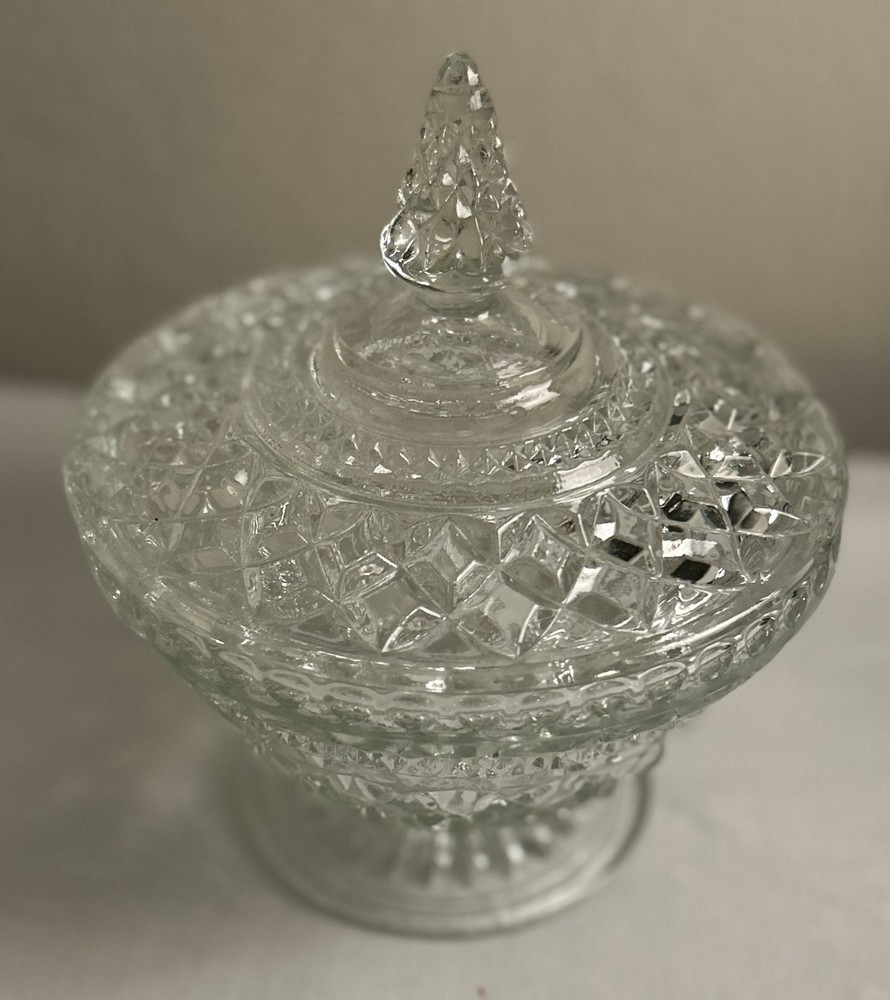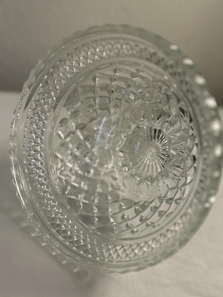Elevate your display with the Vintage Anchor Hocking Wexford Clear MCM Glass Candy Dish, a quintessential piece of Mid-Century Modern design. The dish features a sleek, pressed glass construction with a fitted lid, ensuring your sweets are kept pristine and dust-free. Measuring 7 3/4 inches in height and 6 3/4 inches in diameter, it offers a generous space for your favorite confections. Crafted in the United States, this candy dish boasts the quality and charm of the Anchor Hocking brand, known for its exquisite glassware. The Wexford product line is celebrated for its elegance and simplicity, making this dish a timeless addition to any collection. Whether for serving or decoration, it brings a touch of vintage sophistication to any setting. No noticeable flaws detected Please see photos before purchase ask any questions pertaining to the item