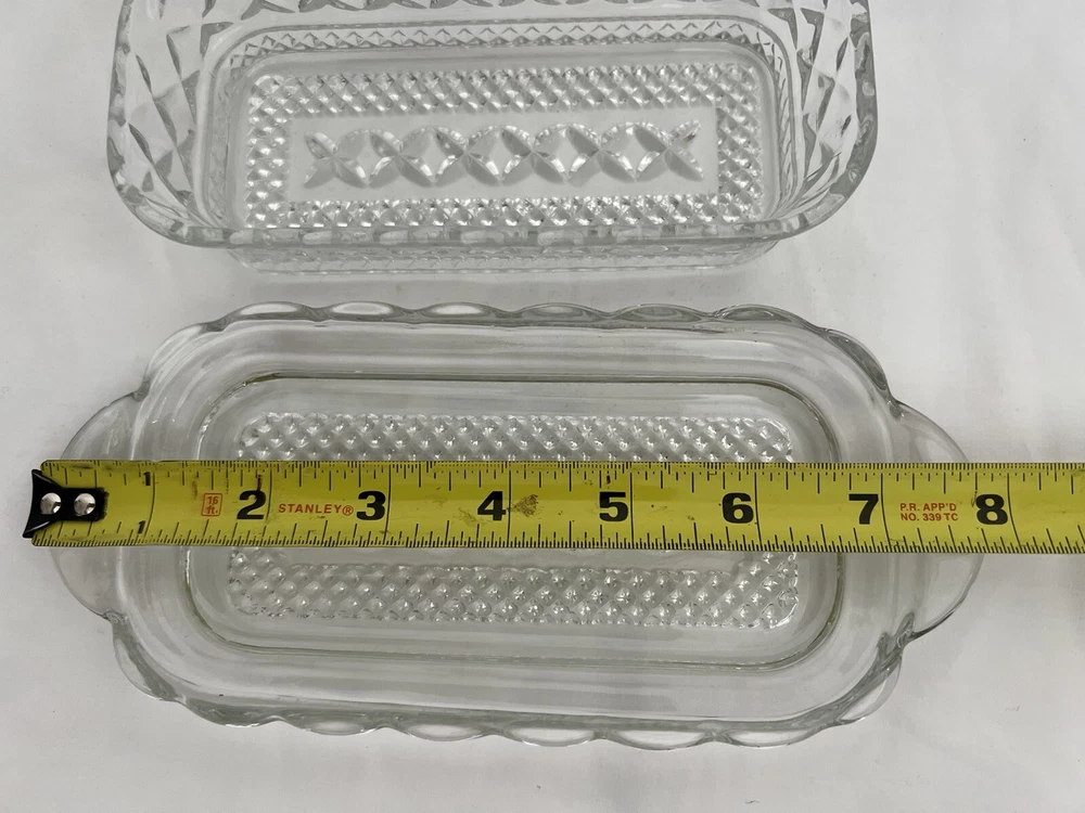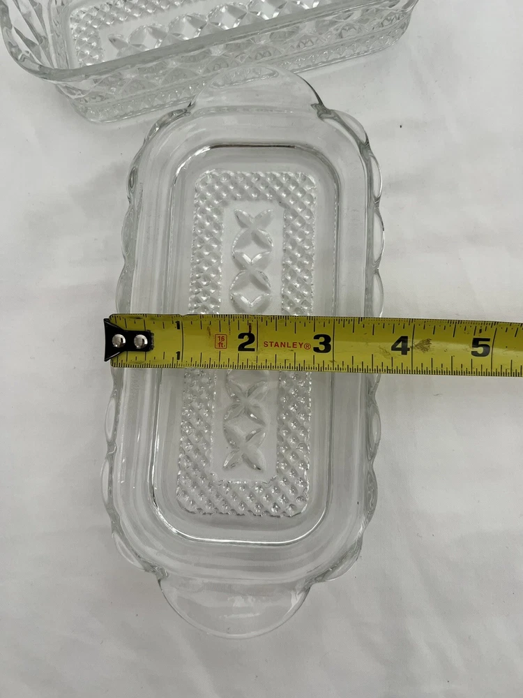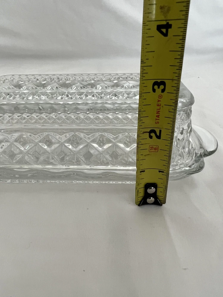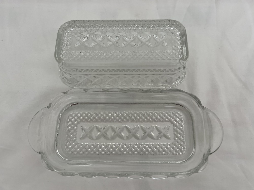 Item Length:8”Year Manufactured:1965gtin13:Does not applyNumber of Compartments:1Country/Region of Manufacture:United StatesAntique:NoColor:ClearHandmade:NoProduction Style:Cut GlassOriginal/Reproduction:Vintage OriginalVintage:YesTime Period Manufactured:1960-1969Custom Bundle:NoProduct Line:WexfordNumber of Items in Set:2Item Height:2-1/2”Shape:RectangleProduction Technique:Fused GlassCapacity:1/4 Pound StickModel:Hocking WexfordItem Depth:2.5"UPC:Does not applyType:Butter DishFinish:Clear CutMaterial:GlassType of Glass:Cut GlassOrigin:americaTheme:EleganceStyle:Mid-Century ModernFeatures:Lid IncludedOriginal/Licensed Reproduction:OriginalBrand:Anchor HockingPattern:Diamond