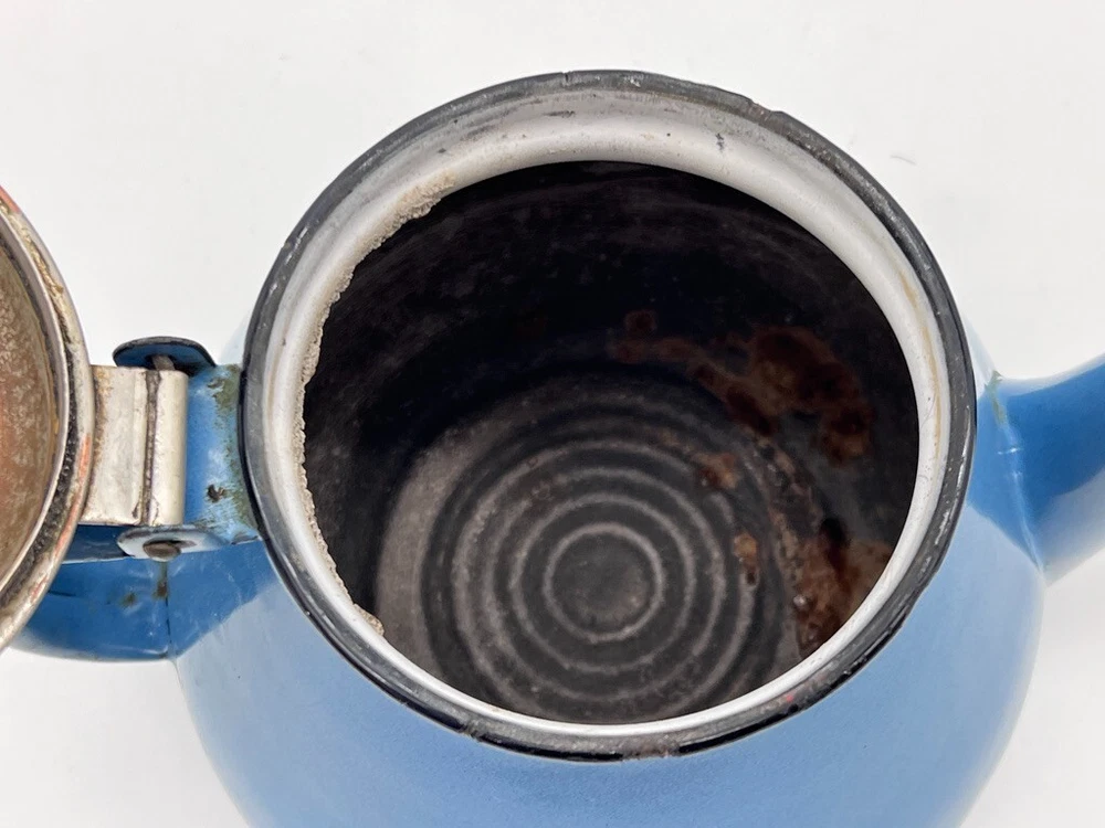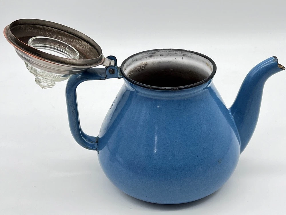 Vintage Antique Blue Enamel Ware Teapot with BREAK NO MORE Glass Lid Tea Kettle Please view my pictures as they are the most important part of my description - detailing external features of condition, style, color and contents of this auction. You will receive everything included in the photos. Please ask questions; I am happy to answer all inquiries. Thanks. Click HERE to view my other POTS, PANS & OTHER COOKWARE (INCLUDING CAST IRON, CAST ALUMINUM & VISION CORNING AMBER GLASSWARE Click HERE to view my VINTAGE REVERE WARE