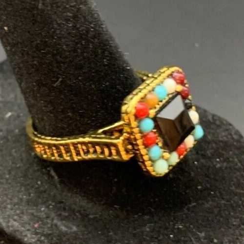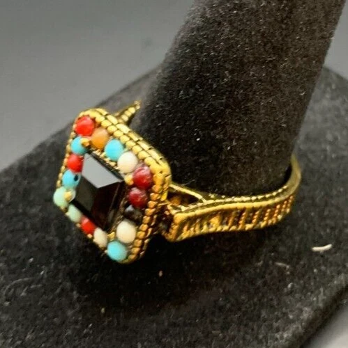 Vintage Antique Gold Tone Black CZ Rhinestone Cocktail Ring - Size 9