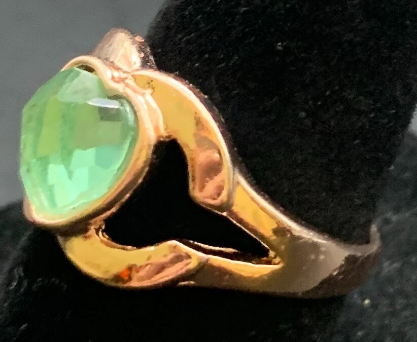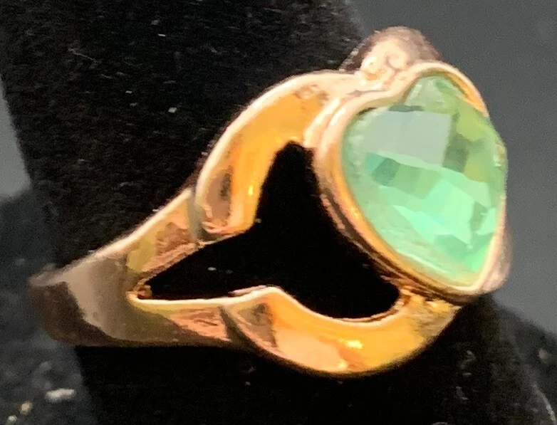 Vintage Antique Gold Tone Green Rhinestone Heart Ring - Size 6.5