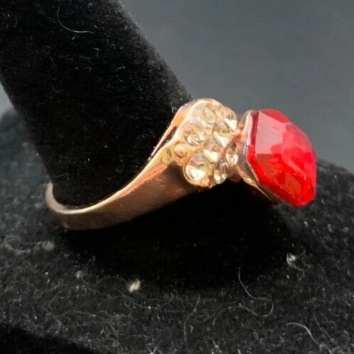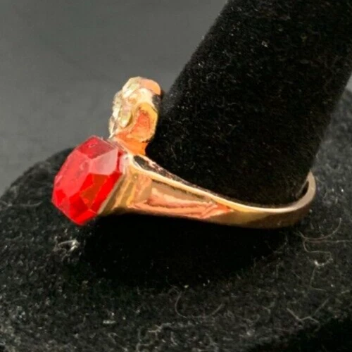 Vintage Antique Gold Tone Red Rhinestone CZ Cocktail Ring - Size 8.5