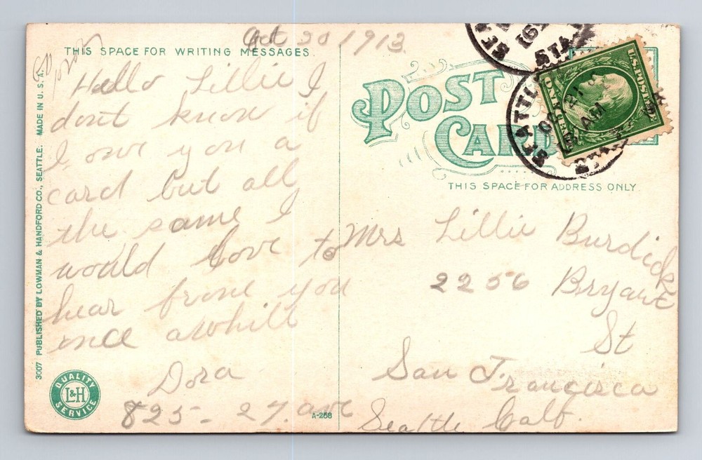 Region: Washington Country: USA Original/Licensed Reprint: Original Subject: Cities & Towns Type: Printed (Lithograph) City: Seattle Postage Condition: Posted Era: Vintage Size: Standard (5.5 x 3.5 in) Material: Paper Theme: Cities & Towns Unit of Sale: Single Unit Country/Region of Manufacture: Unknown