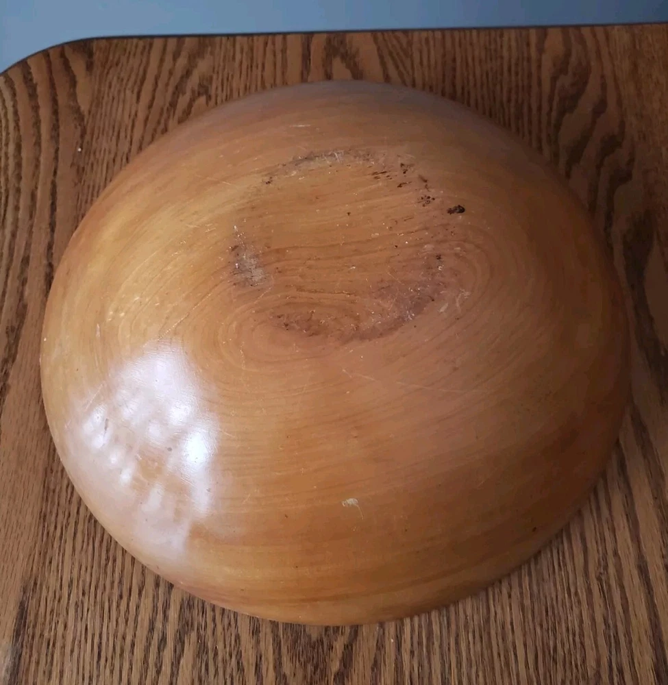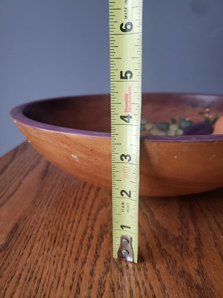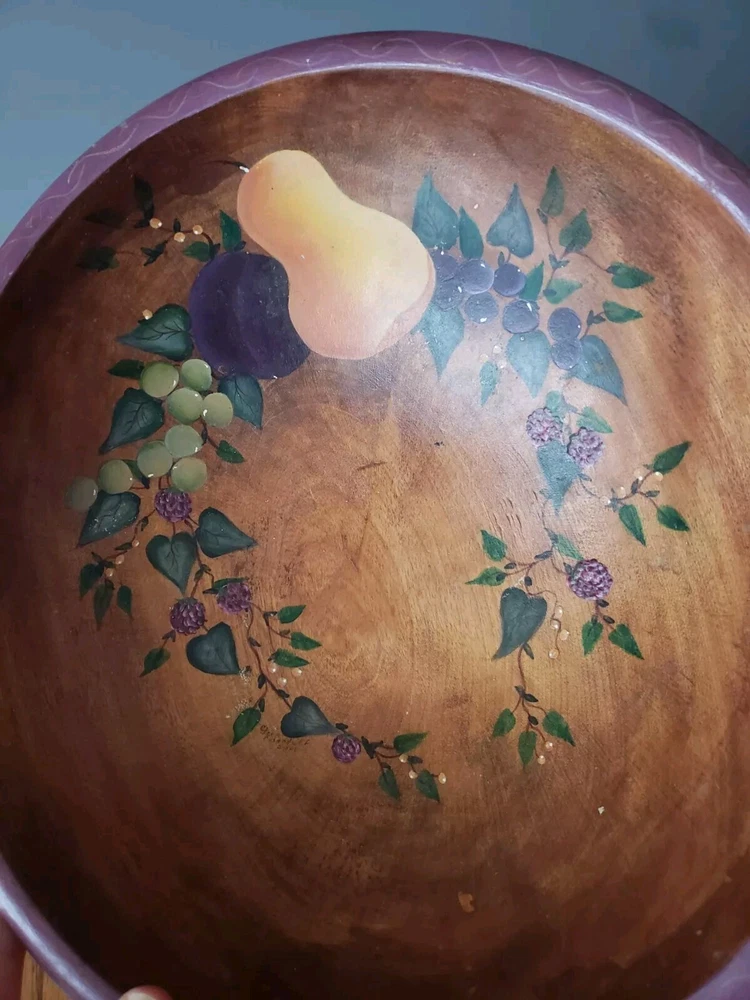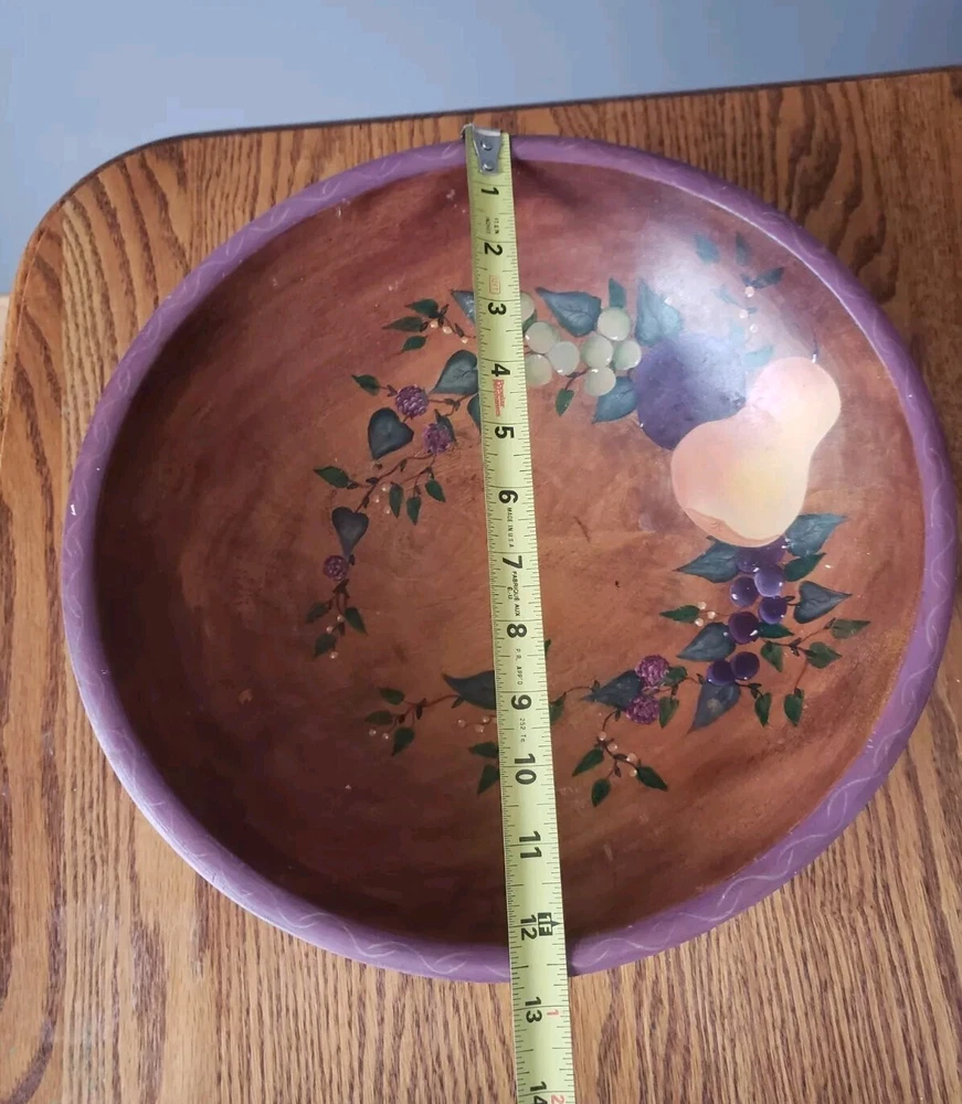This vintage antique serving bowl is a large hand-painted wooden piece with a floral pattern featuring pear and grape characters. With a round oval shape and a diameter of 12" x 13", it stands 4 inches tall and was manufactured in the 1940s. The Folk Craft style bowl, known as the Lg. Wooden Rio Grande, showcases a tan, green, red, and brown color scheme with a glossy finish, making it suitable for all occasions. Ideal for food and drink themes, this original piece adds charm to any kitchen or dining setting. Cube