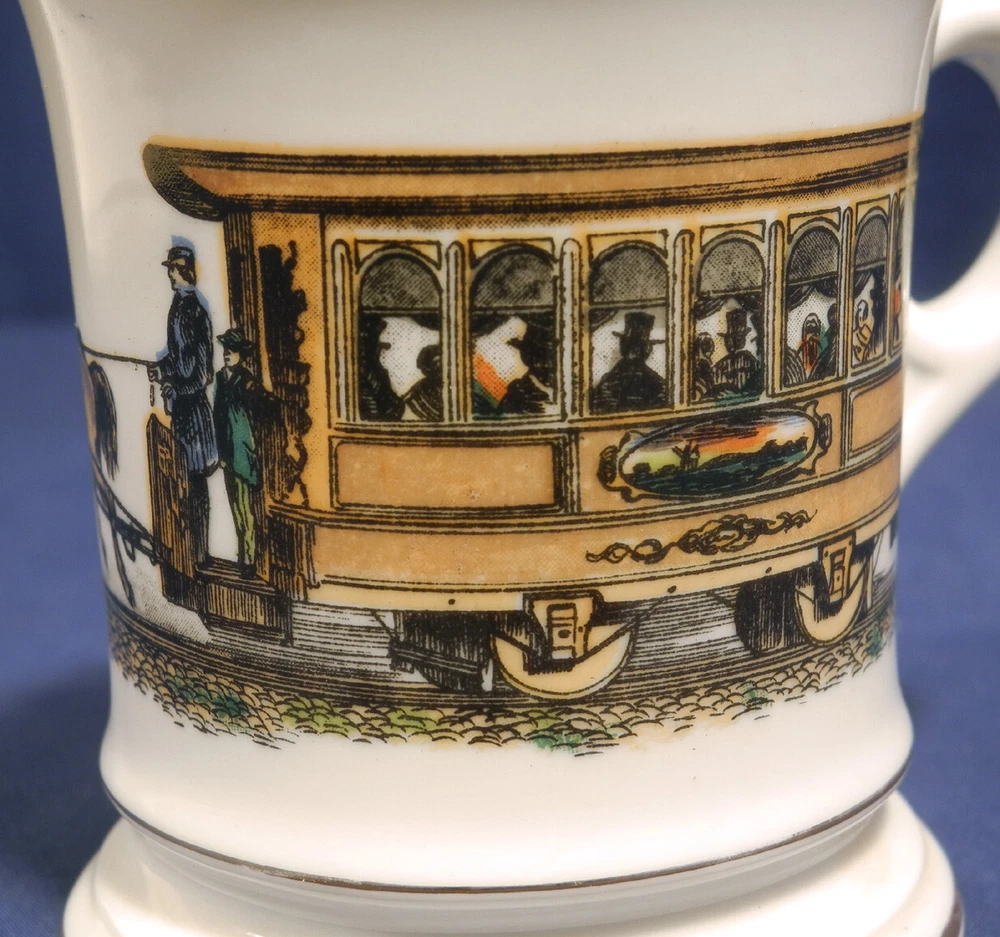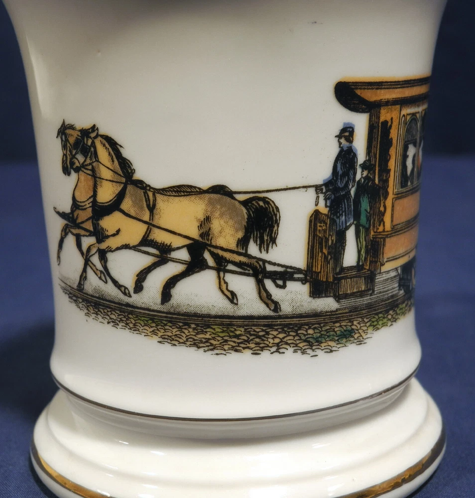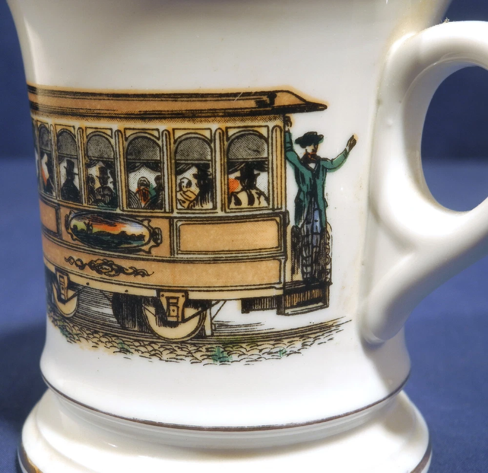 This is for a Vintage Antique Occupational Porcelain Ceramic Shaving Mug with Horse Drawn Trolley Car. Approximately 3-7/8 in. tall, and 3-3/8 in. across at top not counting handle. Great condition, some gold wear, see also pictures. There are no crazing, chips, or cracks. Please see our "Other Sales" for more Antique Shaving Mugs. Buyer to pay $9.00 for shipping and handling for U.S. address. We ship worldwide. International costs to be determined. Please click on 'See Details' for quote. We combine shipping if possible. Please take the time to read the following: Payment should be received within 3 days of purchase. We only ship to the address shown on the paypal payment. Because we are selling fresh items from estates, barns, etc., expect signs of wear and usage appropriate with the age of such items. We usually take multiple photographs of an item. Please check for a second row of photos, they often are there but can be overlooked. Photographs are part of the description and show all that is included. We photograph and accurately describe every item as to its condition and authenticity to the best of our ability. If you have any questions, please let us know. We often have similar items available, so please see our Other Items , or go to our 'ewkauctions' ebay store .