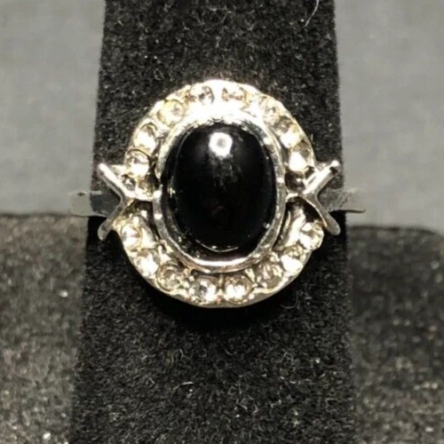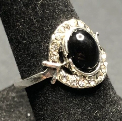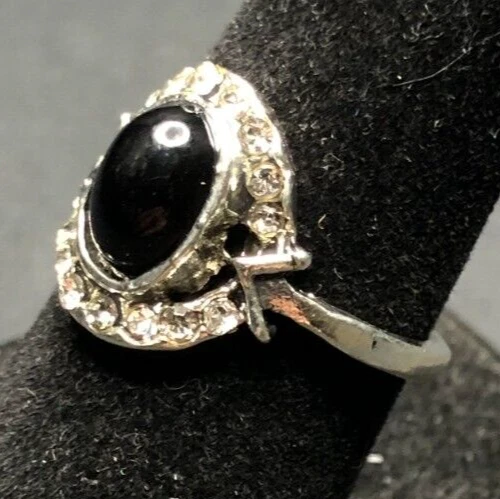 Vintage Antique Silver Tone Black Onyx Rhinestone Ring - Size 5
