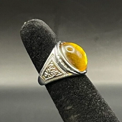 Vintage Antique Silver Tone Rhinestone Baltic Amber Ring - Size 2.5