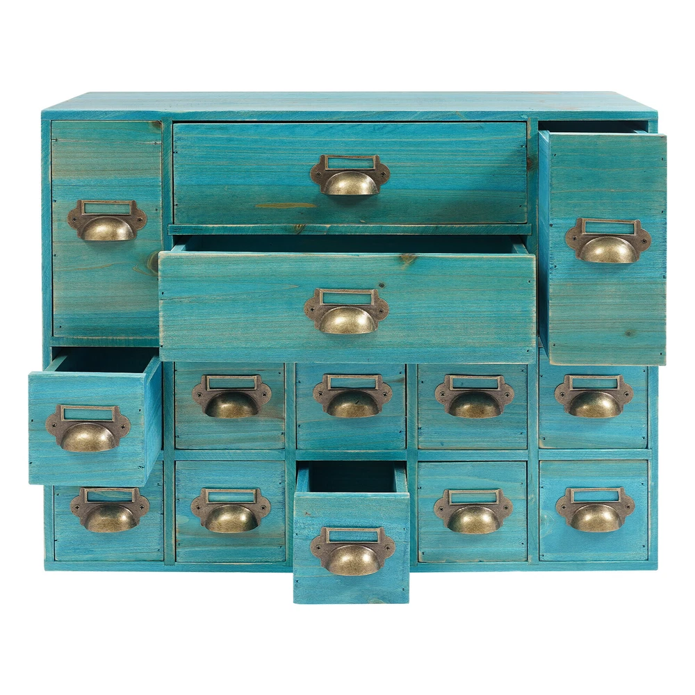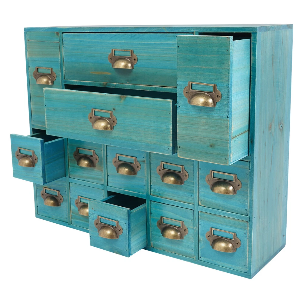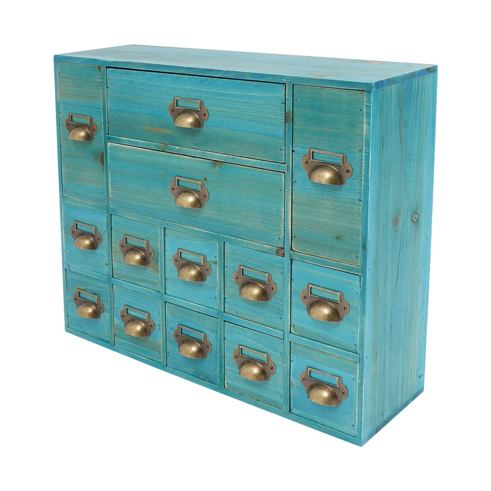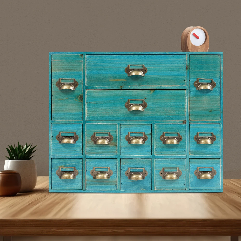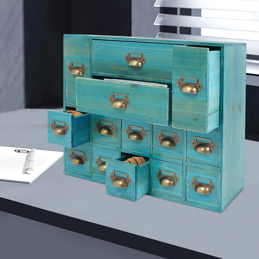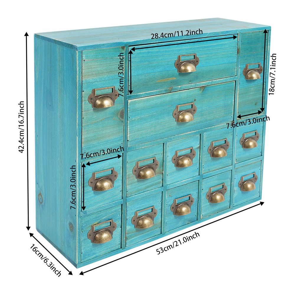 Vintage Apothecary Cabinet Dressers Label Holder Wooden 16 Drawers Organizer Welcom to ristarstore! Description Our storage drawer cabinet is an efficient storage furniture designed for homes, offices, and more. It combines practical design and premium materials and is designed to provide users with a storage solution that is both aesthetically pleasing and practical, helping you to better organize and manage your belongings. Key Features Made to Last: Premium iron and wood materials and exquisite polishing, sanding, and spraying paint processes make this product sturdy, scratch-resistant , Times New Roman-resistant , and not easy to fade and deform, ensuring long-term beauty and practicality. Large Capacity Storage: It provides 14 drawers in 3 different sizes to categorize and store herbs, tea bags, sugar packets, creamers, instant coffee, data cables, staplers, adhesive tapes, and many other small items, which is easy for you to manage. Vintage Style: The product adopts a classic vintage design with retro wood grain and elegant lines, which creates a strong sense of history and cultural atmosphere, adding a touch of sophistication to your home decor. Stable Structure: The rectangular structure increases the contact area with the tabletop, effectively prevents tipping, and ensures the stability of the product. Ready to Use: It does not require assembly, and you can start using it as soon as you receive it, saving time and effort. Effortless Cleaning: It has a smooth surface, a simple structure, and a dustproof drawer design, so you only need to wipe it clean with a towel. Ideal Gift: With excellent durability and practicability, it can be used as an ideal housewarming gift for parents, friends, and lovers so that they can also enjoy a more exquisite and convenient life. Good Customer Service: We aim to provide quality products and services. If you have problems, please feel free to contact us. We will reply and solve the problem for you as soon as possible. Details Practical Handles: They make pulling out drawers smoother and easier for you to access items. Label Frame: Each drawer is equipped with a labeling frame for better classification of herbs or items. Application This product can be used as a Chinese medicine or household medicine organizer, an organizer for various small crafts, a kitchen organizer for tea bags, sugar packets, creamer, instant coffee, etc., a desktop organizer for data cables, staplers, tape, and other small office supplies. Specification Color: Blue Style: Vintage Material: Iron, Wood Process: Polishing, Sanding, Spraying Paint Mounting Type: Free Standing Number of Drawers: 14 Small Drawer Size: 13.5*7.6*7.6cm/5.3*3*3in Middle Drawer Size: 13.5*7.6*18cm/5.3*3*7.1in Large Drawer Size: 28.4*13.5*7.6cm/11.2*5.3*3in Overall Product Size: 53*16*42.4cm/21*6.3*16.7in Package Size: 54*17*43.4cm/21.26*6.69*17.09in Each Drawer Load Capacity: About 3kg/6.6lbs Gross Weight: 3kg/6.6lbs Net Weight: 2.5kg/5.51lbs Package Included 1* Drawers Storage Cabinet Notes Please check the product size carefully before ordering. Please allow the slight color difference caused by the shooting light and 1-3cm error due to manual measurement, and make sure you do not mind before ordering. Payment Delivery details Terms of sales About us Contact us Payment We accept ebay payment 。 Fees such as import duties, taxes are not included in the item price or shipping costs. These charges are the buyer's responsibility. Delivery details Shipping: 2-9 working days to: USA Terms of sales We maintain high standards of excellence and strive for hundred percent customer satisfaction. Feedback is very important to us. We hope that you contact us immediately before you give neutral or negative feedback, so that we can address your concerns. It is impossible to address issues if we do not know about them! About us Your satis faction is our ultimate goal. We work hard to earn your trust and future business. Our certified technicians have tested each item before shipping. The unit comes with 1 year limited warranty on all manufacturing defects. a) If you receive a defective item, you may return it or ask for a discount. Please contact us within 14 days after you receive the package. b) What you returned must be intact and in its original packaging as re? u. Customer is responsible for shipping costs of the returned item. c) We will cover the cost of shipping back t with the shipping rate indicated in the registration page. We will send you a new unit or refund the full payment you paid. Thank you. Contact us Business Hour Business Hour: Monday To Friday: 8:30 AM to 5:00 PM (Beijing China time) Due to time zones, our reply to your questions may not be immediately. But within above working time, we will reply your email within 24 hours. If it's non-workdays, please kindly be patient and wait till Monday. Please contact us with ebay message. Please feel free to contact us if you have any questions. Monday To Friday: 8:30 AM to 5:00 PM (Beijing China time) Due to time zones, our reply to your questions may not be immediately. But within above working time, we will reply your email within 24 hours. If it's non-workdays, please kindly be patient and wait till Monday. Please contact us with ebay message. Please feel free to contact us if you have any questions. Brand Unbranded Item Height 16.7in Item Length 21in Item Width 6.3in Type Storage Cabinet Material wood Color Blue Number of Shelves 4 Mounting Free Standing