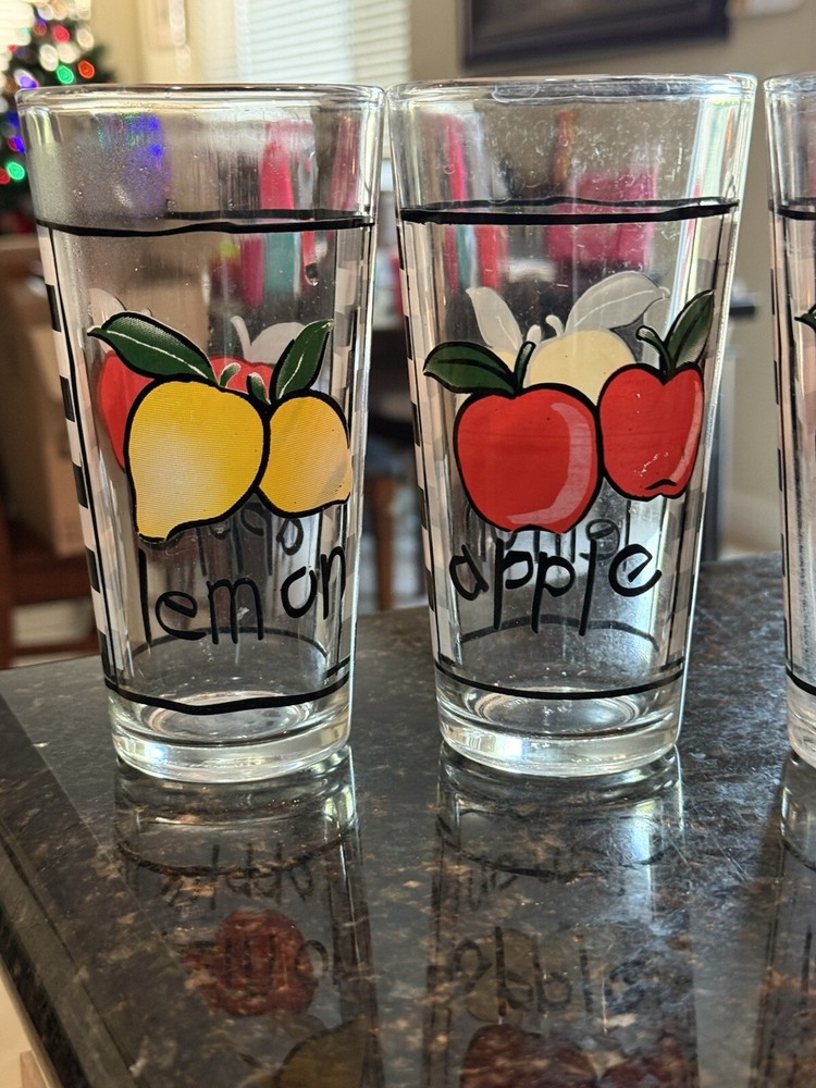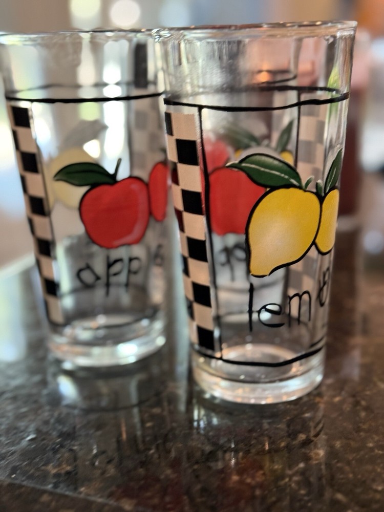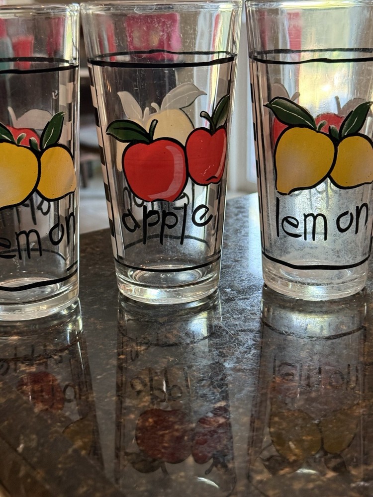 This is a set of 3 vintage tumbler glasses featuring an apple pattern. The glasses are round in shape, clear in color, and made of glass. Each tumbler has a diameter of 3 1/8 inches and a height of 5 1/8 inches, holding 2 cups to the rim. They have a retro style with a black and white checked design, making them suitable for all occasions. The brand is unmarked, and they can be cleaned by hand or dishwasher.