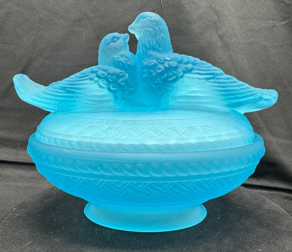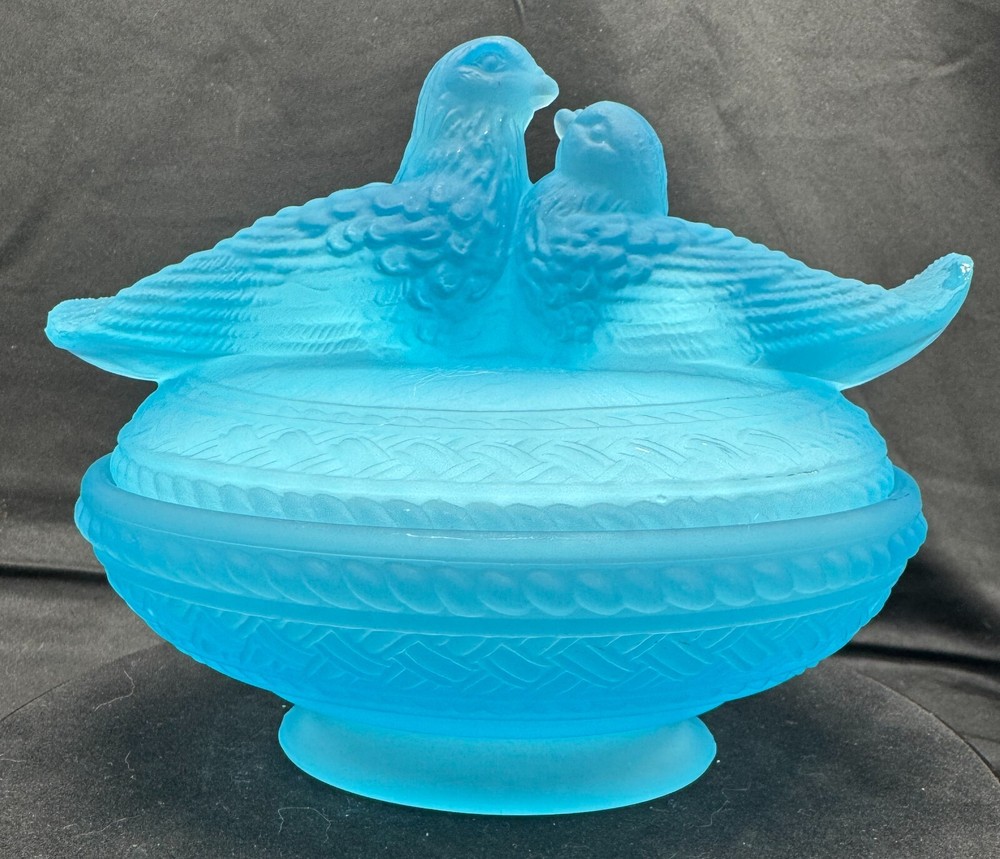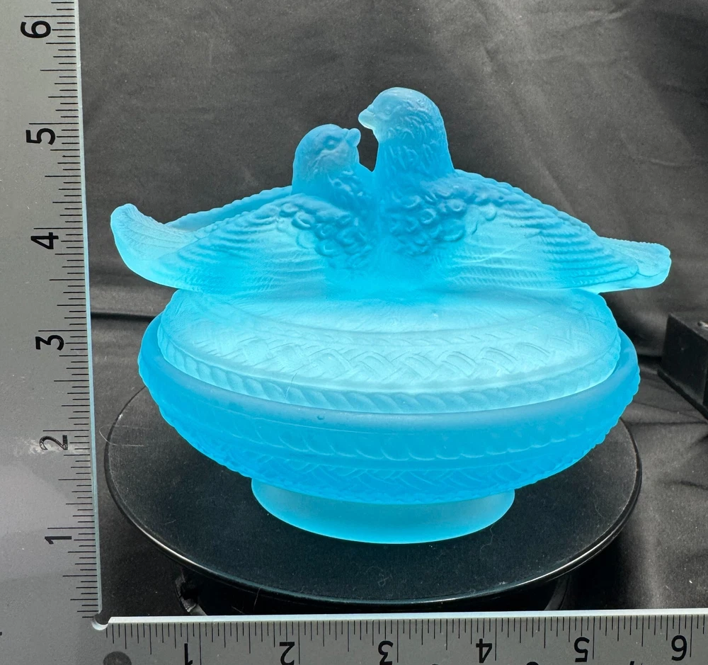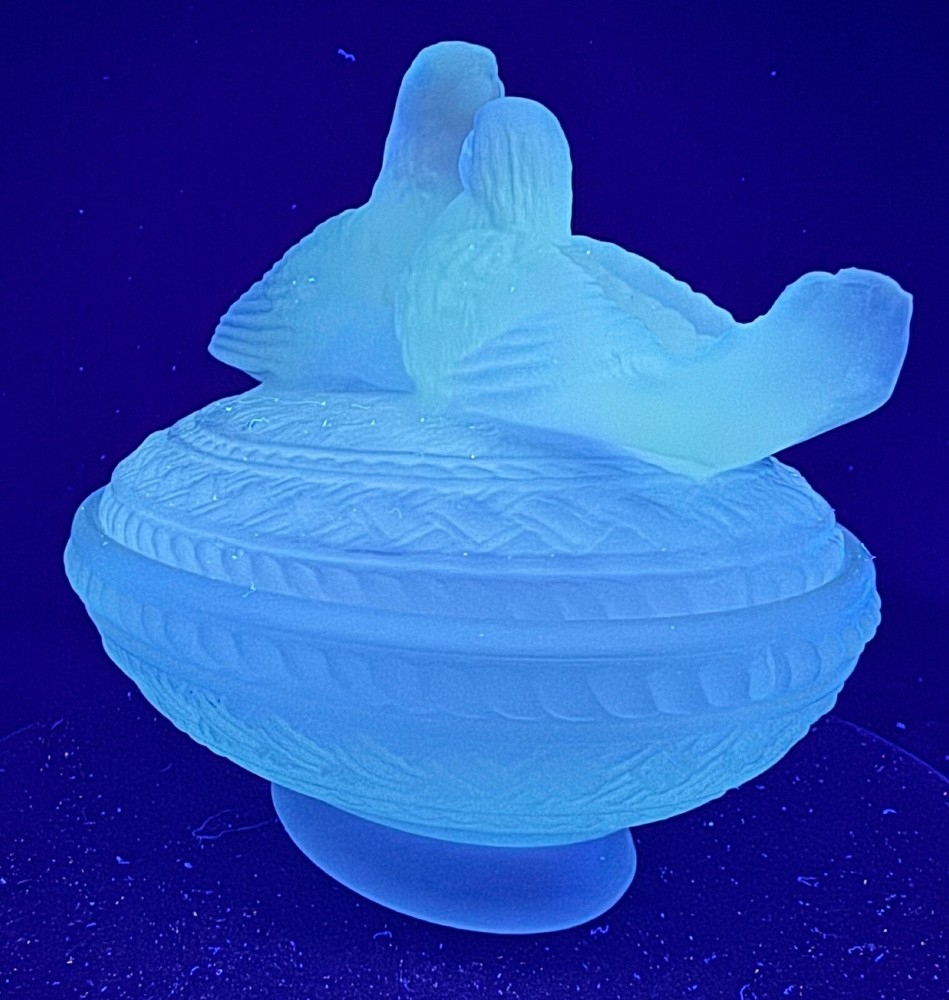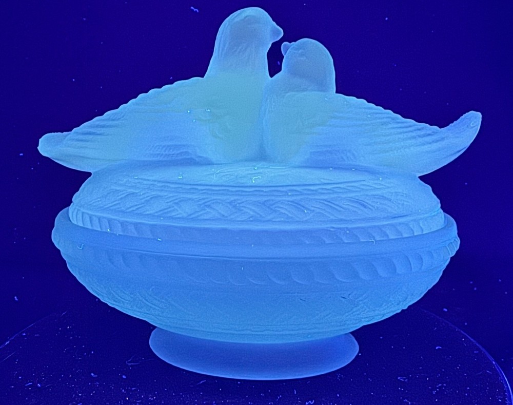 Vintage Aqua Blue Manganese Glass Westmoreland Satin Glass Doves on Nest This glows ghostly green under 365 wavelength black lights. This is due to the manganese used in the manufacturing of the glass. Does not glow under 395 wavelength light.