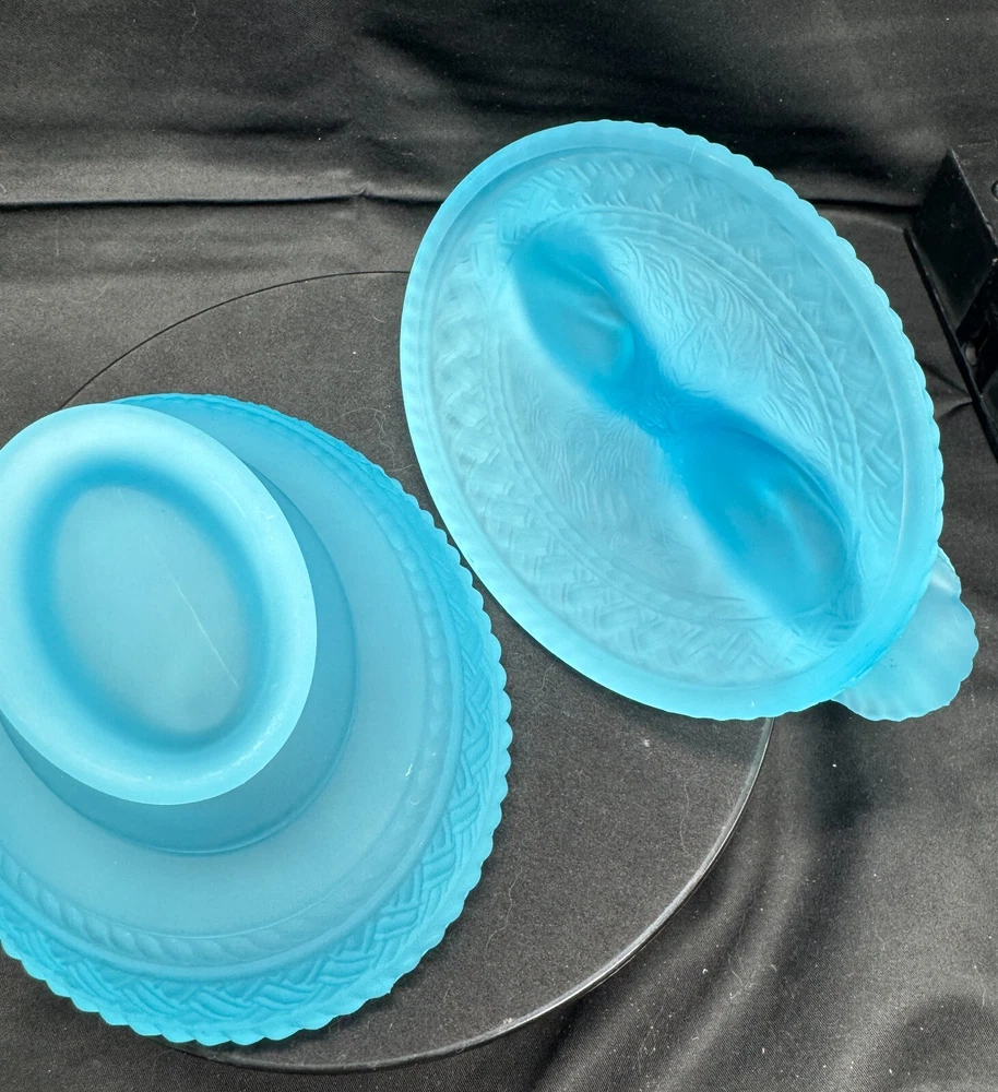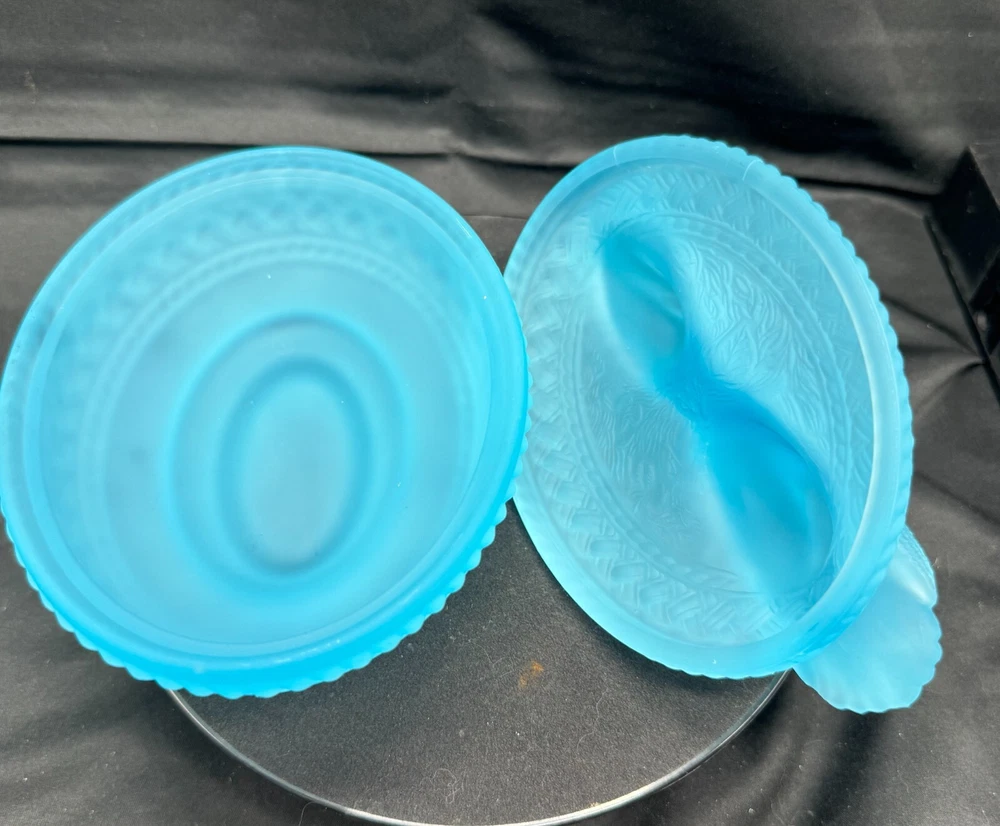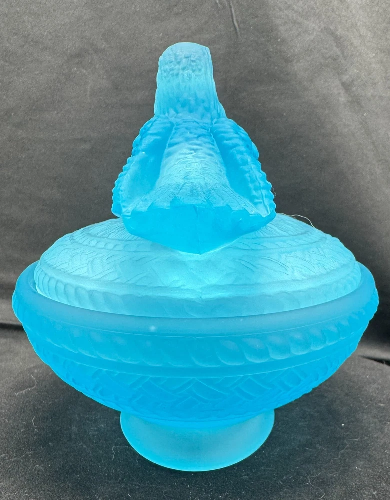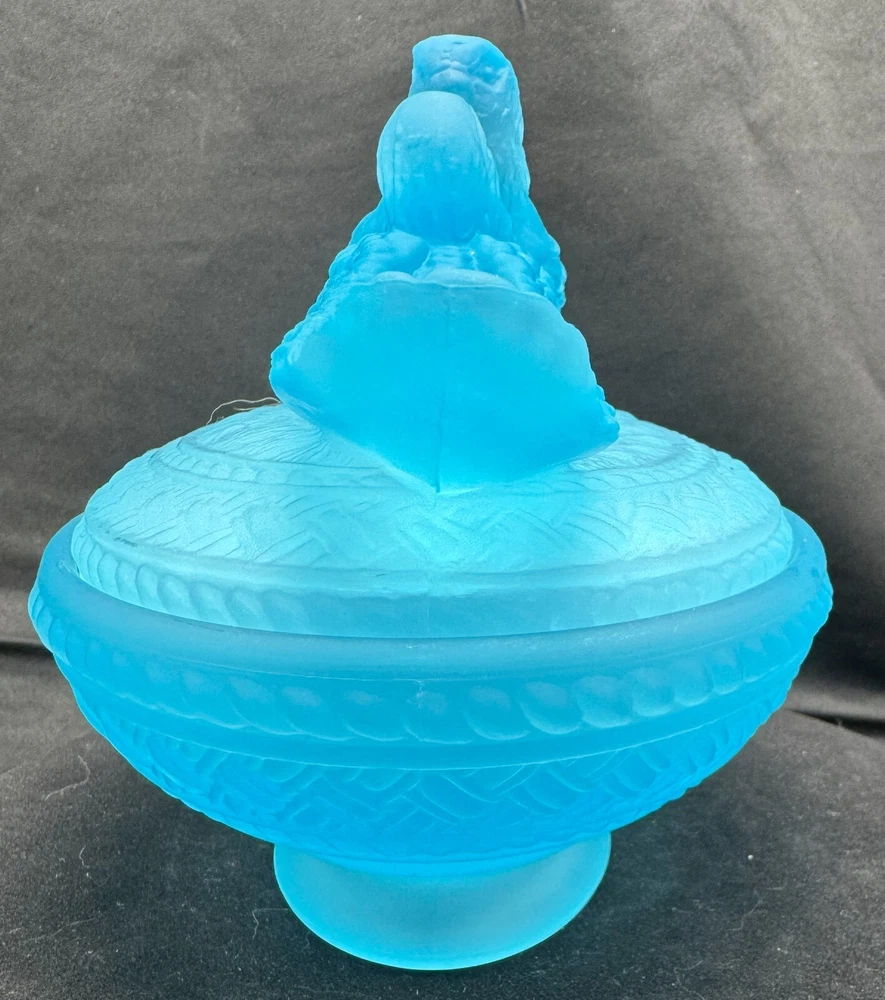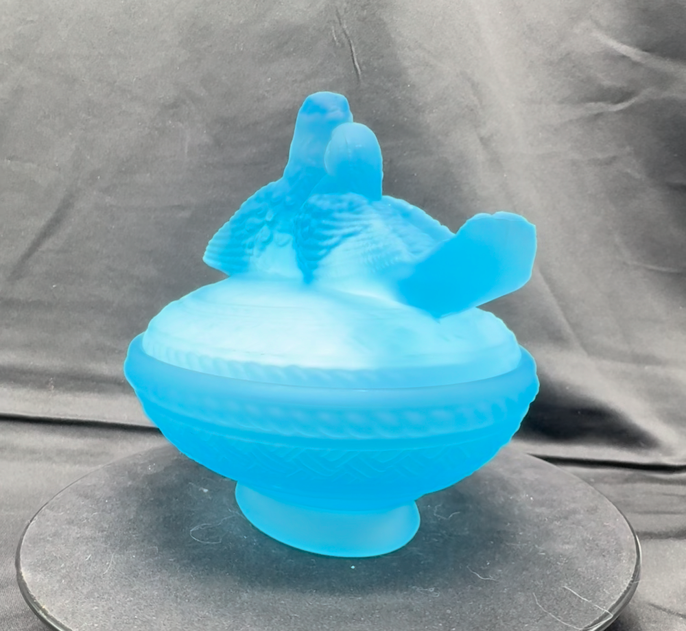 Vintage Aqua Blue Manganese Glass Westmoreland Satin Glass Doves on Nest This glows ghostly green under 365 wavelength black lights. This is due to the manganese used in the manufacturing of the glass. Does not glow under 395 wavelength light.