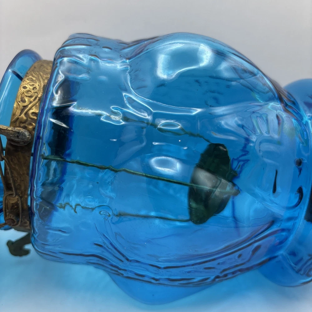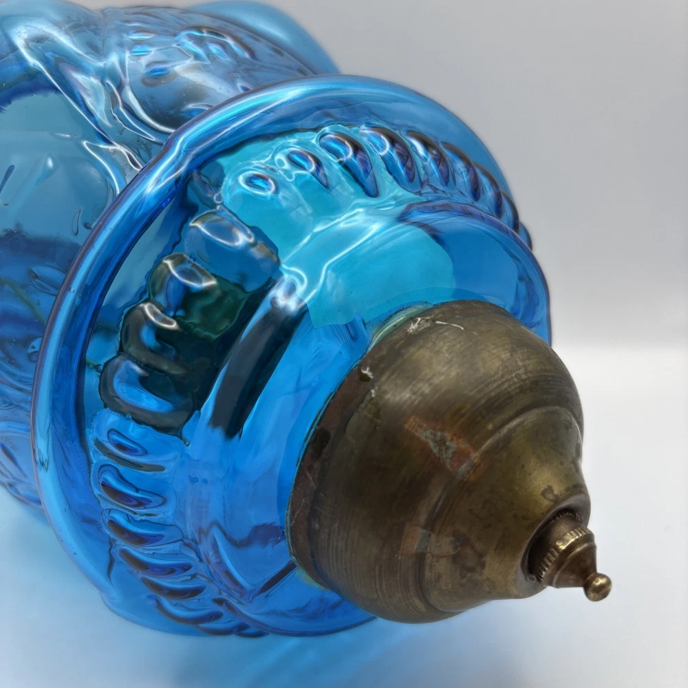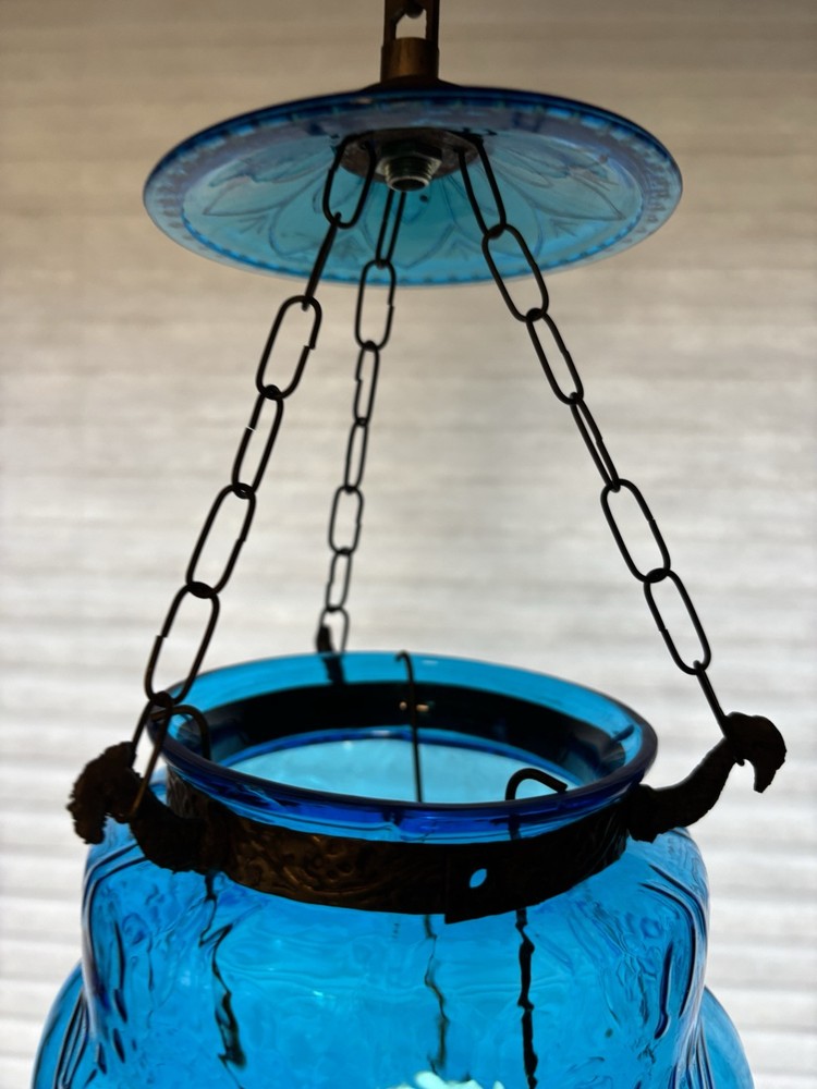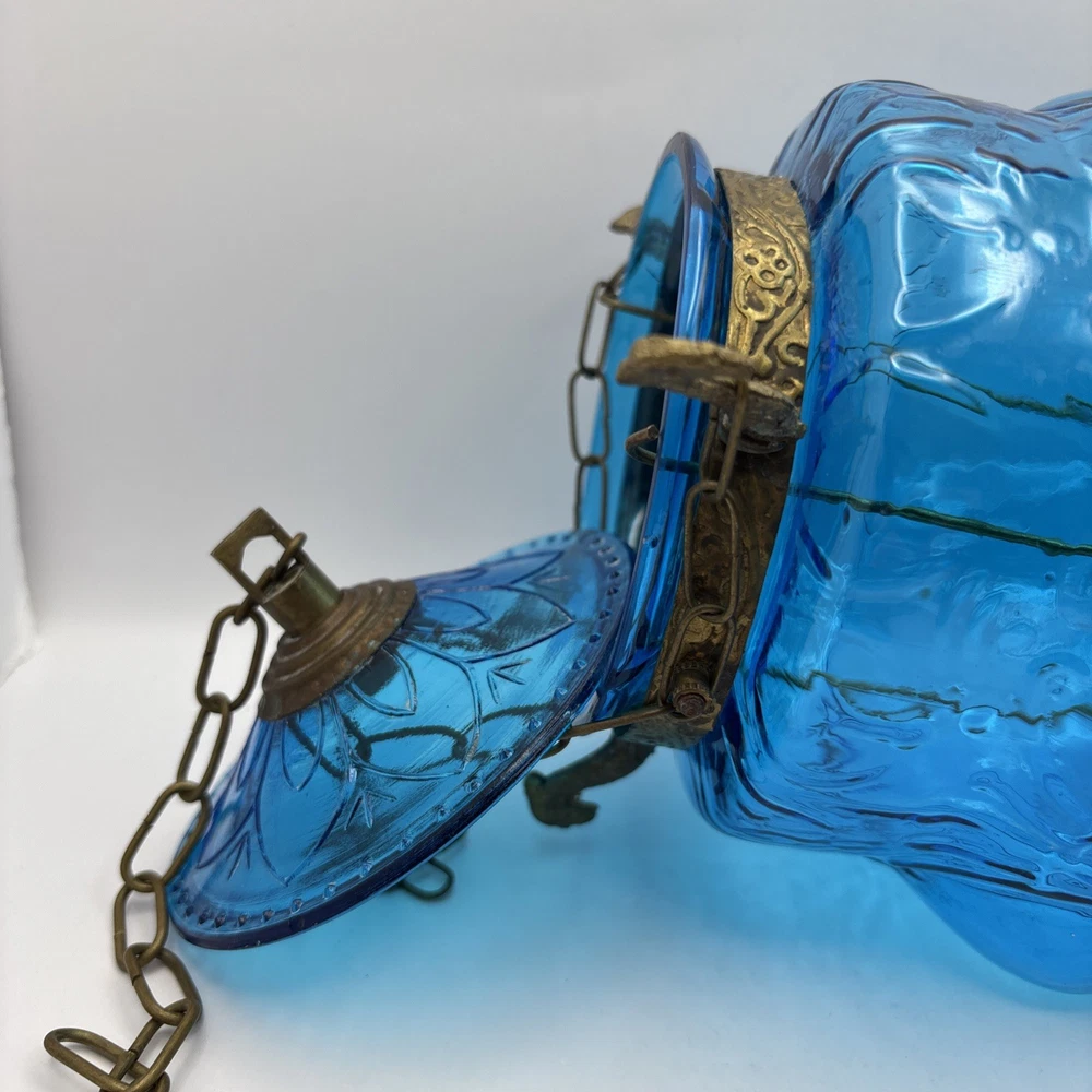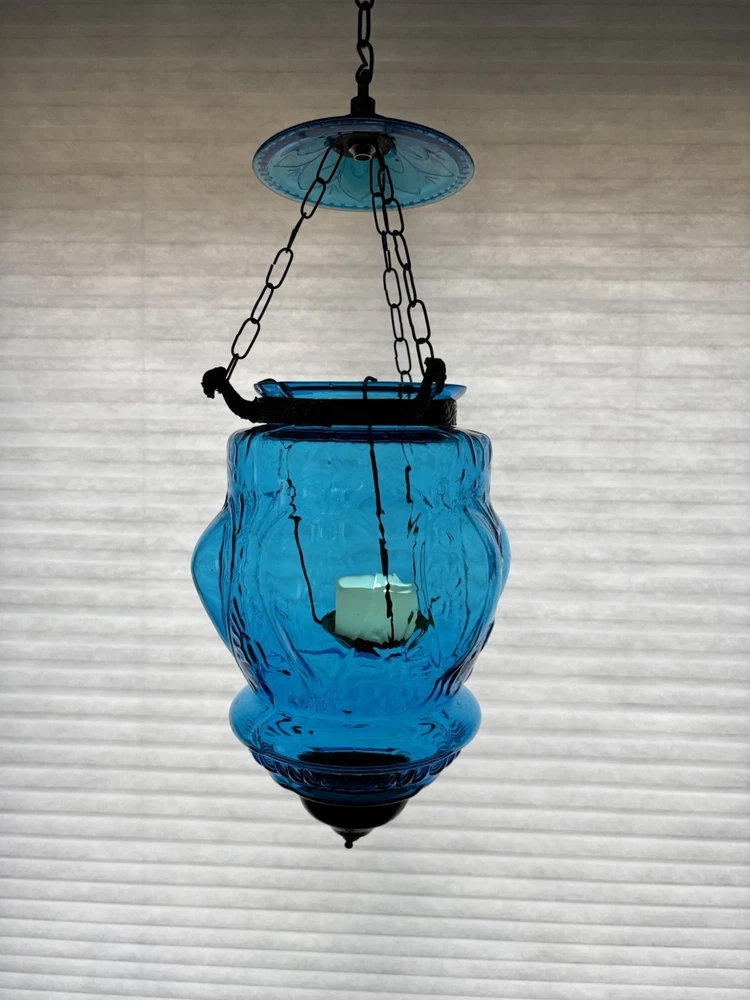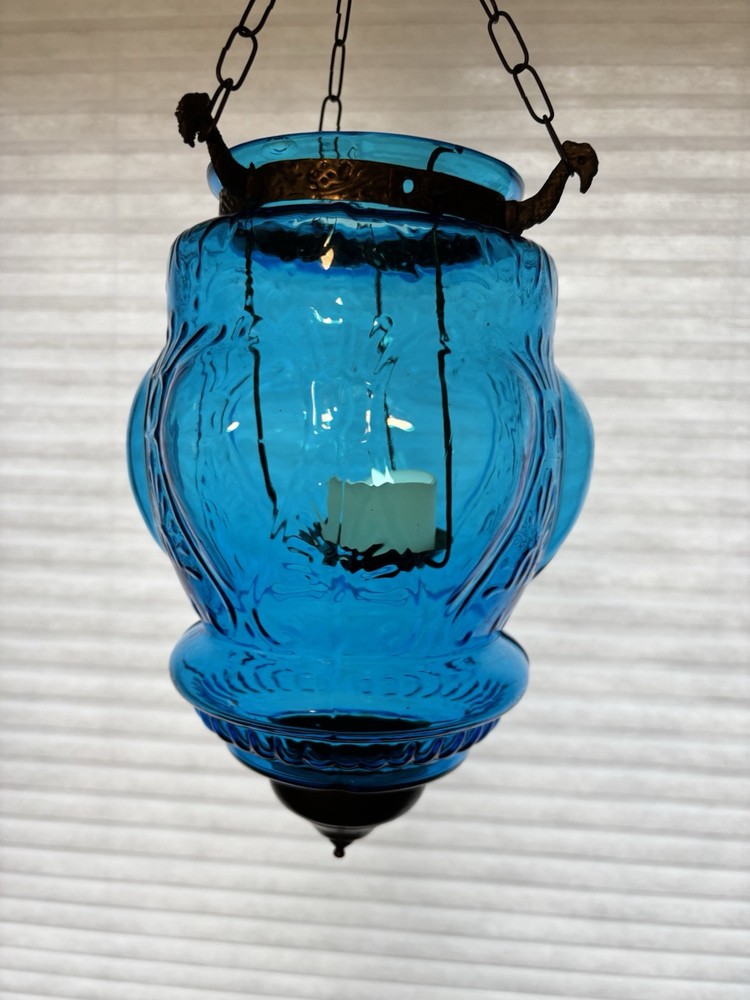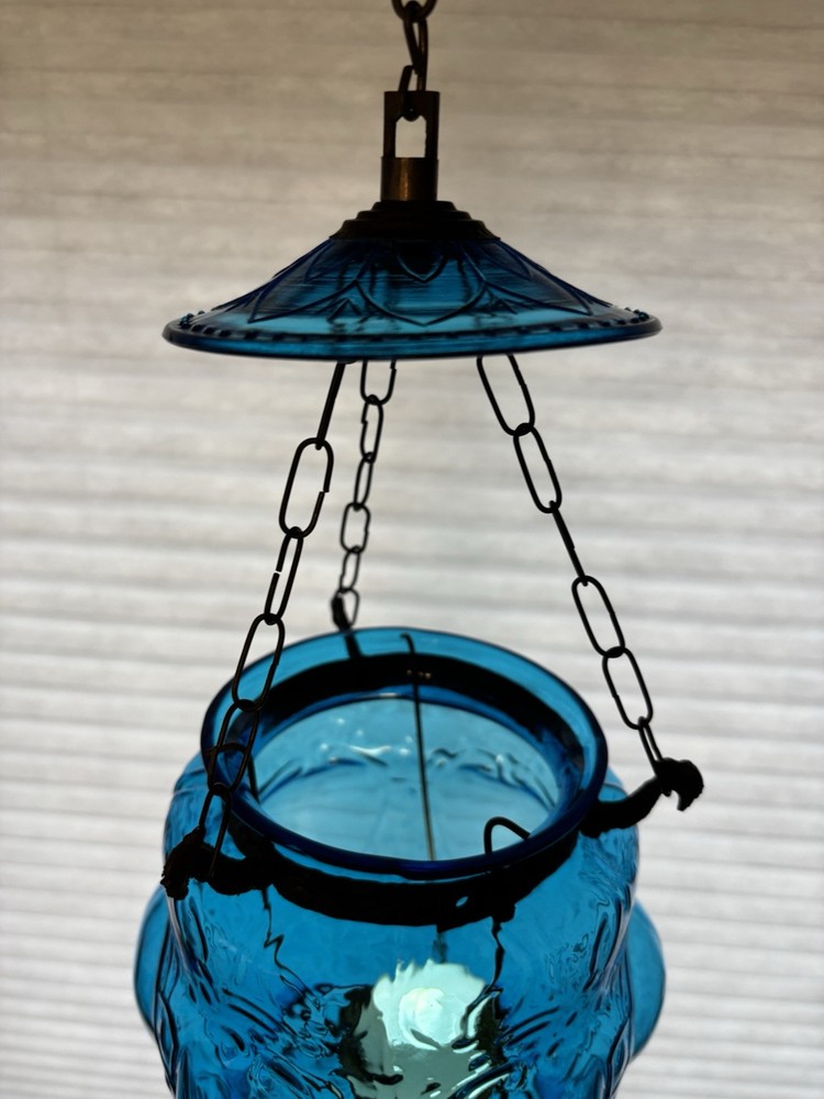 This is an old glass and metal hanging tea light holder in a pretty aqua . Metal tea light holder has some rust. There is a Metal band around top as well as metal bottom with tiny finial. Item is in very nice vintage condition with no chips or cracks detected. The aqua color is unique. Item will be double boxed for shipping. This item measures about 14 inches not including very top chain links.