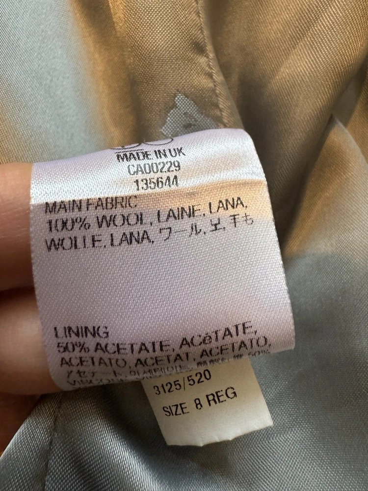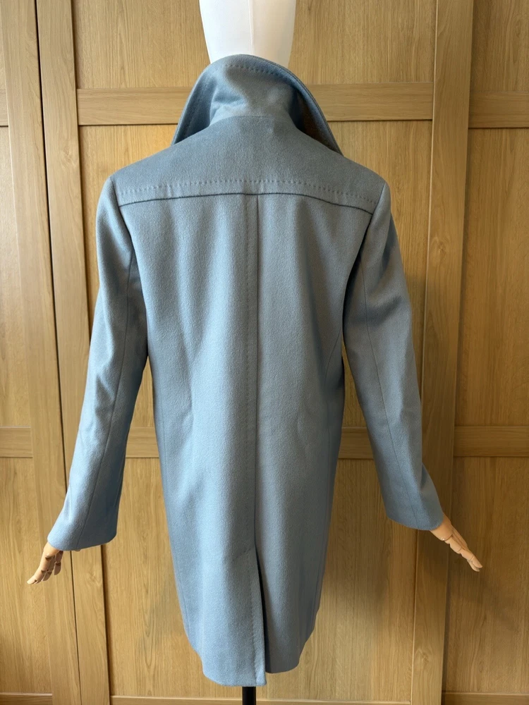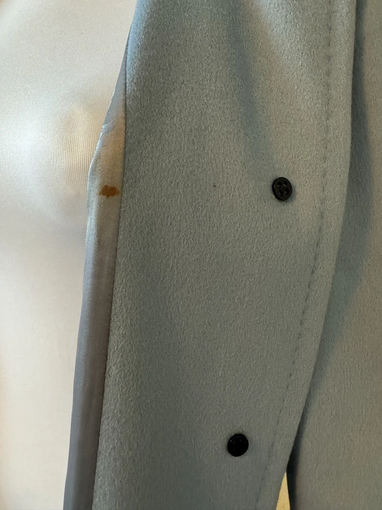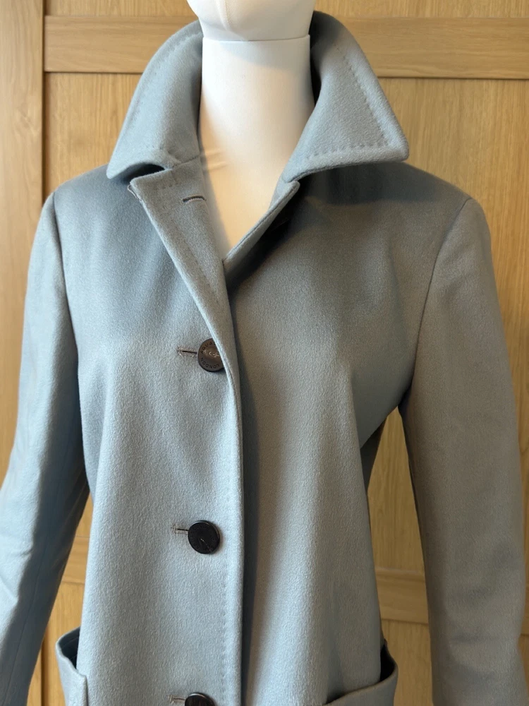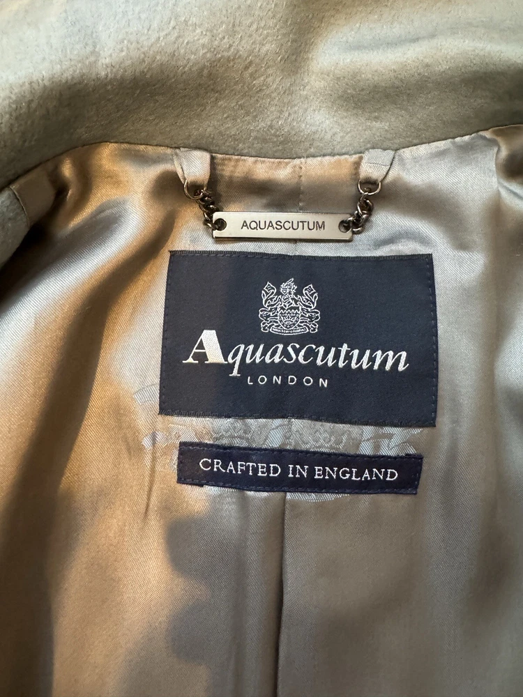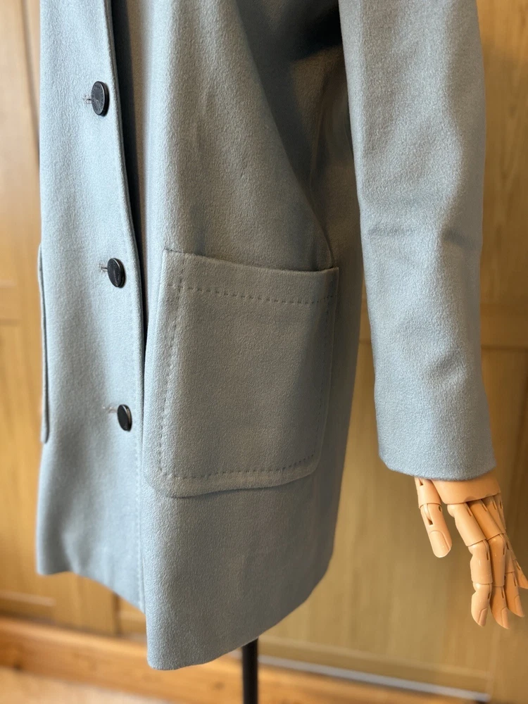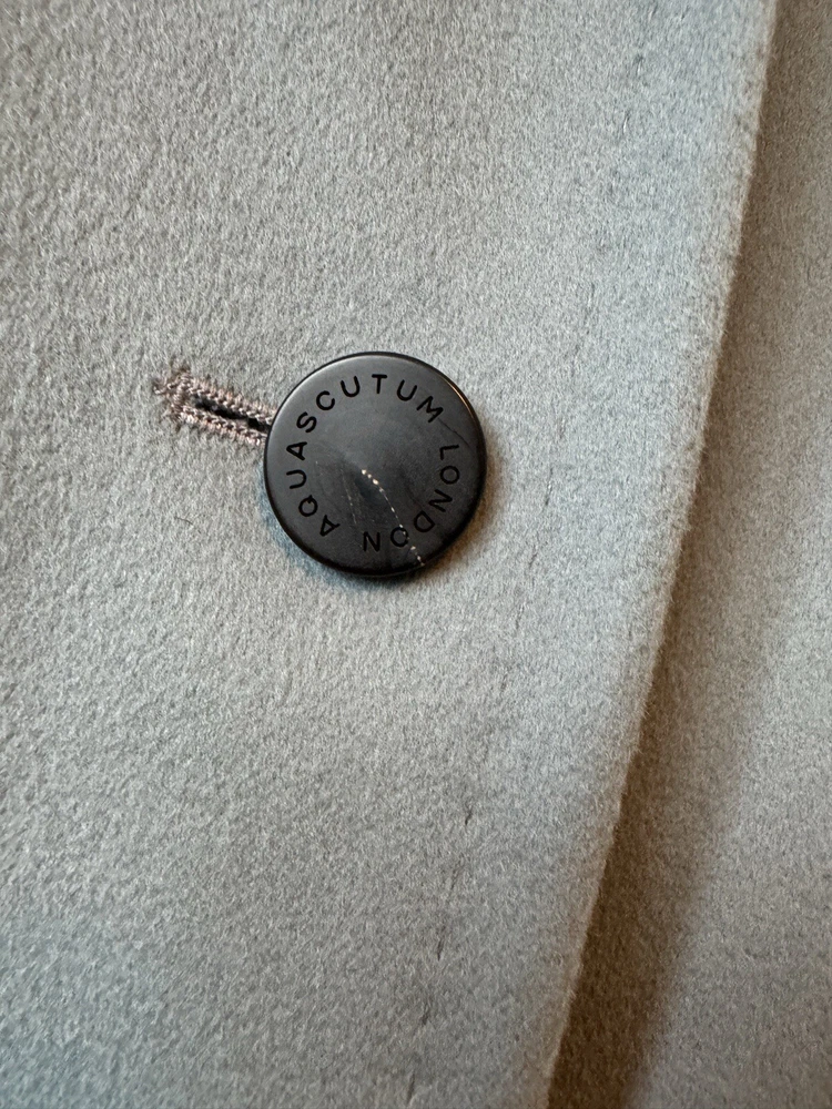 Add a touch of vintage to your wardrobe with this gorgeous Aquascutum pea coat. Made of 100% wool in a stunning duck egg blue colour, this single-breasted coat features a button closure, collared neckline, and long sleeves with shoulder pads. It also has front pockets and a back slit for added comfort and style. The 3/4 length coat is perfect for winter and spring occasions, whether you're travelling or going to work. The coat is fully lined with acetate, ensuring a comfortable and warm fit. It's a classic piece that will never go out of style, perfect for those who love the vintage look. This coat is a UK size 8 Uk. Tiny wear on the right shoulder & mark on the lining (see pictures for reference) overall good vintage condition