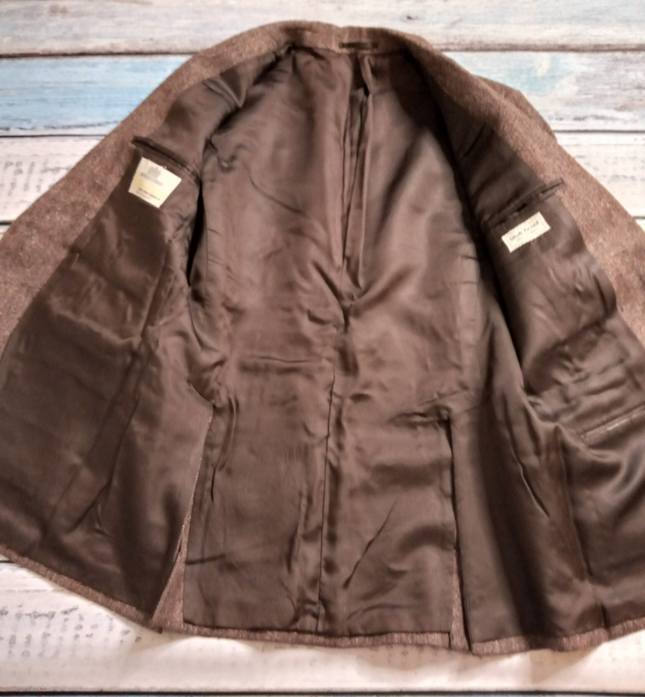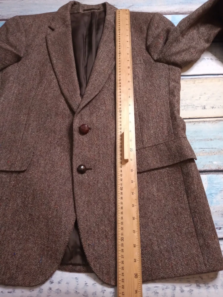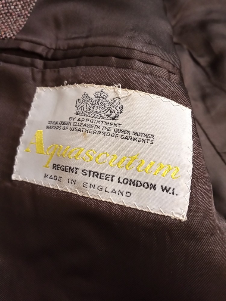 Material: Wool Type: Jacket Outer Shell Material: Wool Style: Blazer Brand: Aquascutum Fabric Type: Tweed Country of Origin: United Kingdom Colour: Brown sleeve length: Long Closure: Button Department: Men's Vintage: Yes Chest Size: 40 Lining Material: Viscose Size: 40