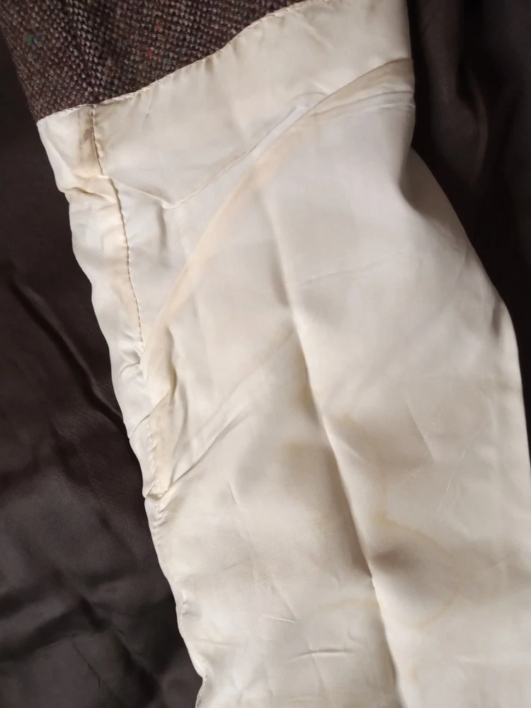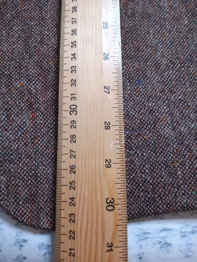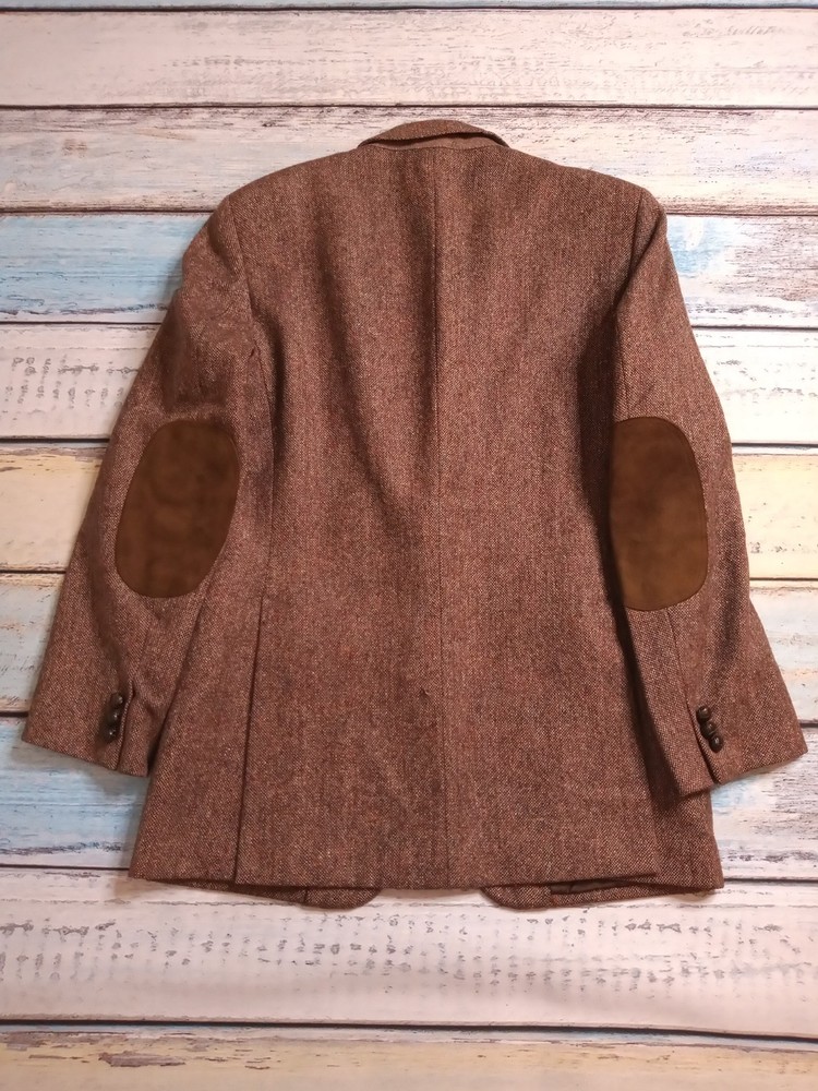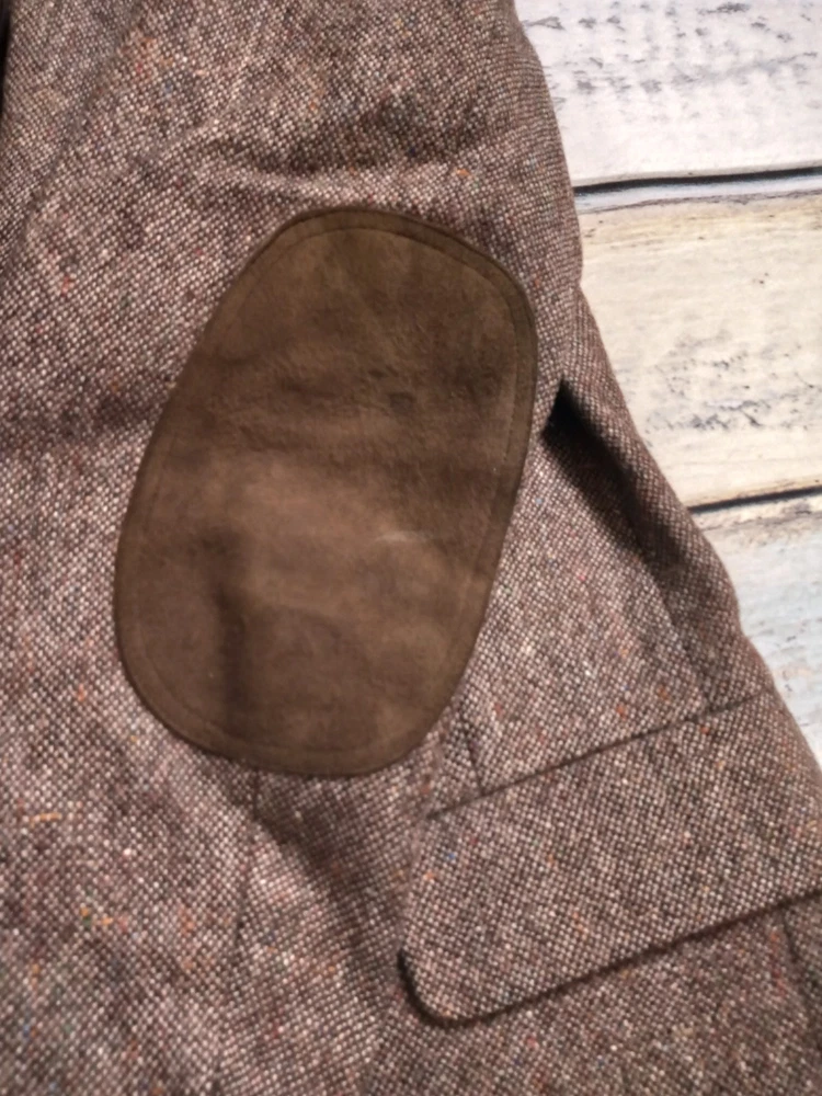 Aquascutum Irish Tweed Blazer 100% Pure New Wool Size 40R Made in England Classic British tailoring with suede elbow patches, Royal Warrant prestige & richly flecked Irish tweed A beautifully made Aquascutum blazer in rich brown Irish tweed, crafted from 100% pure new wool. The brown features a multicoloured flecked weave — with hints of red, blue, green — giving it depth and character. Includes suede elbow patches, and a Royal Warrant label issued by appointment to H.M. Queen Elizabeth The Queen Mother. Ideal for autumn/winter layering, heritage styling, or vintage collectors. Item Details: Brand: Aquascutum, Regent Street London Size: 40 Regular (40R) Item Details: Brand: Aquascutum, Regent Street London Size: 40 Regular (40R) Fabric: Outer: 100% pure new wool — traditional Irish tweed with multicoloured flecks Lining: 100% viscose Colour: Brown with red, blue, green flecks Features: Suede elbow patches (both sleeves) Two-button front (note: buttons do not match) Two front flap pockets Three inner pockets Buttoned cuffs Double rear vents for ease of movement Fully lined interior Royal Warrant label Measurements (taken flat) approx : Pit to pit: approx. 20.5 inches (52 cm) Length (shoulder to hem): approx. 30.5 inches (77.5 cm) Sleeve (pit to cuff) : just over 16 inches (approx. 41 cm) Sleeves are slightly shorter than modern standard — best suited to a tailored fit or layering over slim knits. Condition: Outer: Good vintage condition : Two small holes Non-matching front buttons Light fraying to the edge of one suede elbow patch Light marks to the other patch Lining: Cream viscose lining in the arms shows visible staining and age-related wear. Please see all photos as they form part of the description