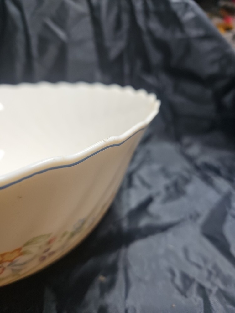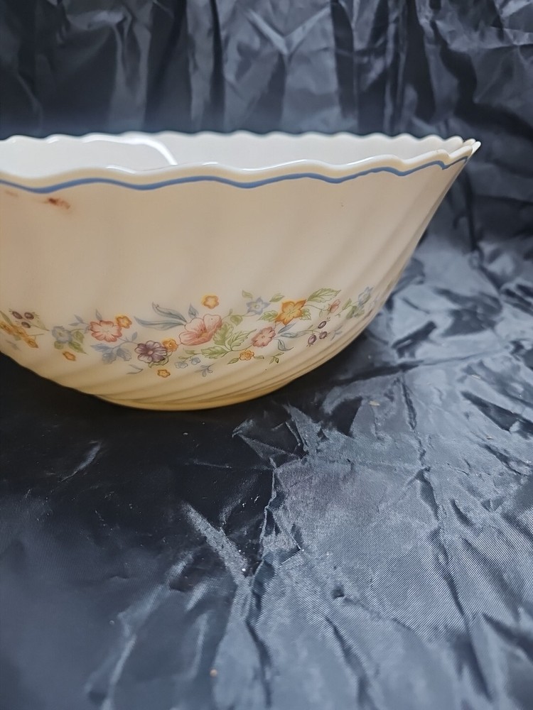 This is a vintage Arcopal France mixing/serving bowl in a large size, featuring a scalloped edge and a floral pattern called Victoria. The bowl is made of glass and is designed for serving purposes. It is an elegant and charming piece of decorative cookware and dinnerware from France.