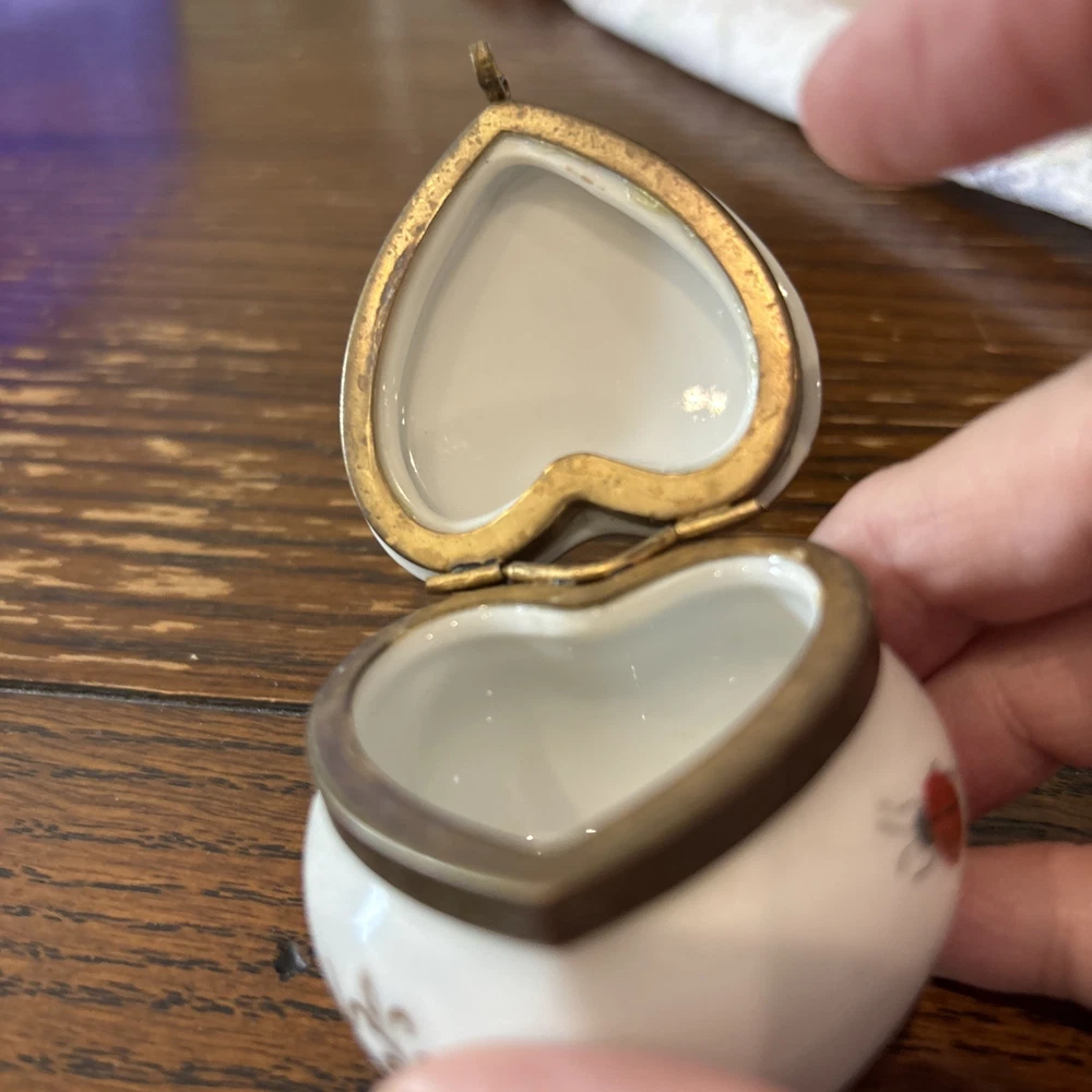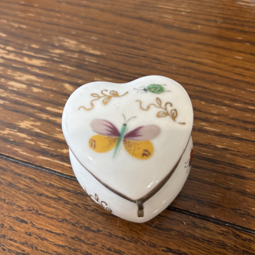 This vintage Ardalt Japan heart-shaped porcelain trinket pill box with a hinged lid features a multicolor glossy finish, making it a unique and charming decorative collectible. Manufactured between 1970-1979 in Japan, this trinket box is adorned with a heart pattern and a subject of a butterfly, adding a touch of elegance and nostalgia to any space. Perfect for storing small treasures or jewelry, this collectible piece is a lovely addition to any collection or home decor.
