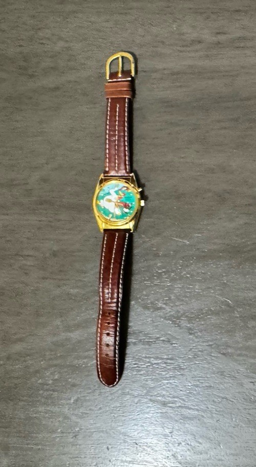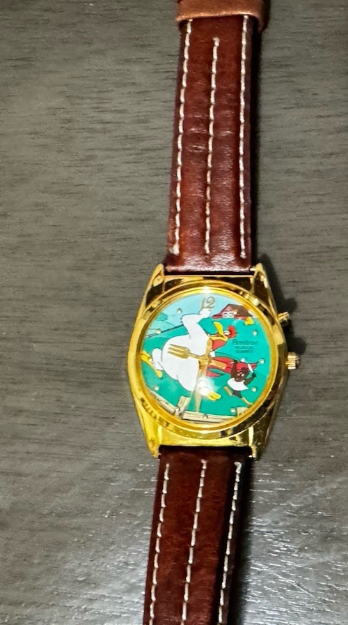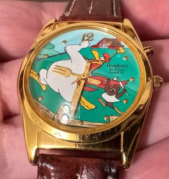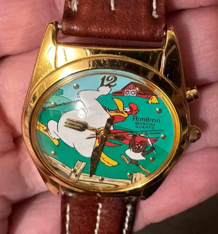 A charming vintage Armitron Looney Tunes watch featuring Foghorn Leghorn in a farm scene. The hour hand is a fork and the minute hand a knife, adding playful character. Musical function and quartz movement both working. Light wear consistent with age.